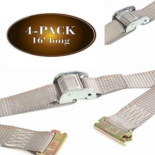 Four 2" x 16' E Track Strap, Durable Cam Buckle Cargo Tiedown, Heavy Duty Grey Polyester Tie-Down Cam Strap, ETrack Spring Fittings, Tie Down - Megean