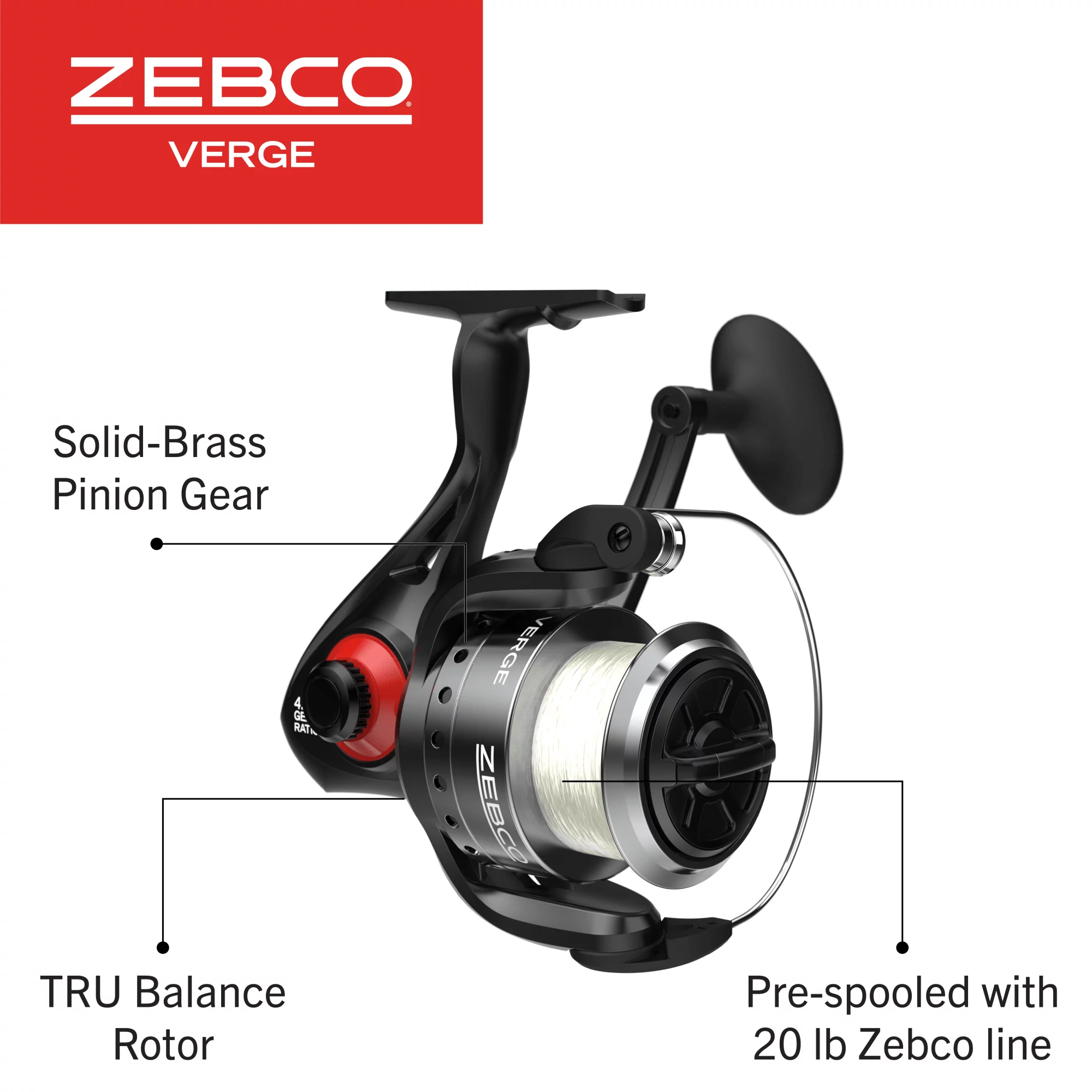 Zebco Verge Spinning Fishing Reel, Size 30 Reel, Changeable Right- or Left-Hand Retrieve, Pre-Spooled with 10-Pound Zebco Fishing Line, All-Metal Gears, TRU Balance Rotor, Black