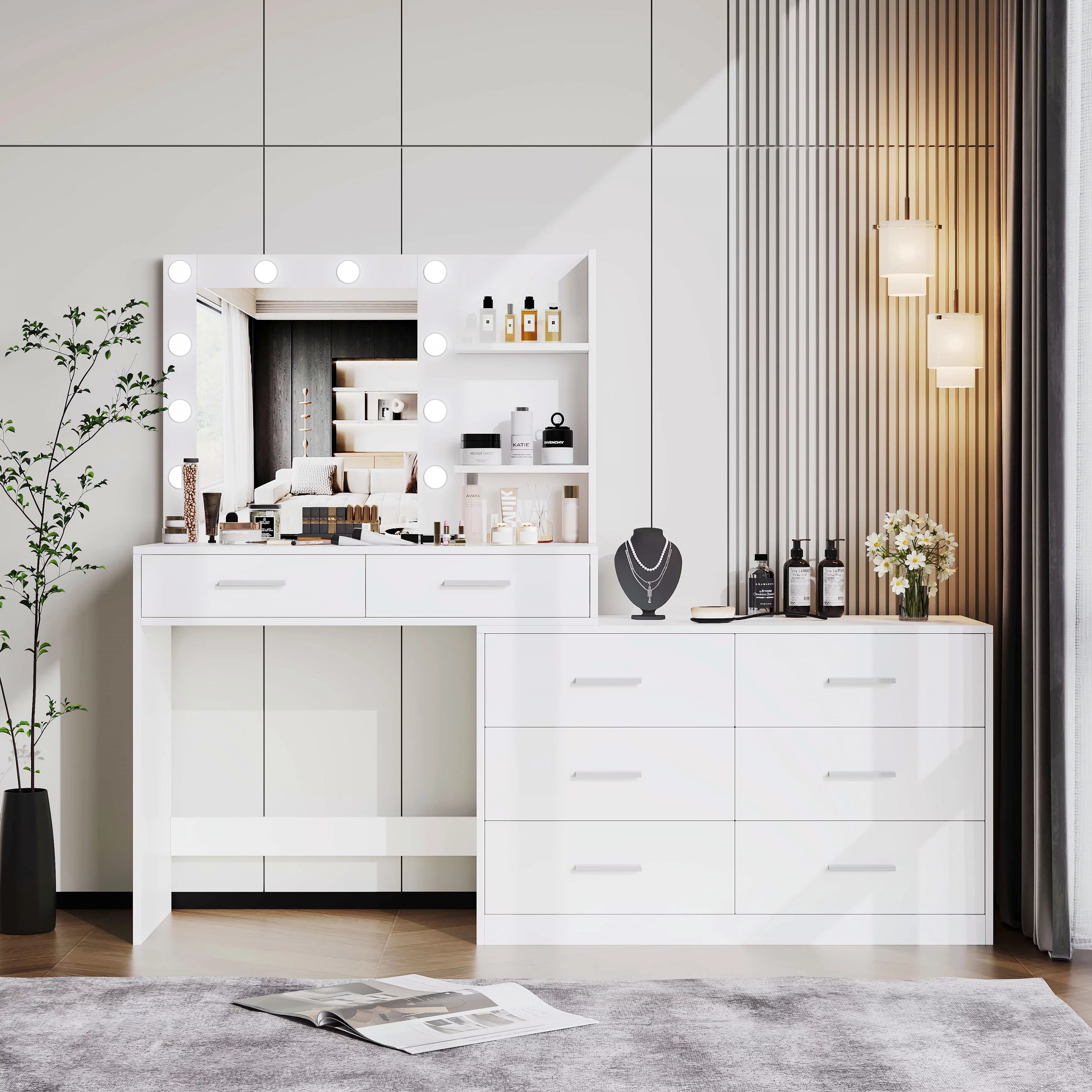 Rovaurx 65" W Makeup Vanity Desk with Mirror and 3-Color Lights, 8 Drawers Vanity Table with Side Storage Shelf, Bedroom Dressing Table, Adjustable Width, White - Curated Treasures Market