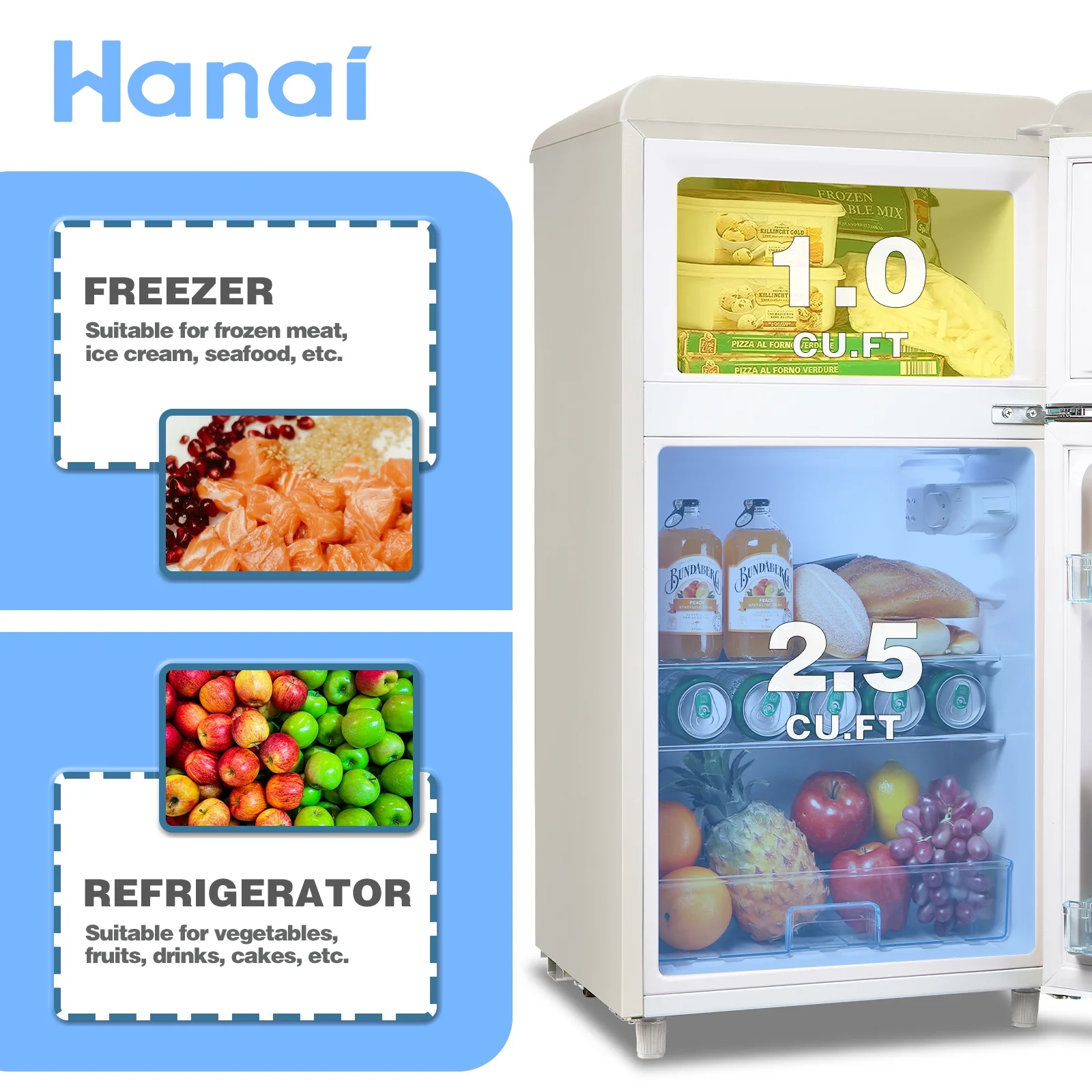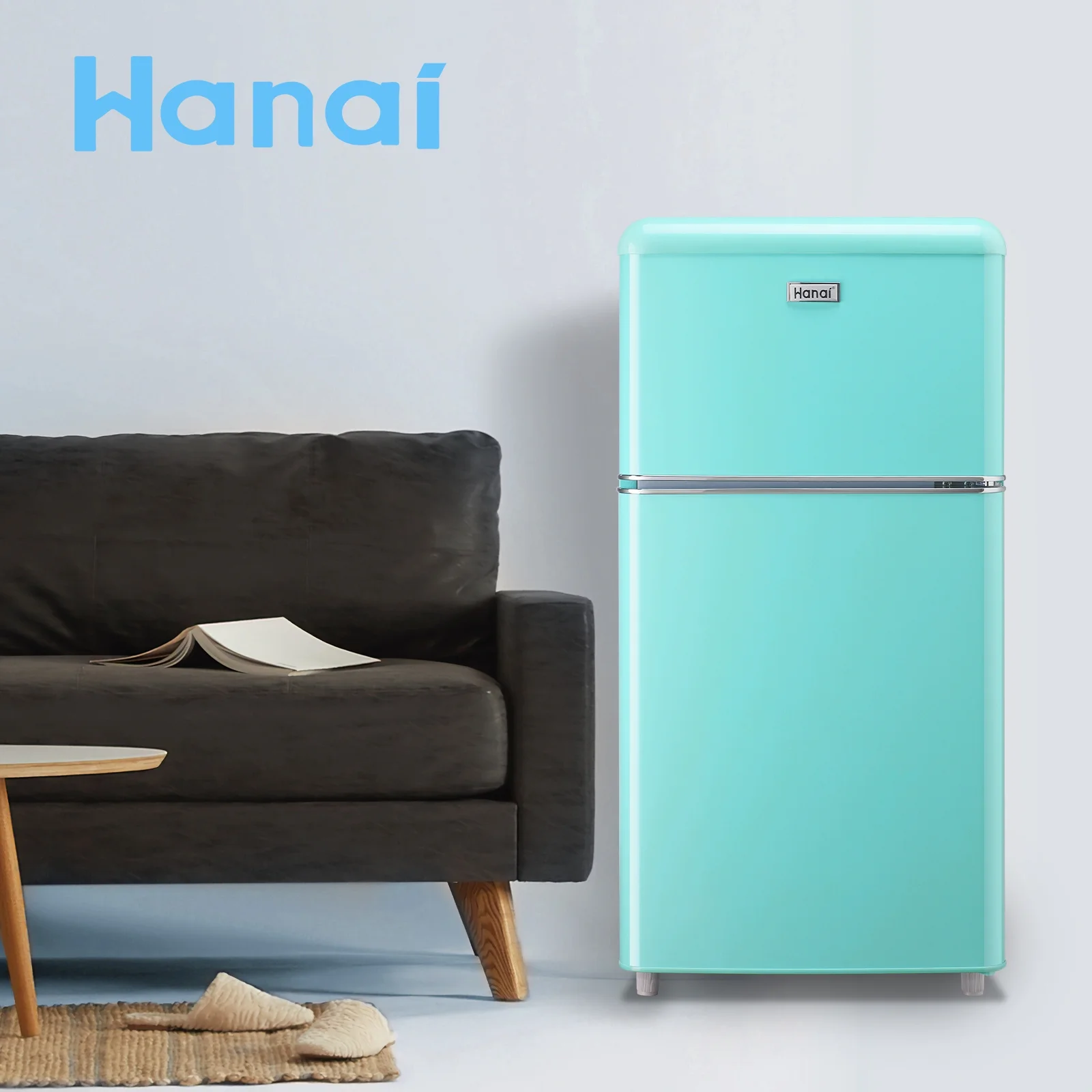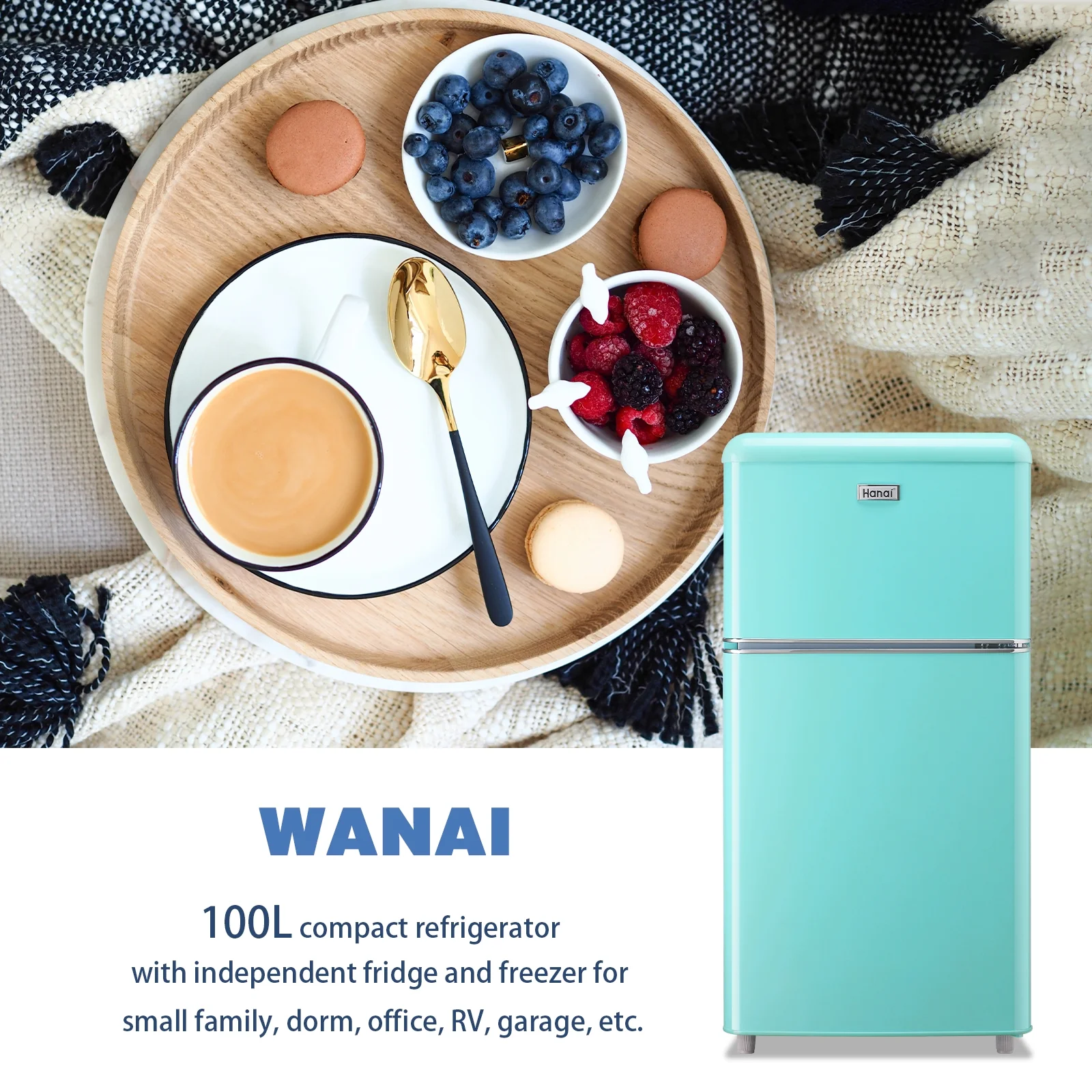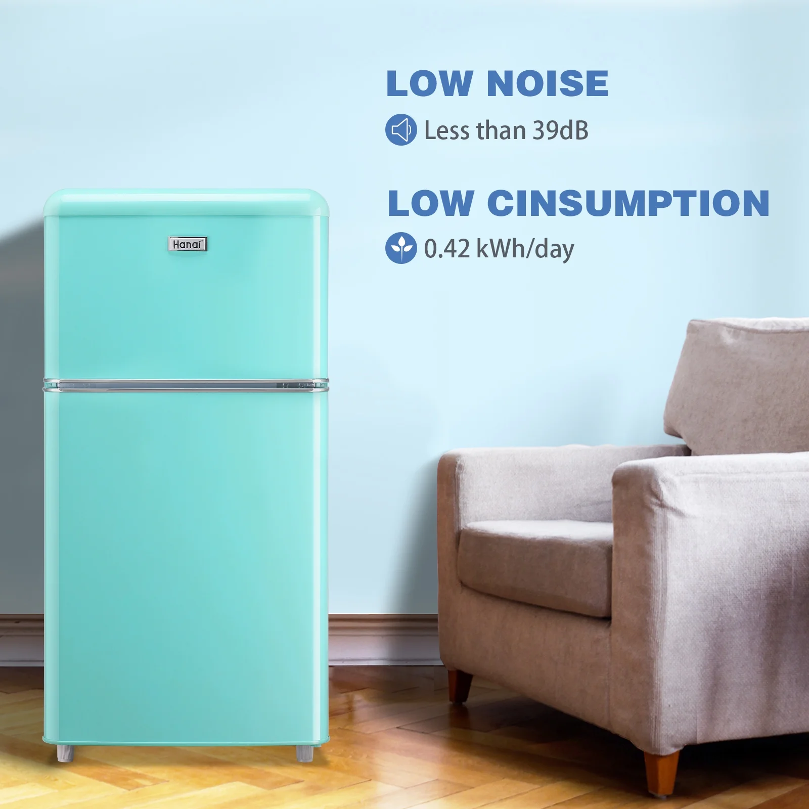 WANAI Mini Fridge with Freezer 3.5 Cu.ft Refrigerator 7 Level Thermostat 2 Door Desgin Blue