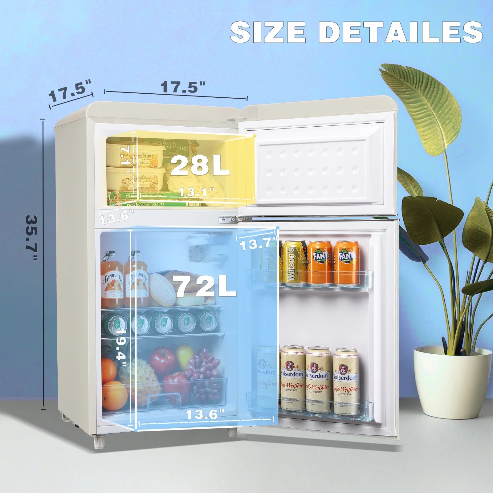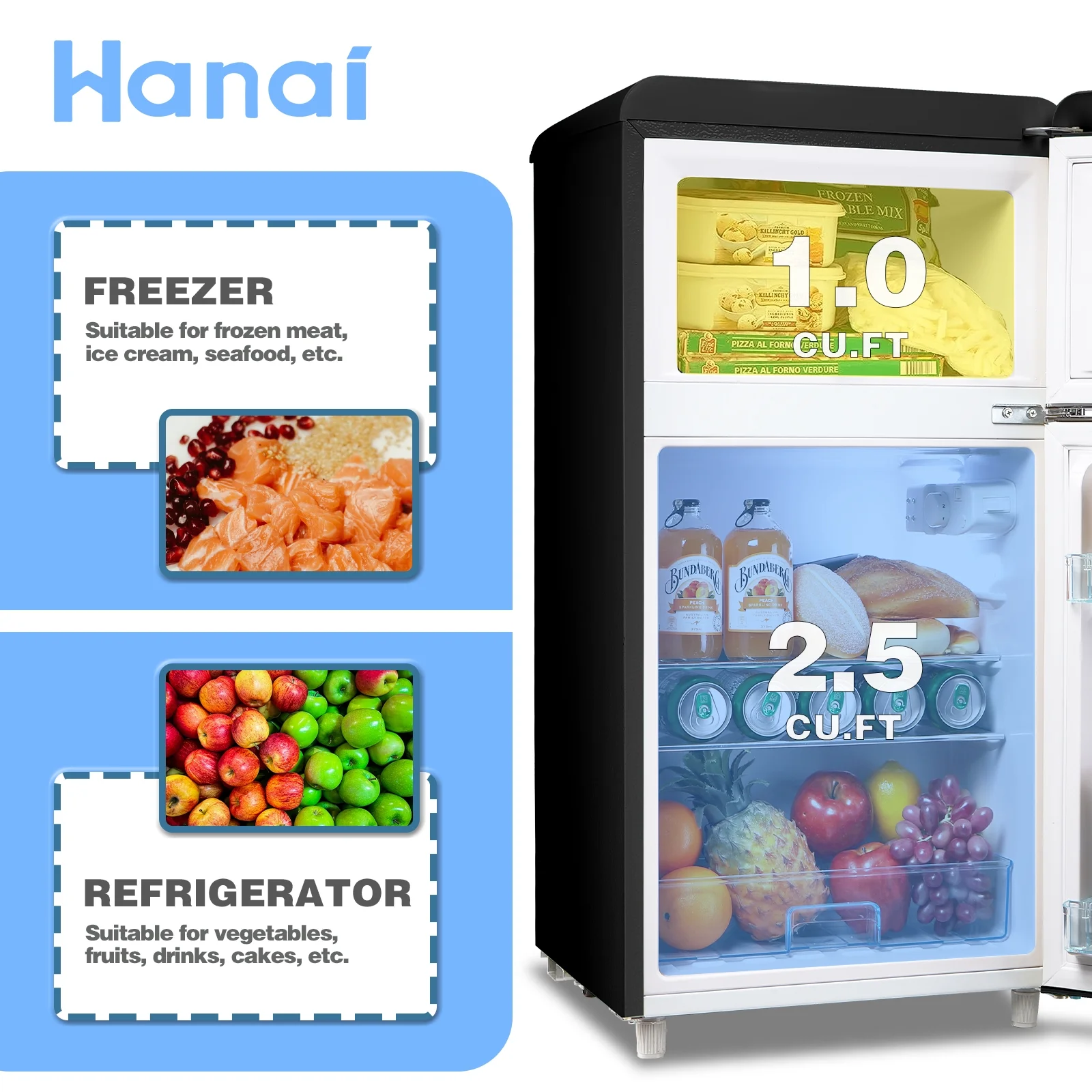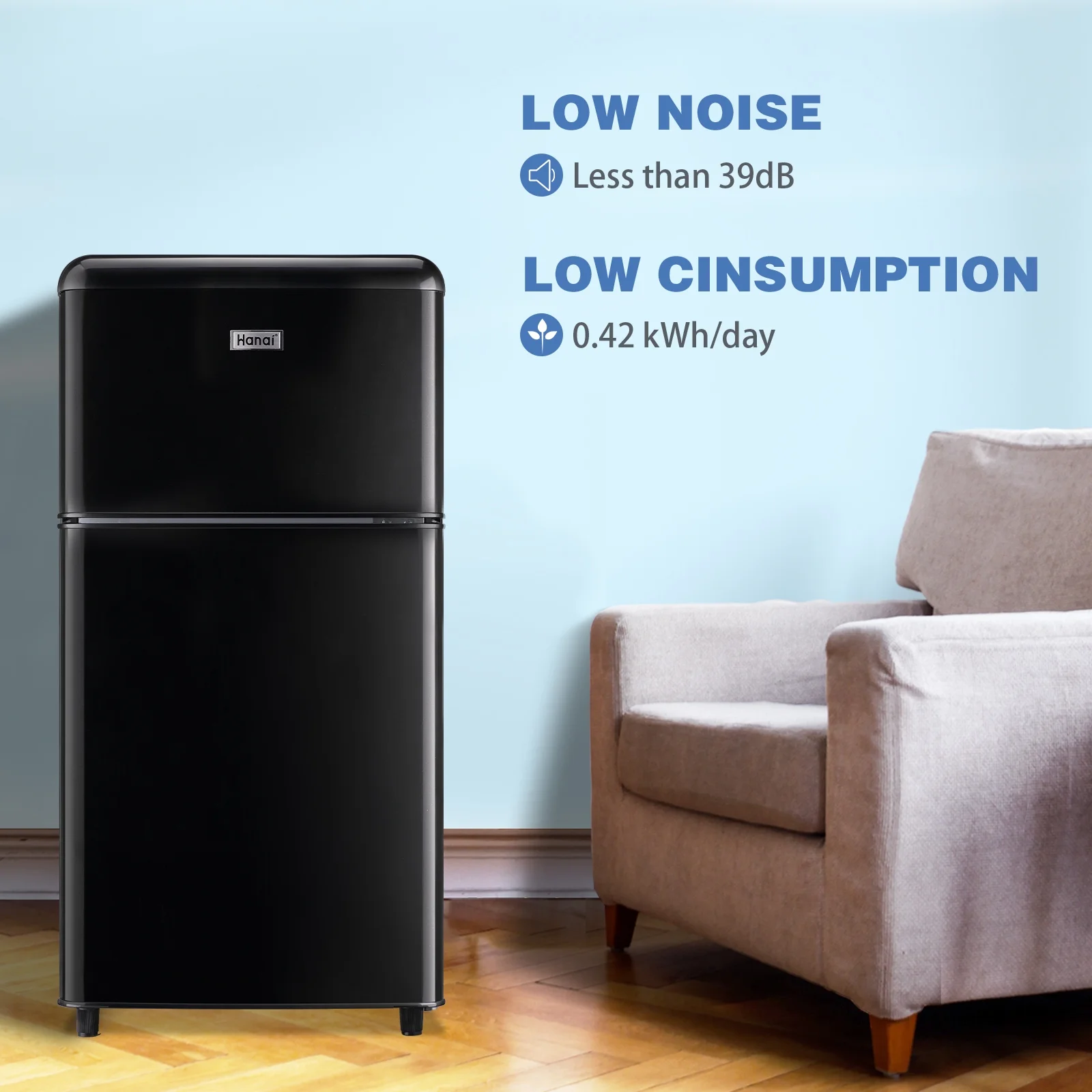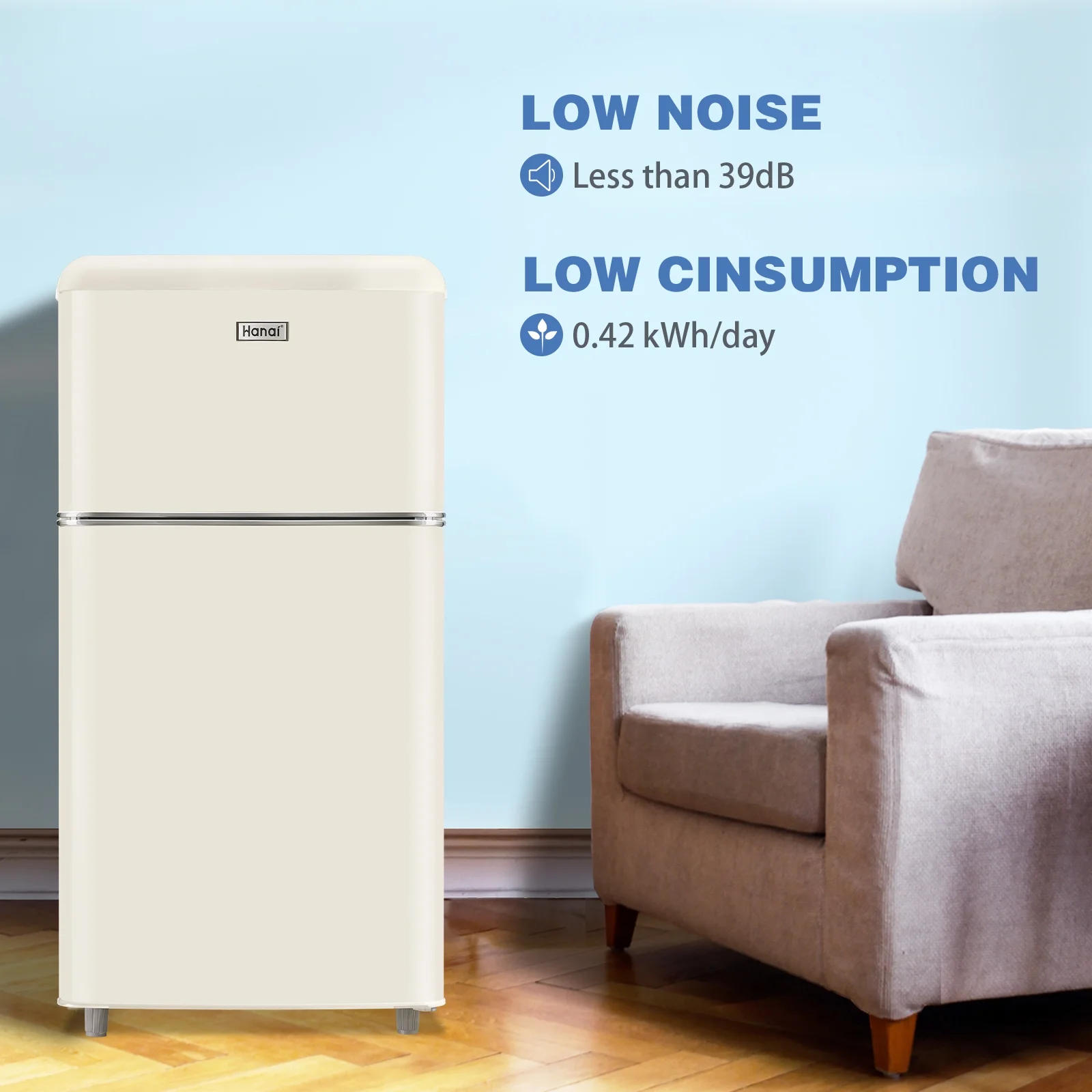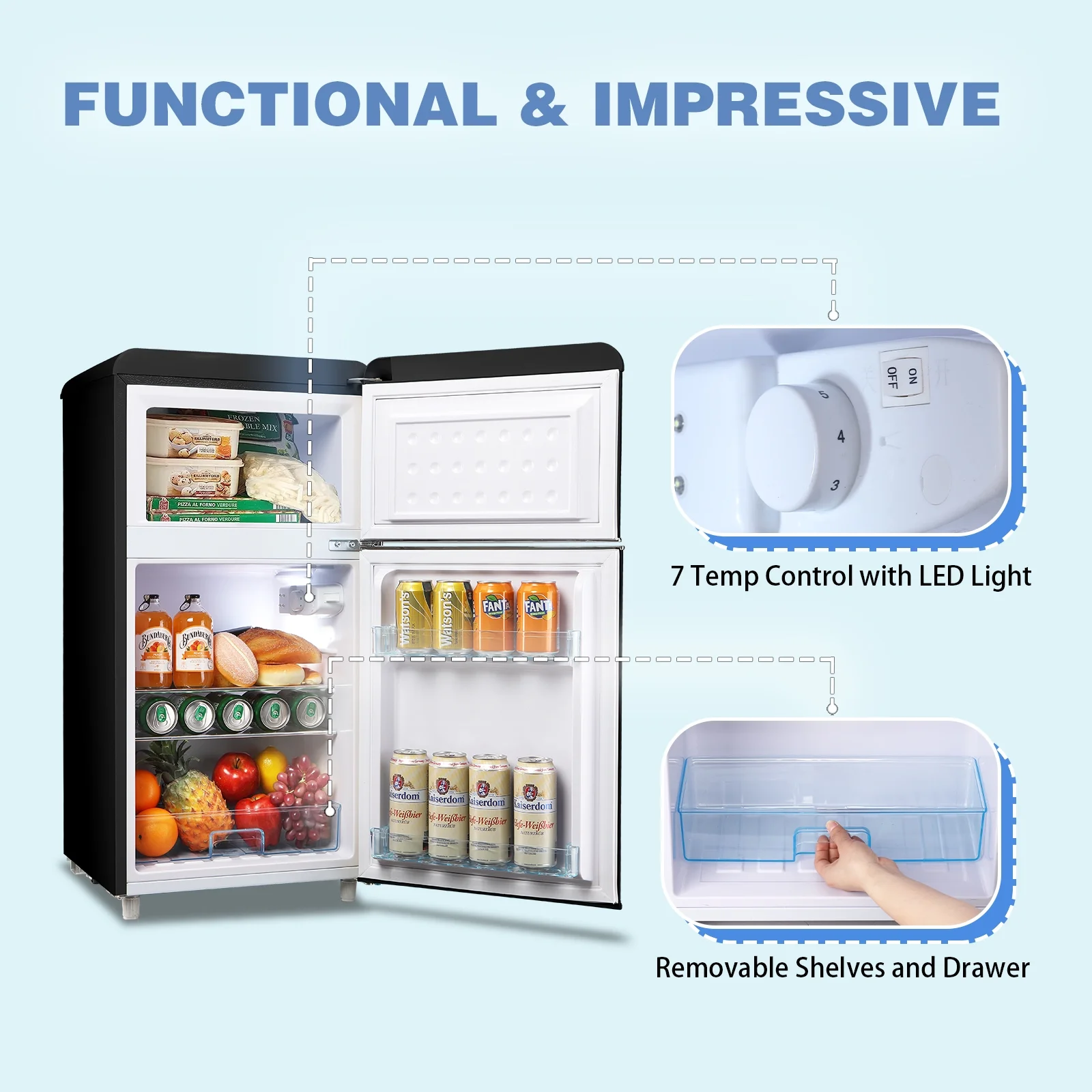 WANAI Mini Fridge with Freezer 3.5 Cu.ft Refrigerator 7 Level Thermostat 2 Door Desgin Blue
