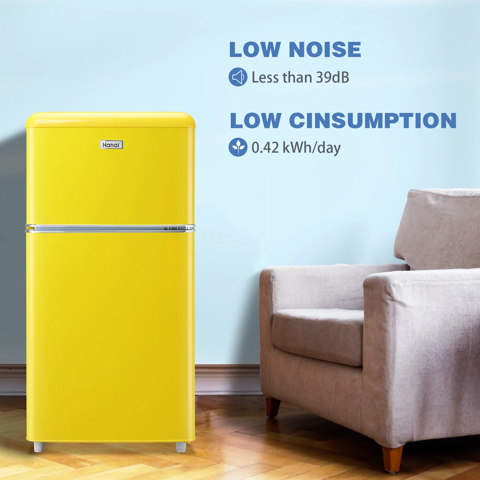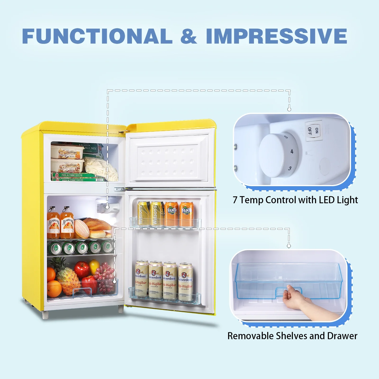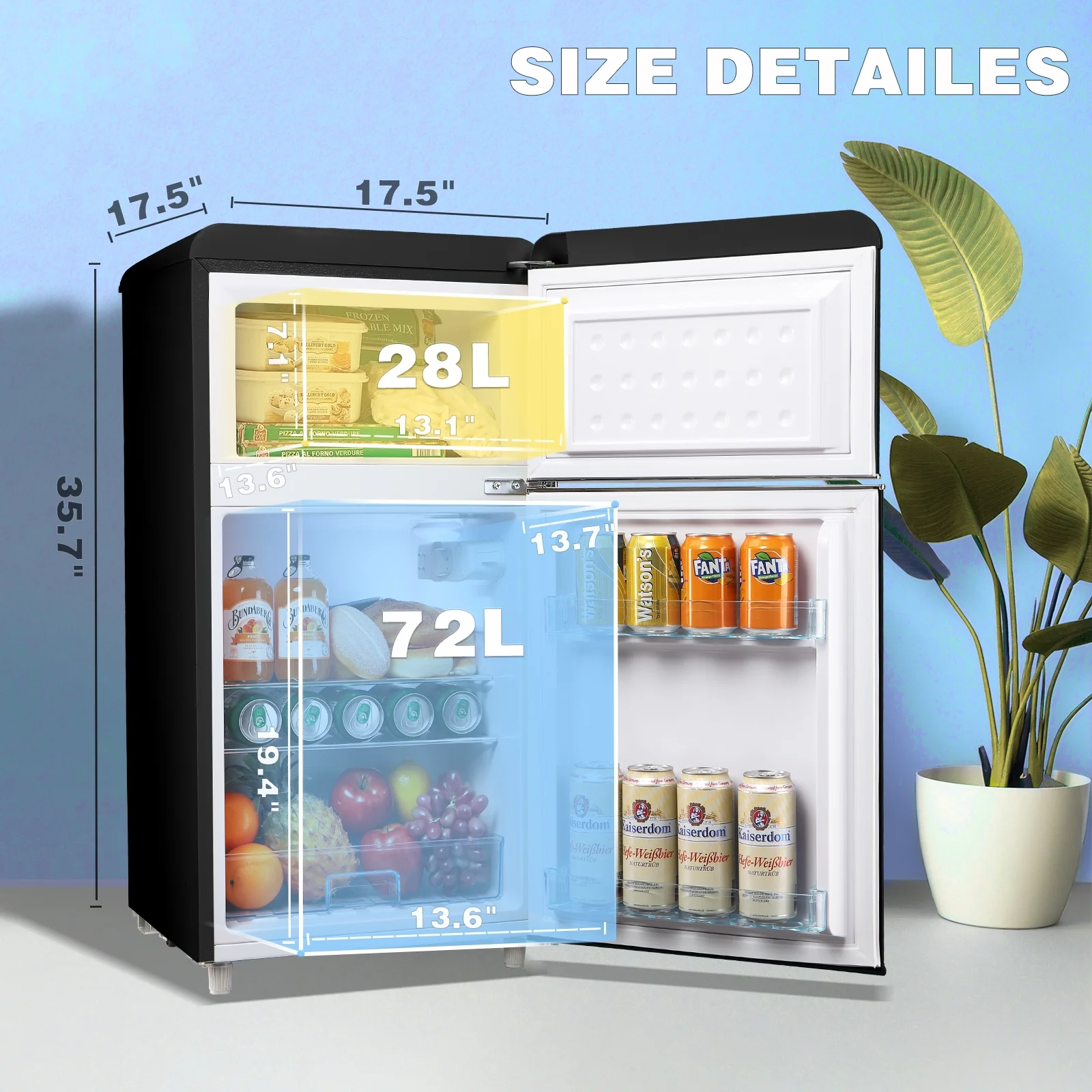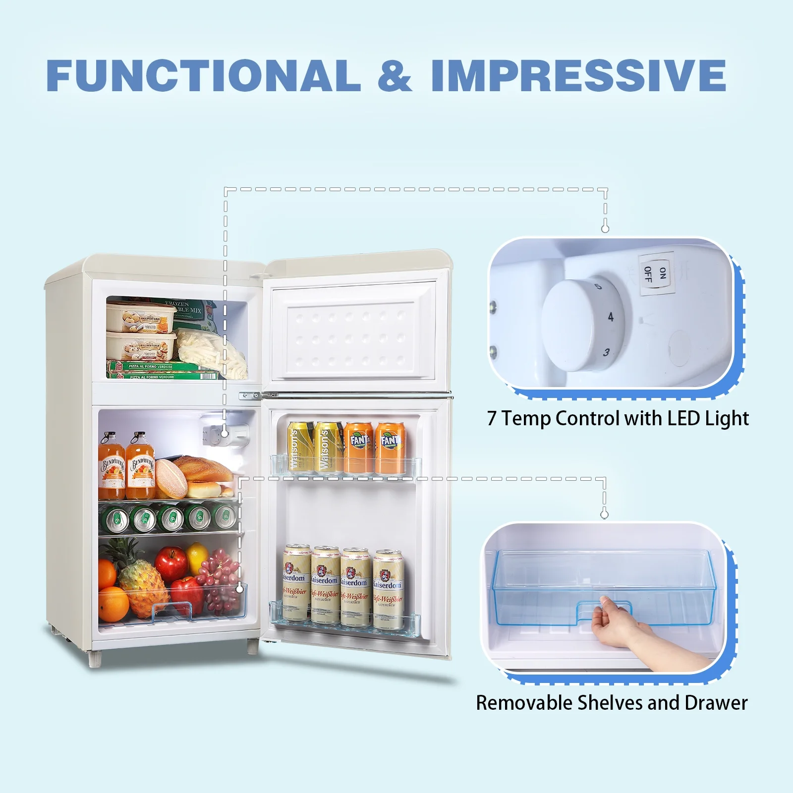 WANAI Mini Fridge with Freezer 3.5 Cu.ft Refrigerator 7 Level Thermostat 2 Door Desgin Blue