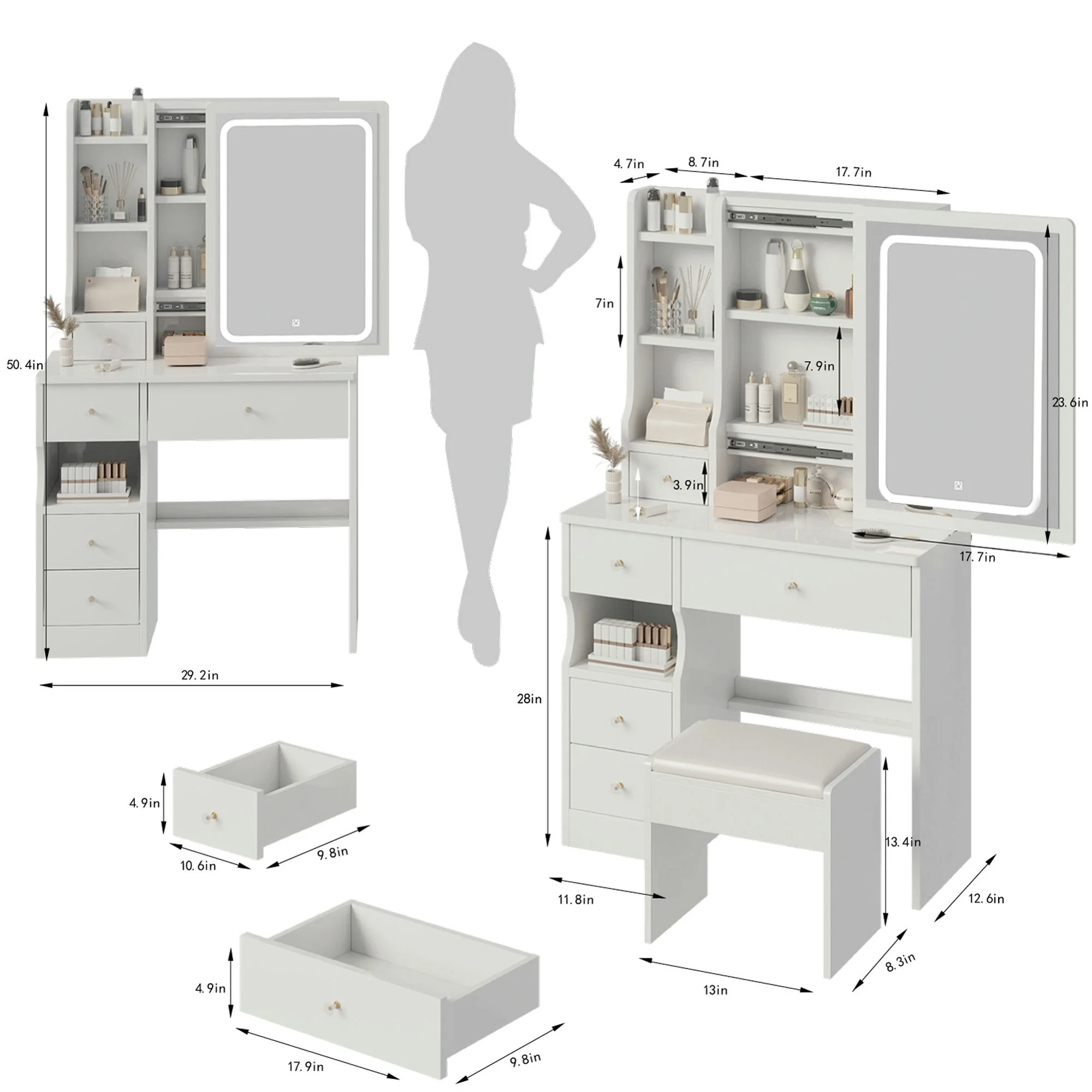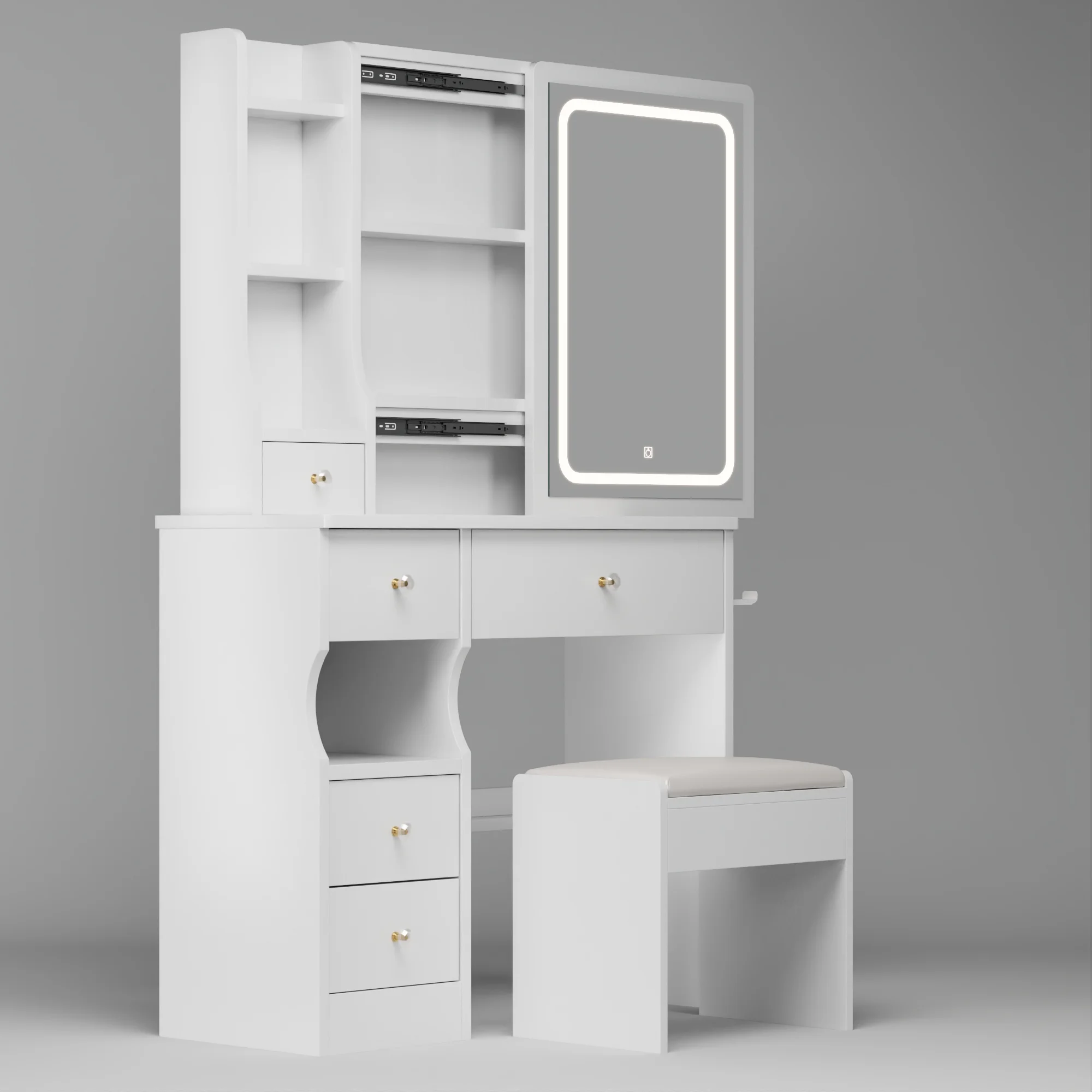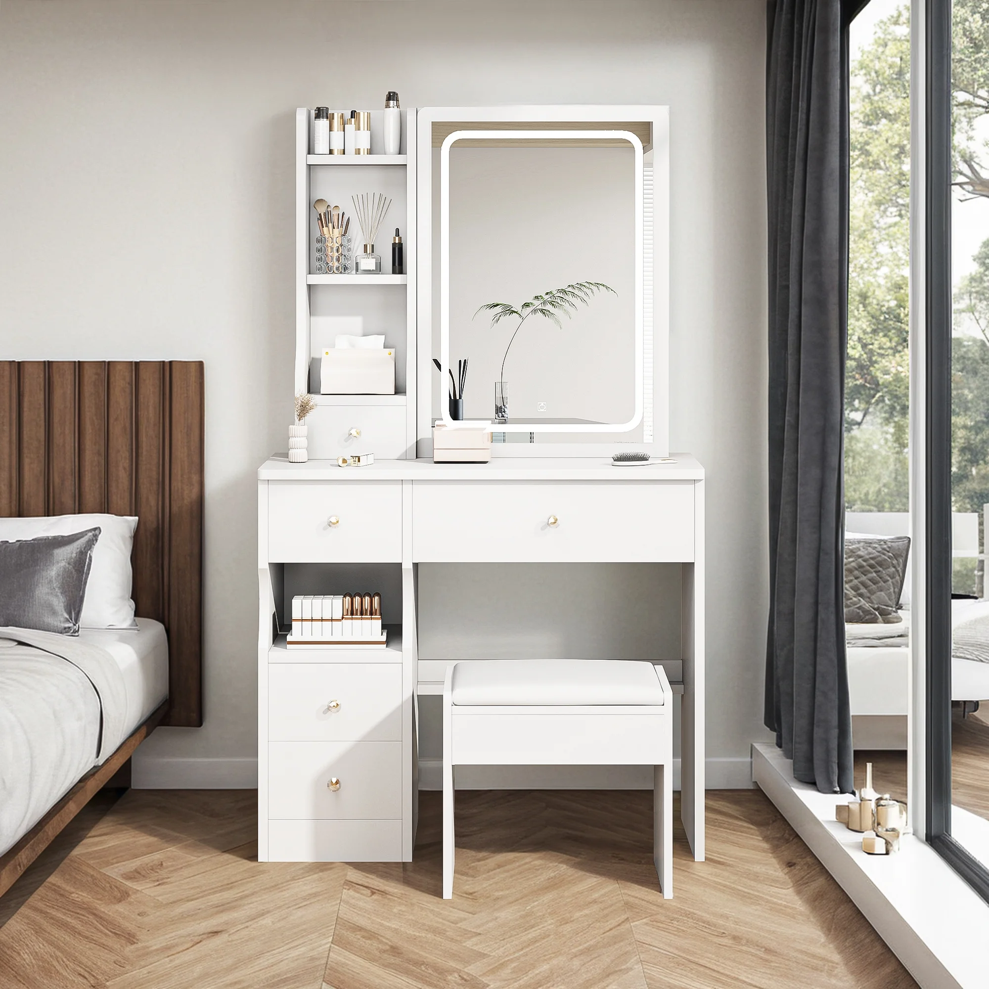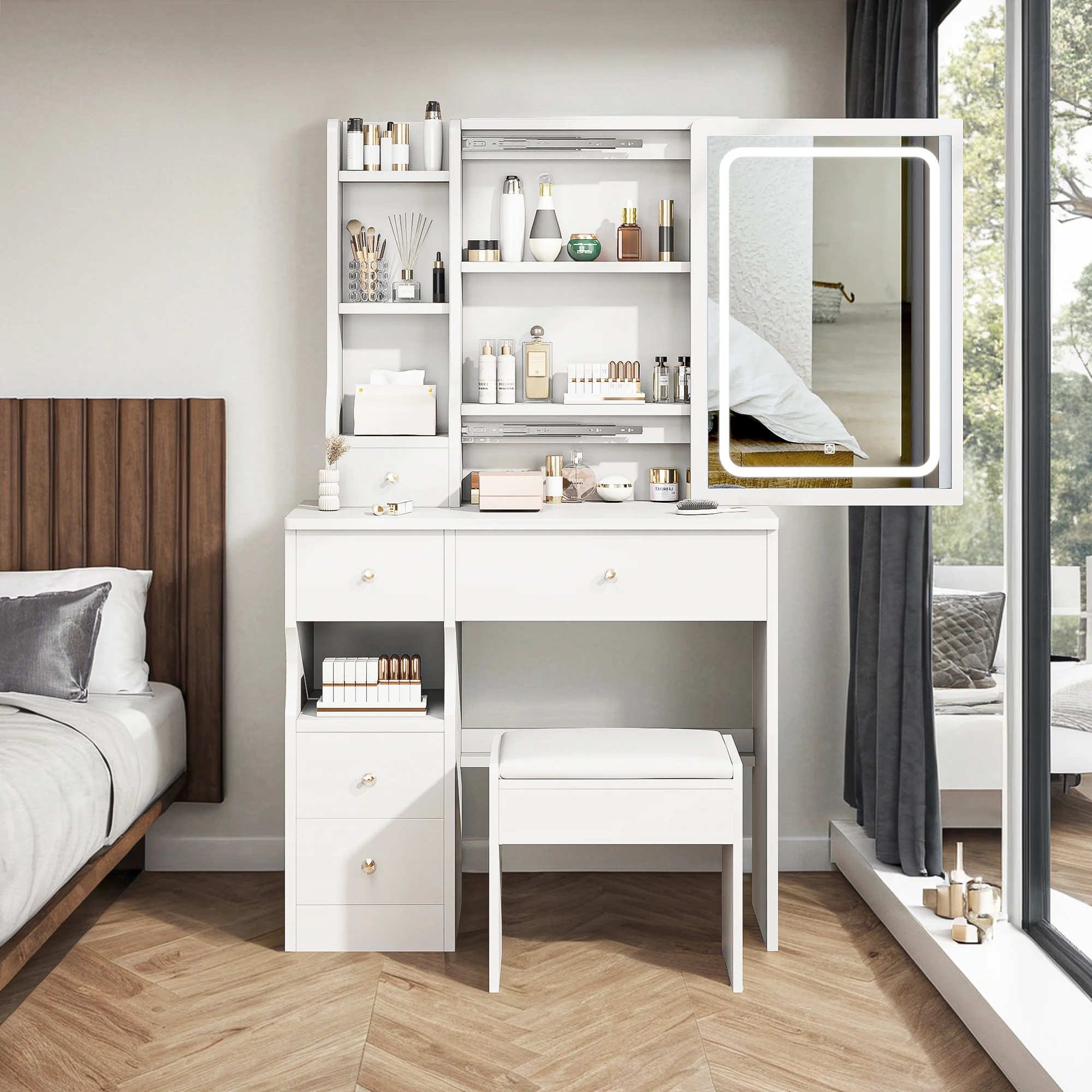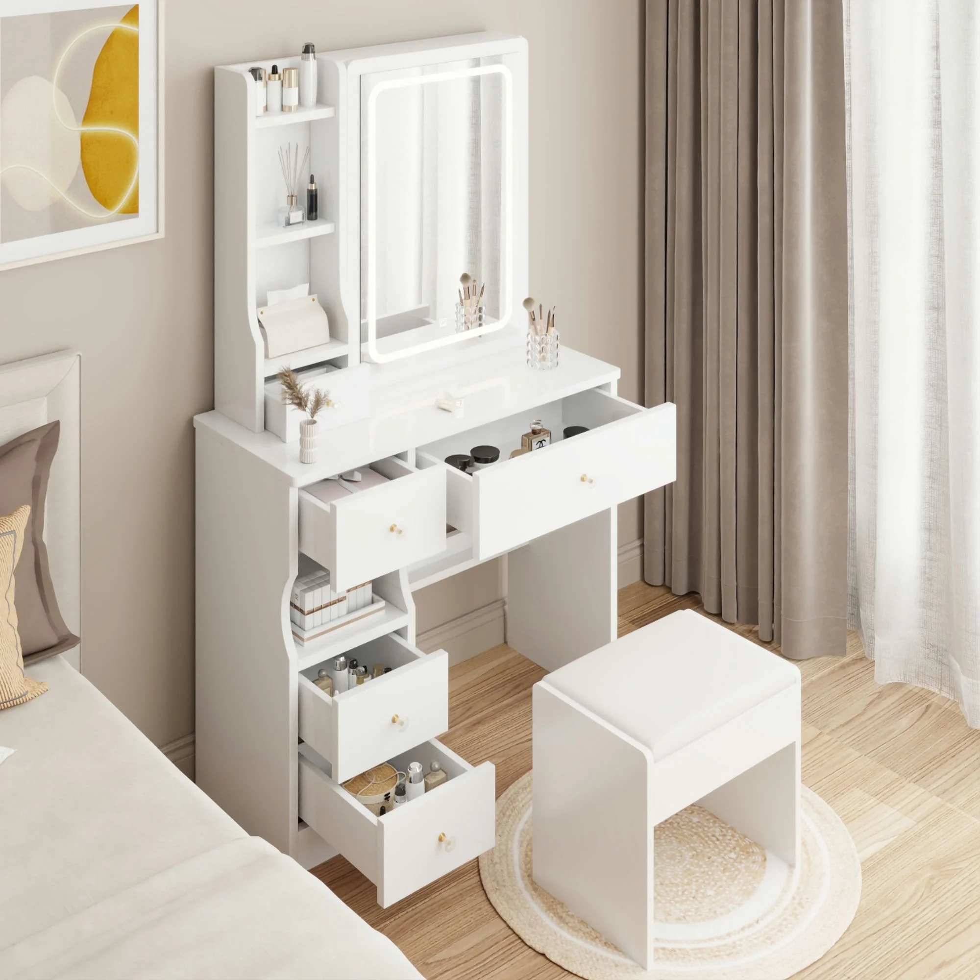 Kadyn Vanity Table with Large Sliding Lighted Mirror, Dressing Table with 2 Drawers, Storage Shelves and Upholstered Stool, White