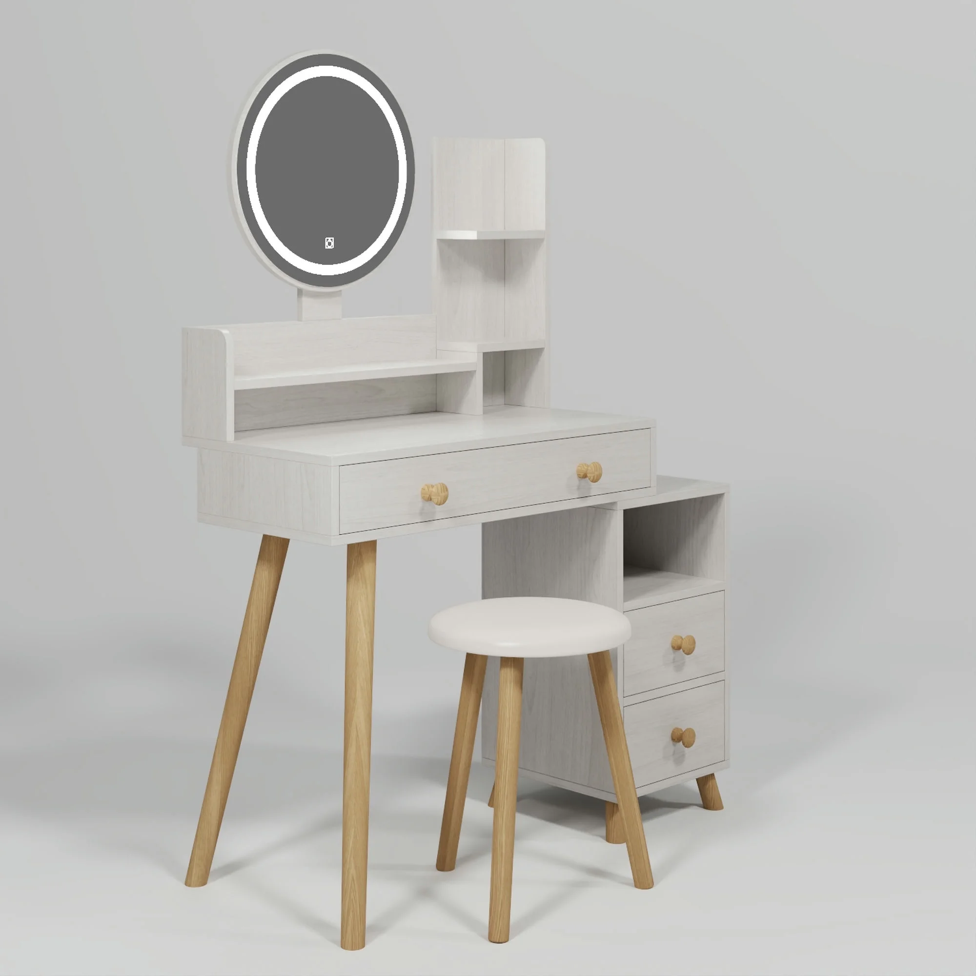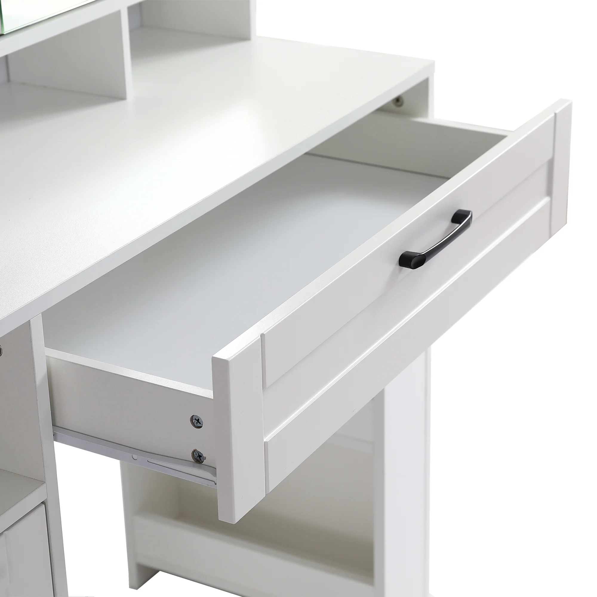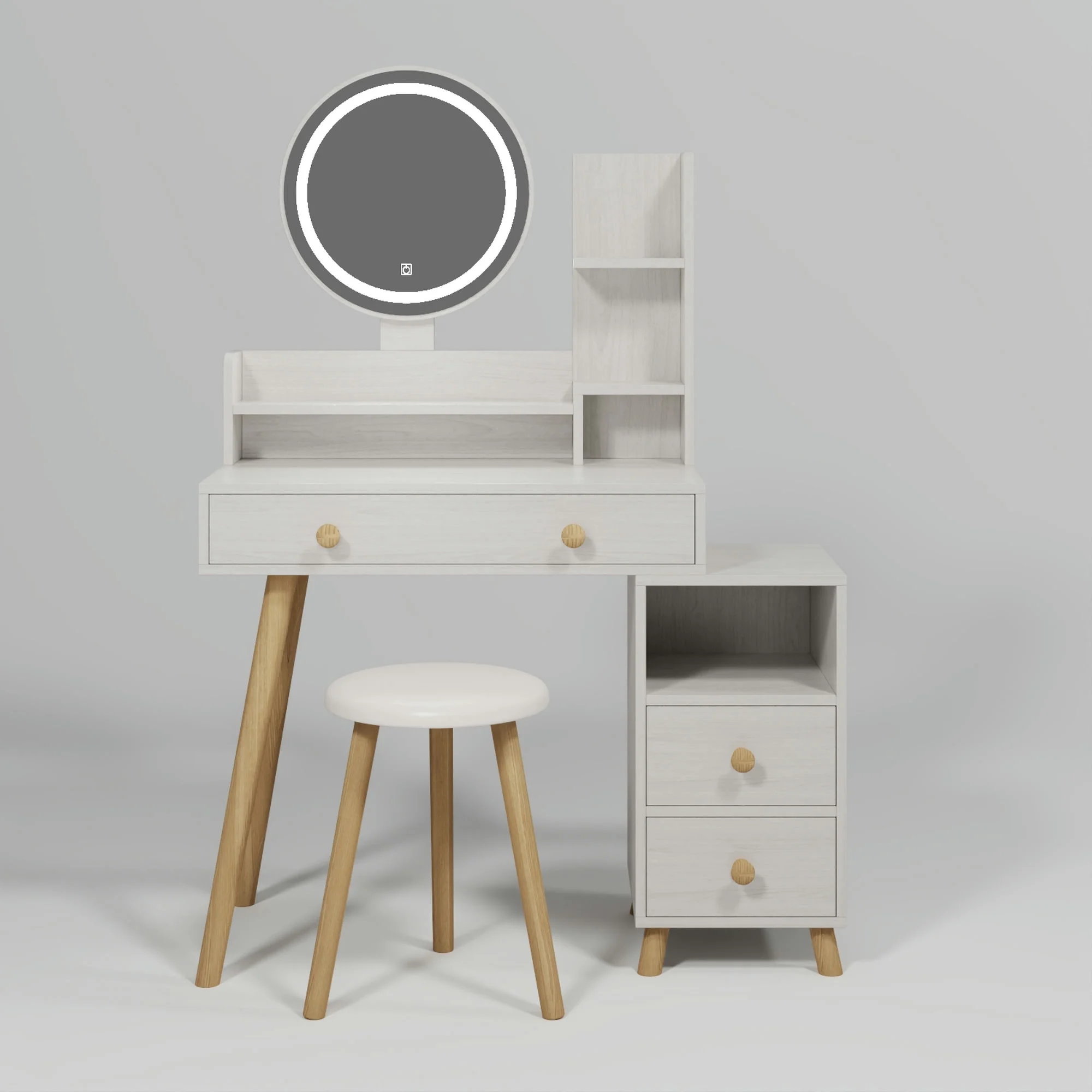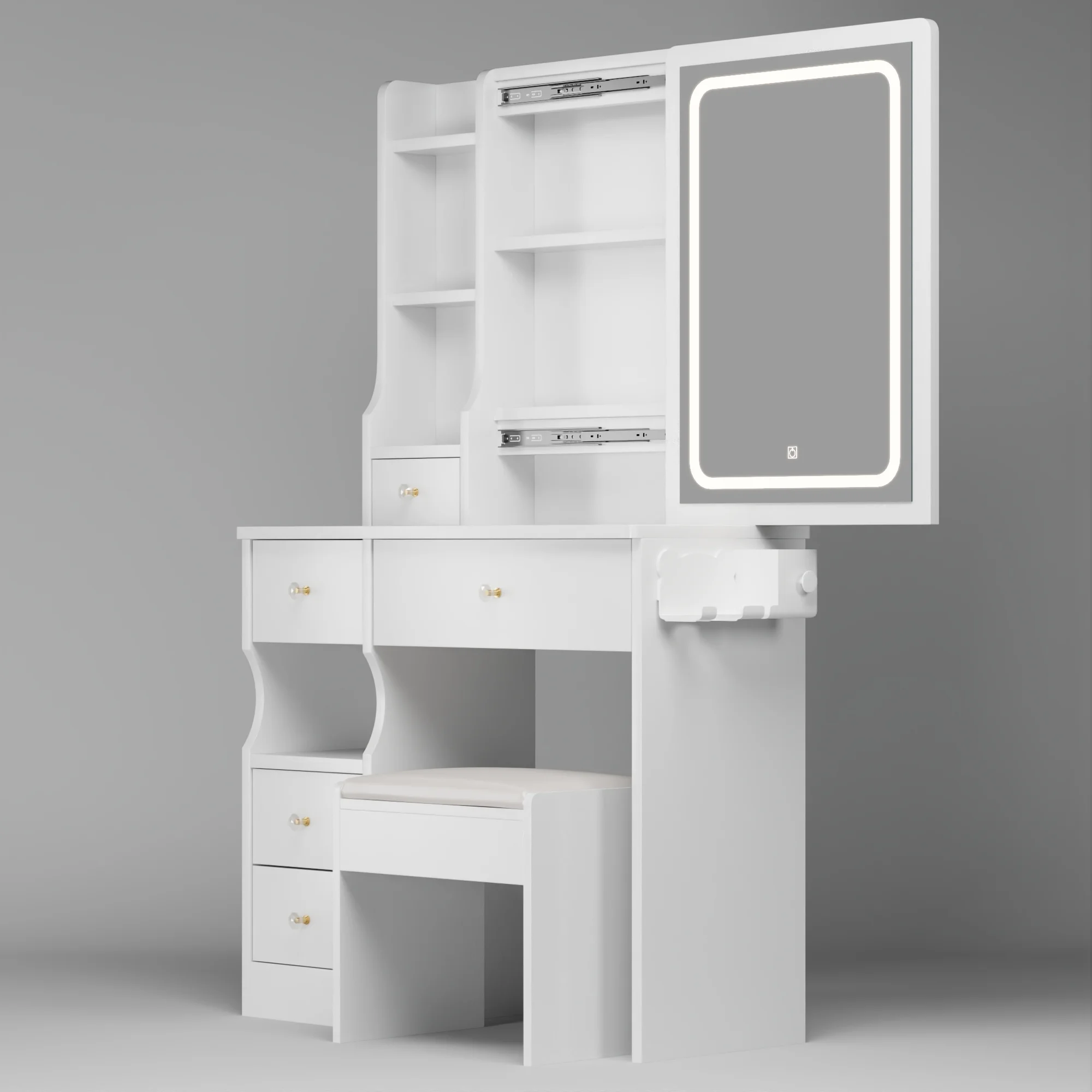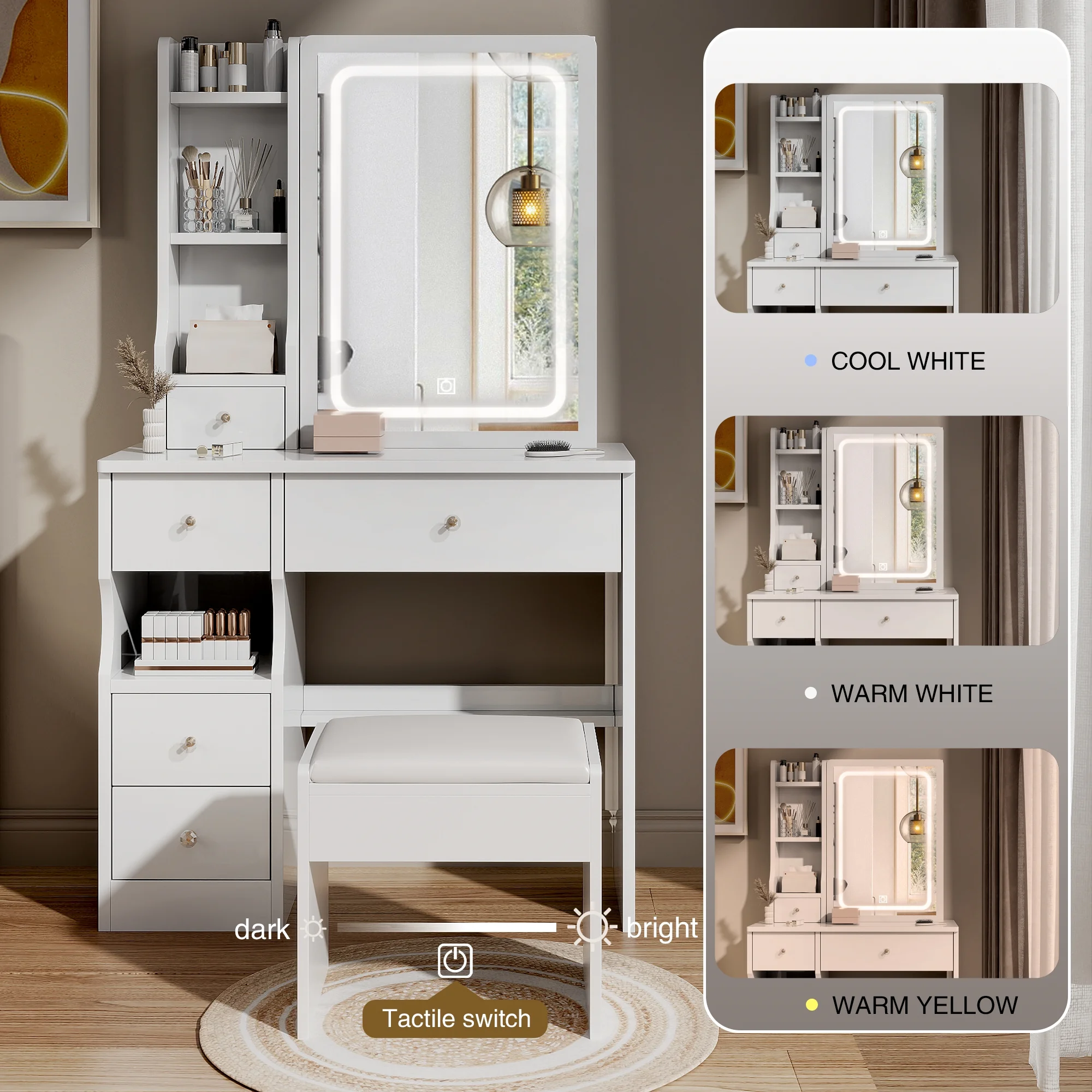 Kadyn Vanity Table with Large Sliding Lighted Mirror, Dressing Table with 2 Drawers, Storage Shelves and Upholstered Stool, White