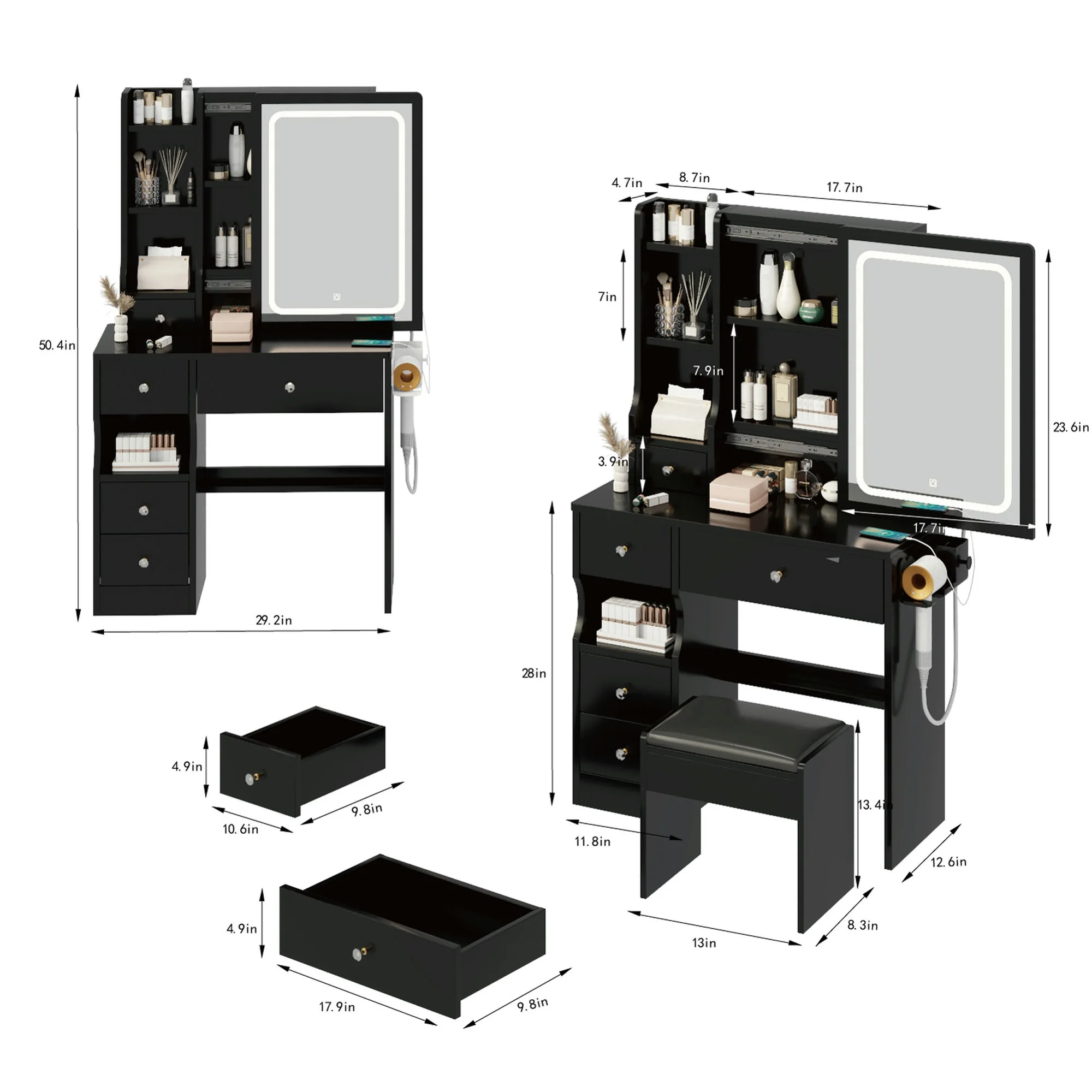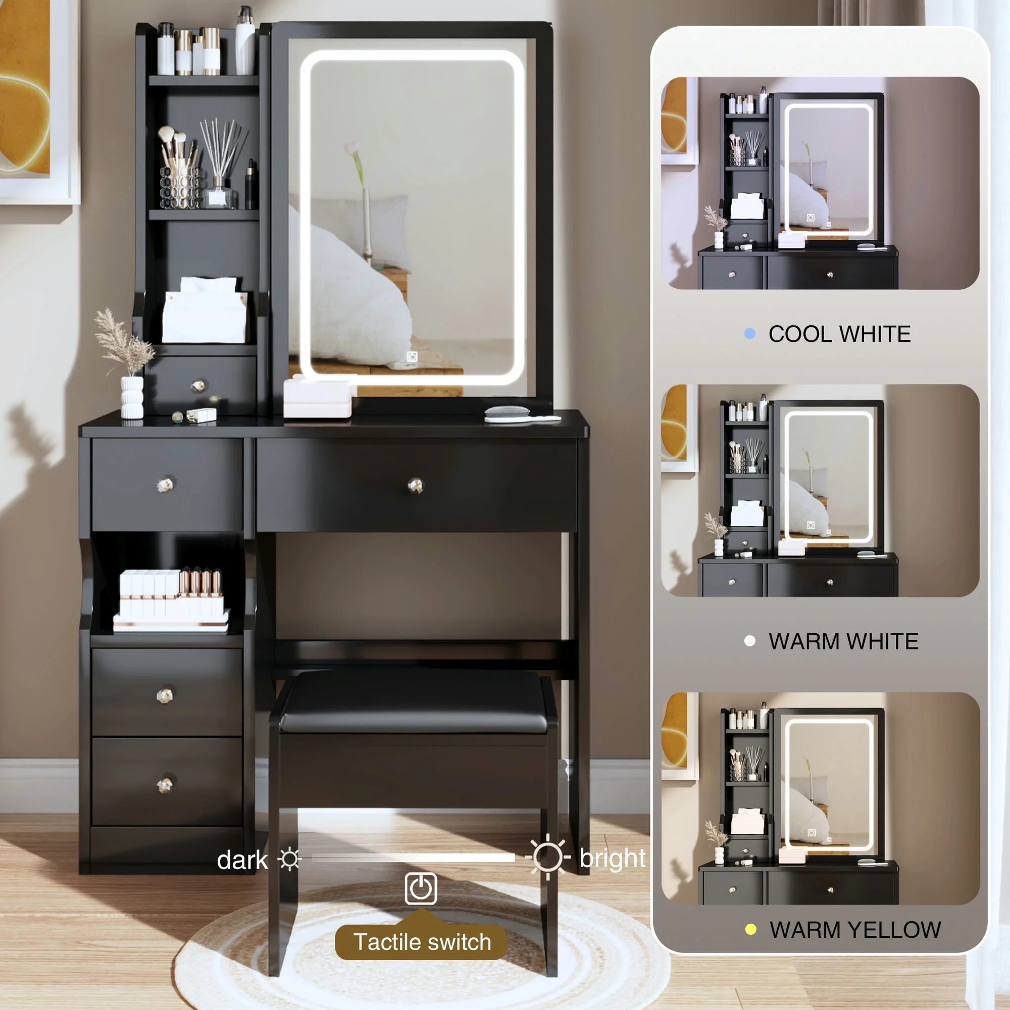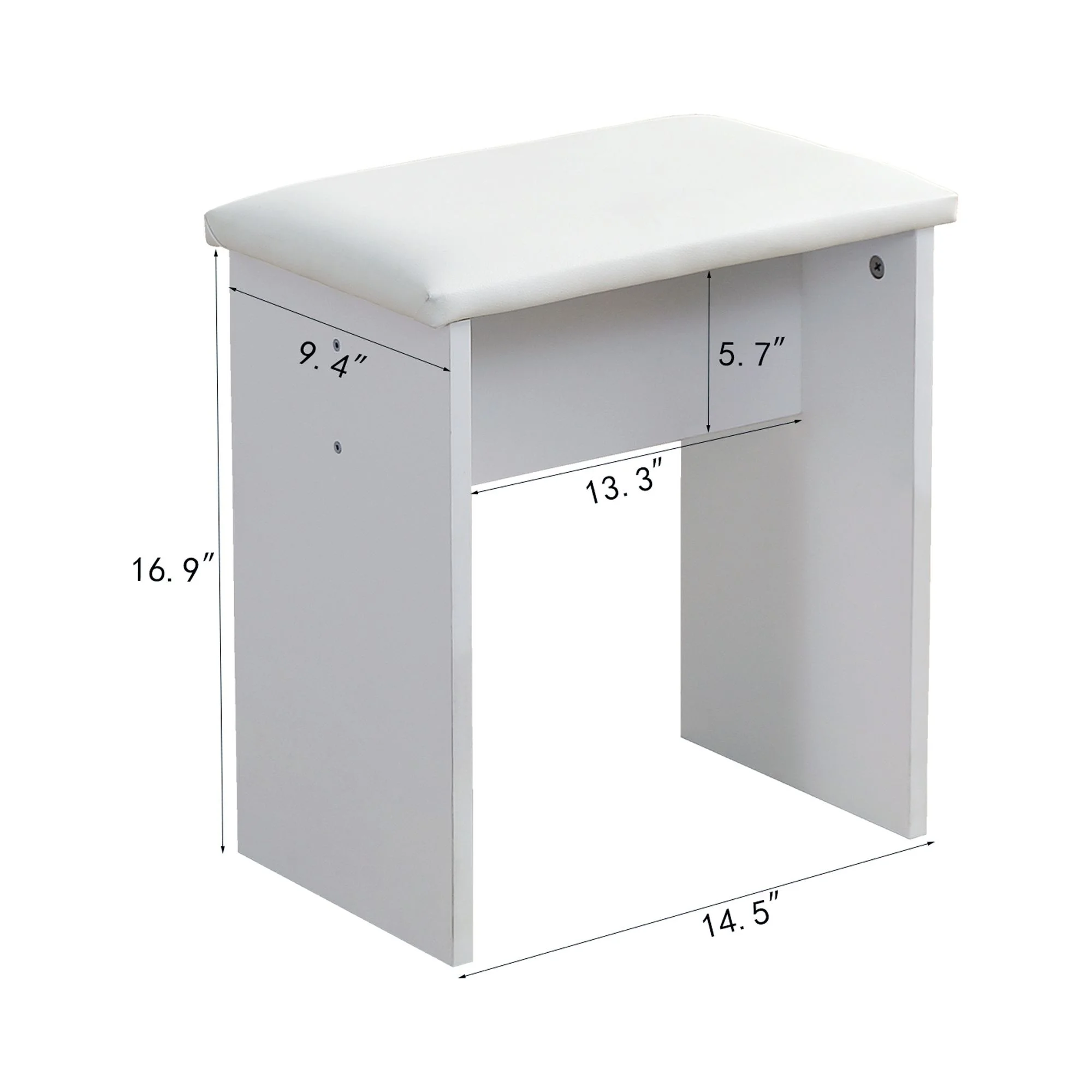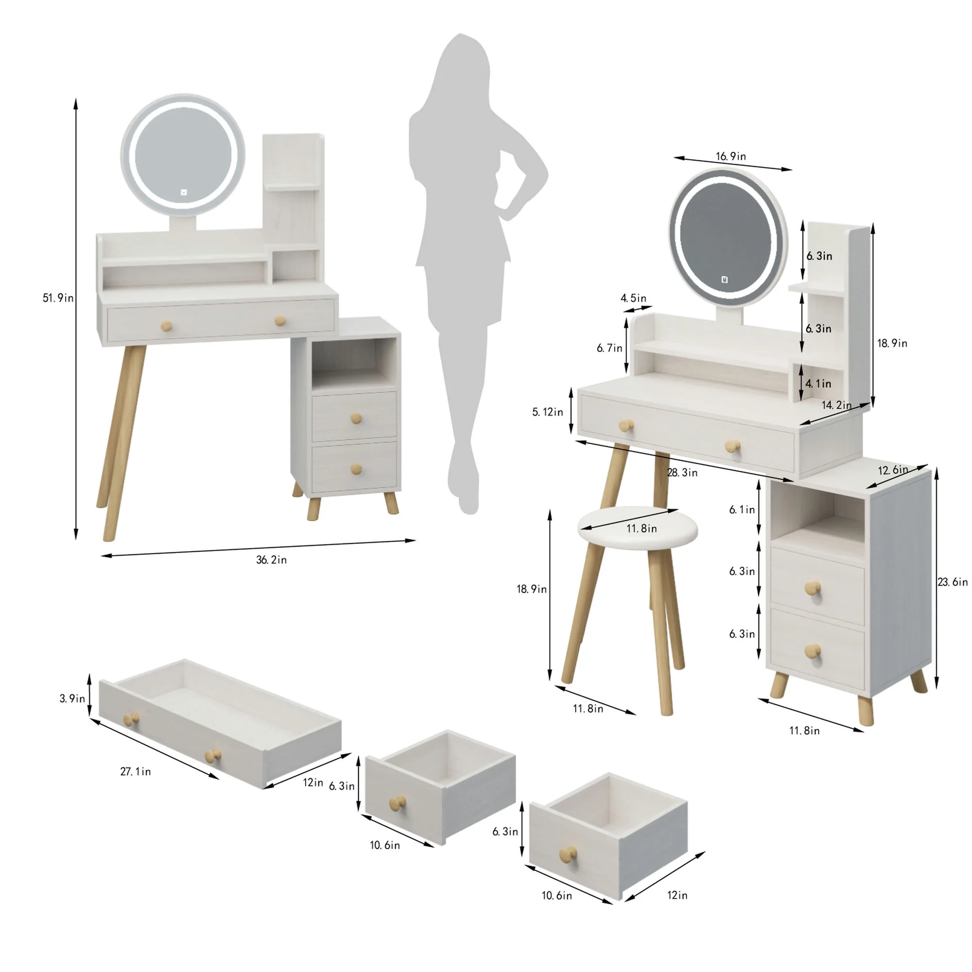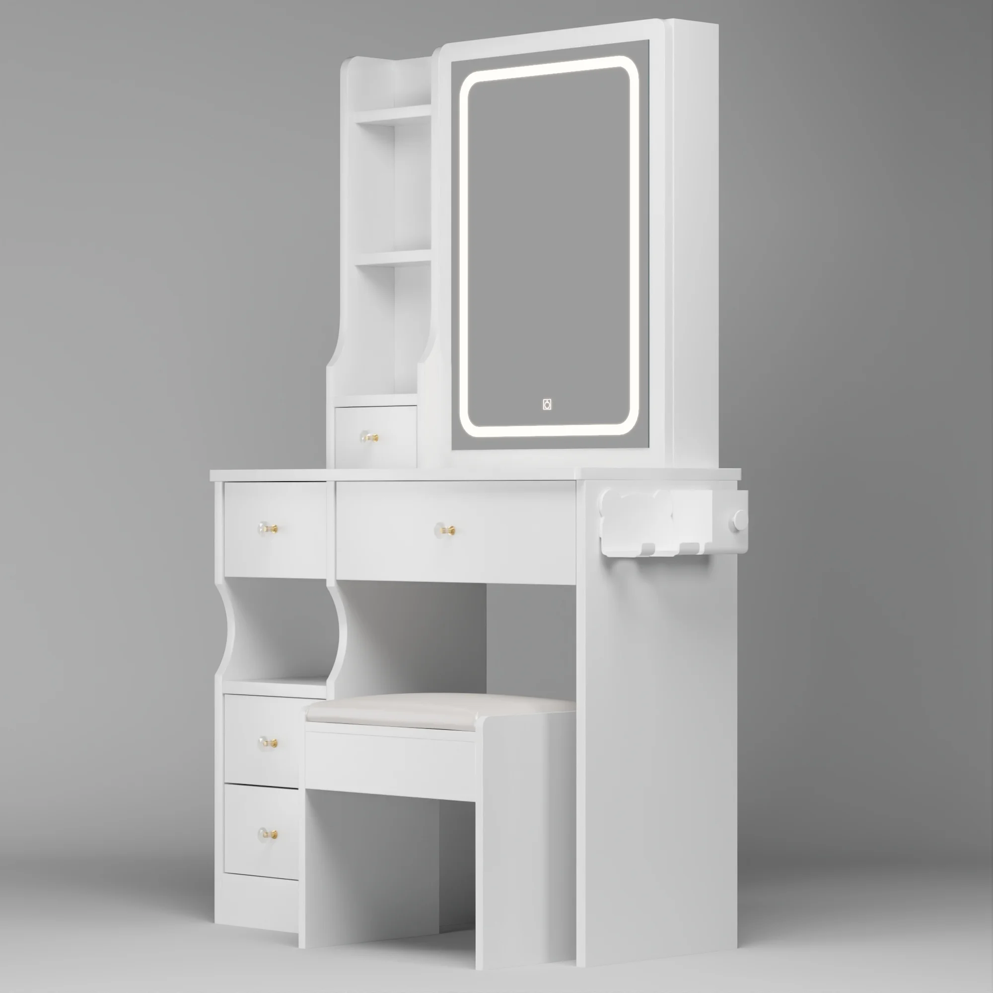 Kadyn Vanity Table with Large Sliding Lighted Mirror, Dressing Table with 2 Drawers, Storage Shelves and Upholstered Stool, White