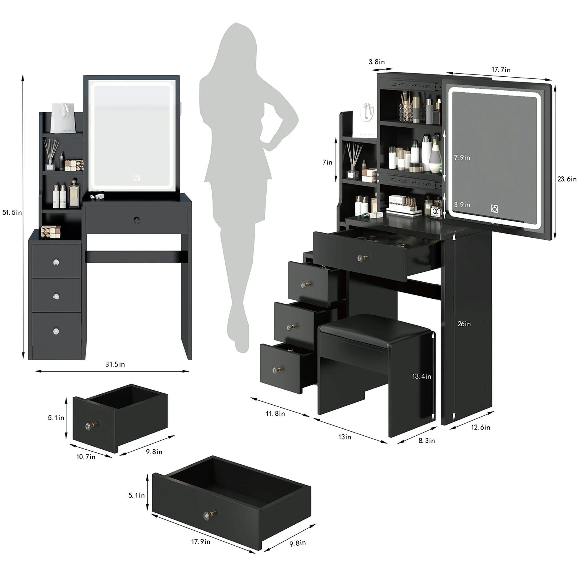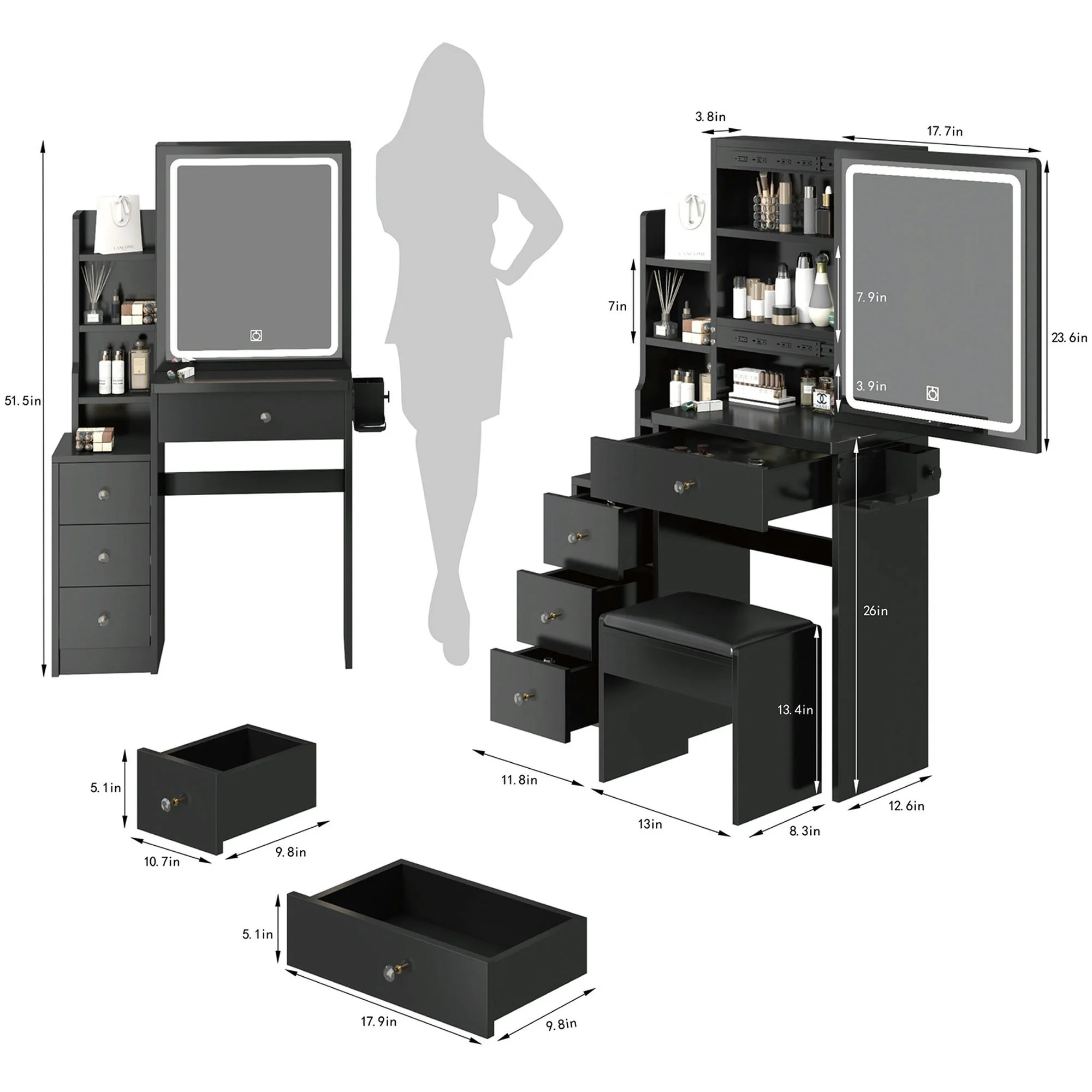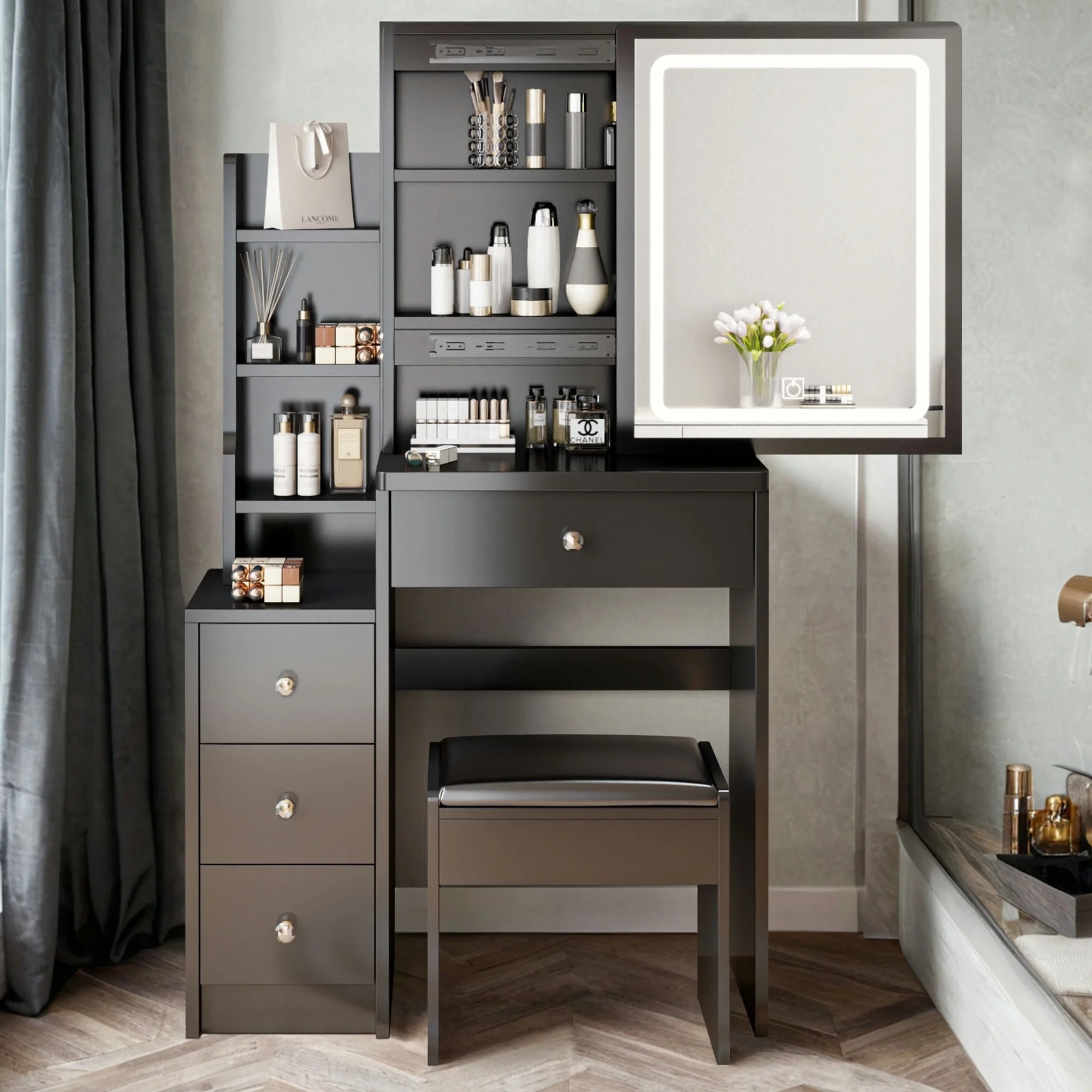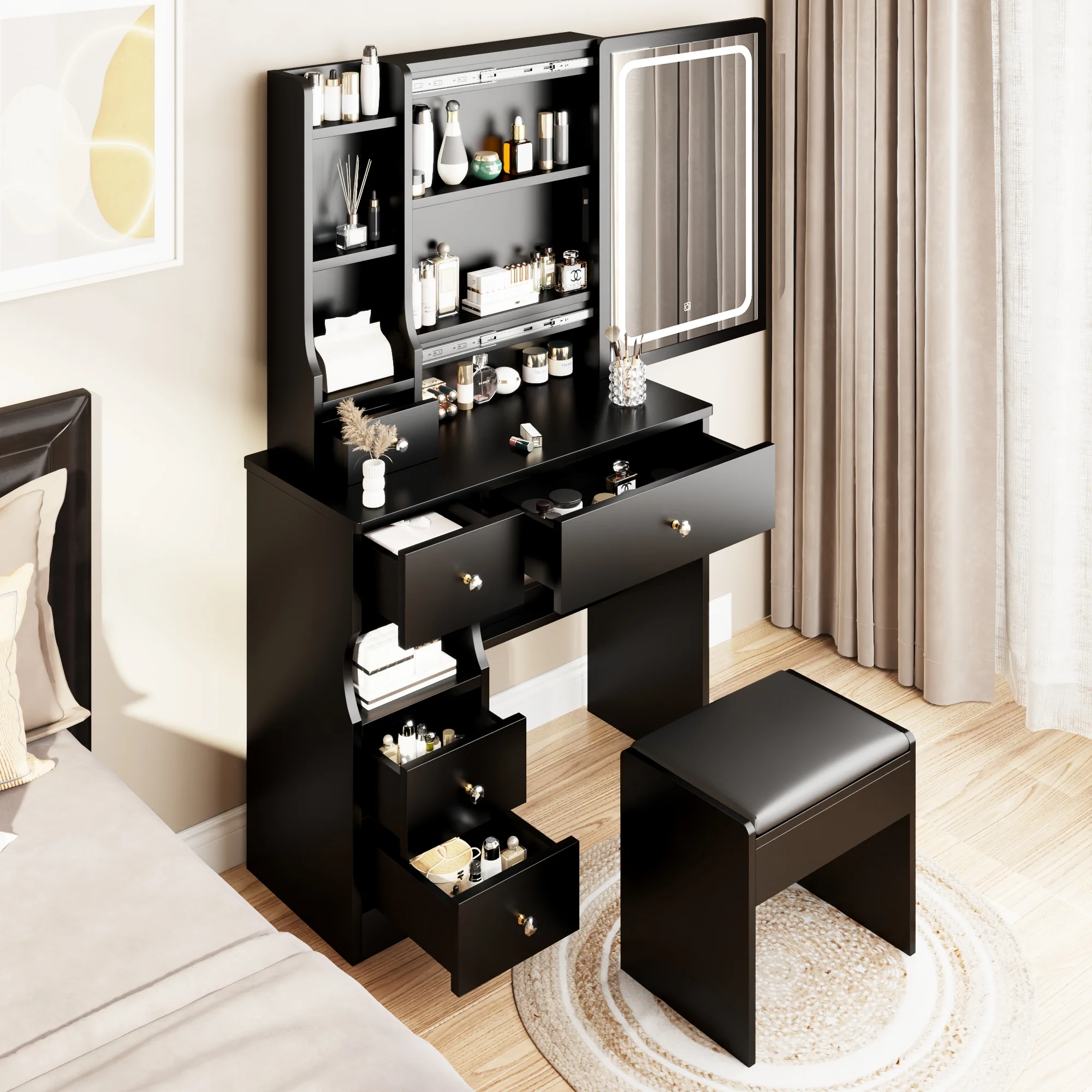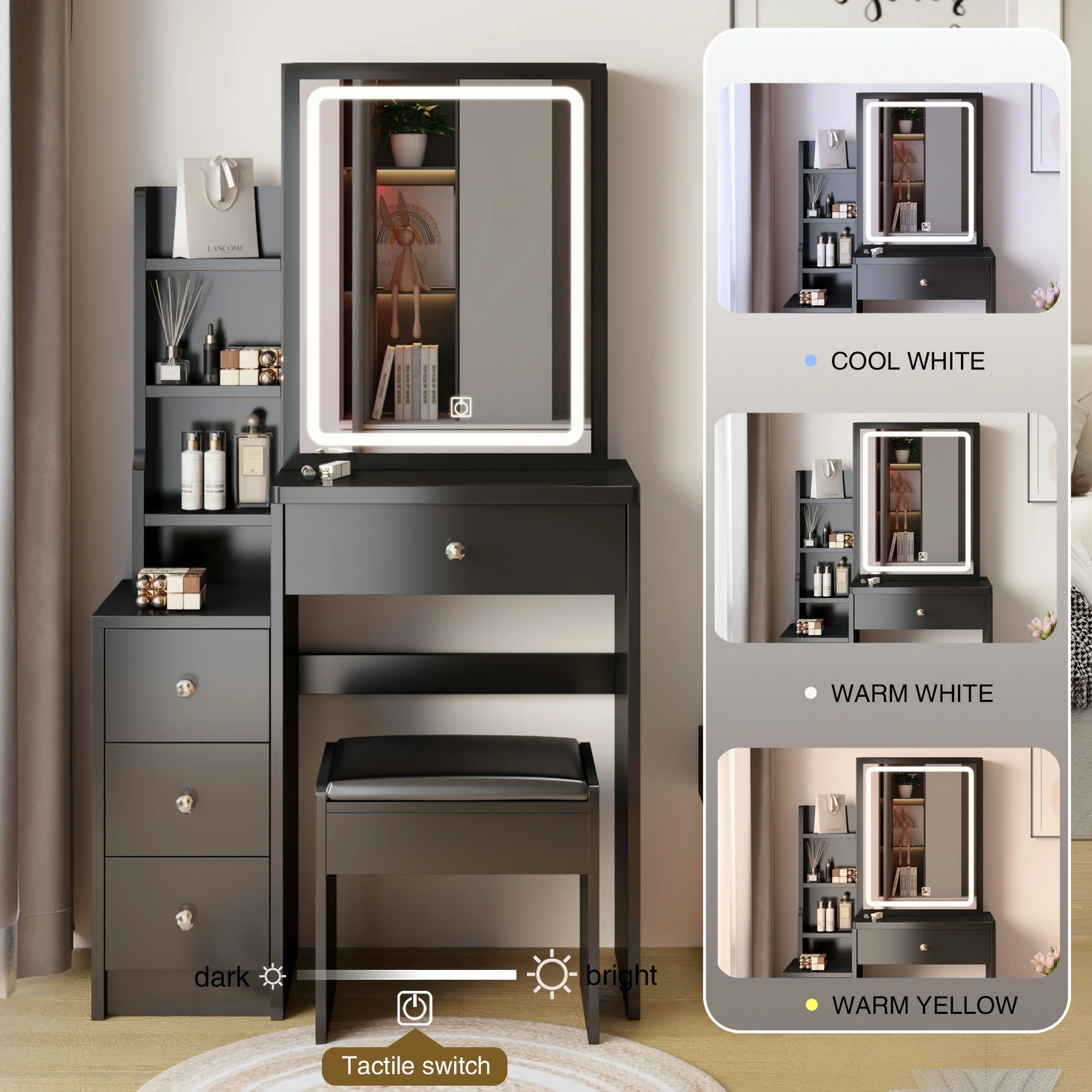 Kadyn Vanity Table with Large Sliding Lighted Mirror, Dressing Table with 2 Drawers, Storage Shelves and Upholstered Stool, White