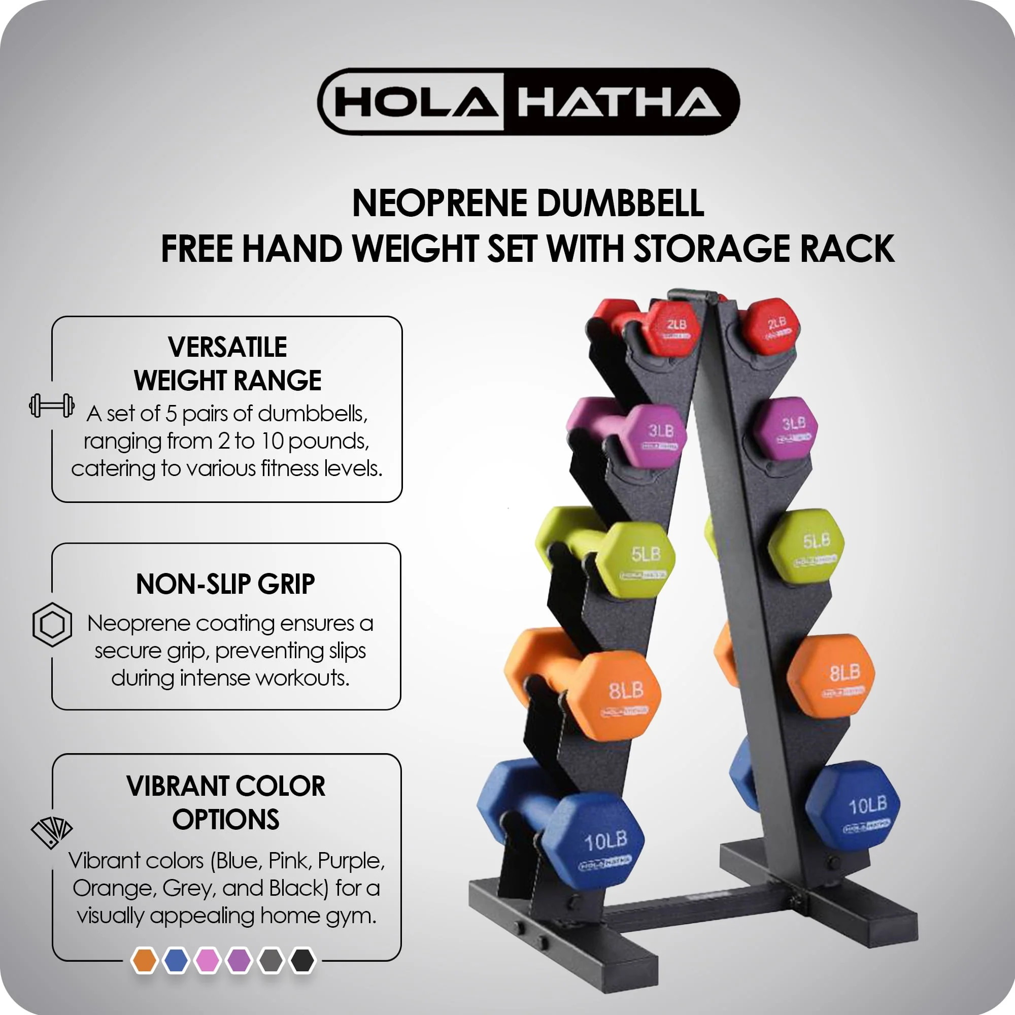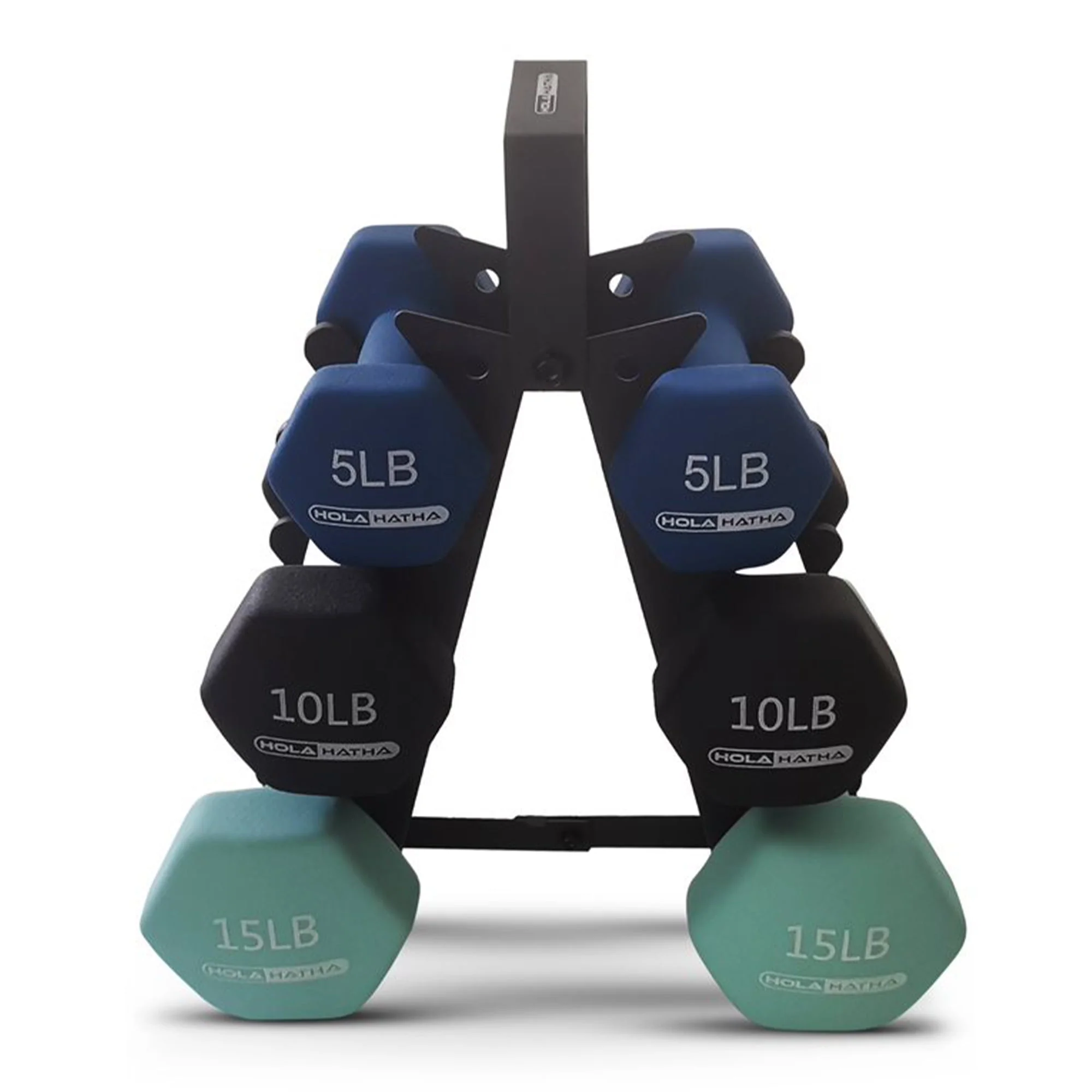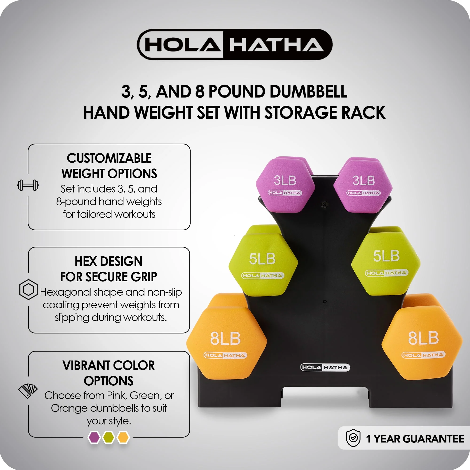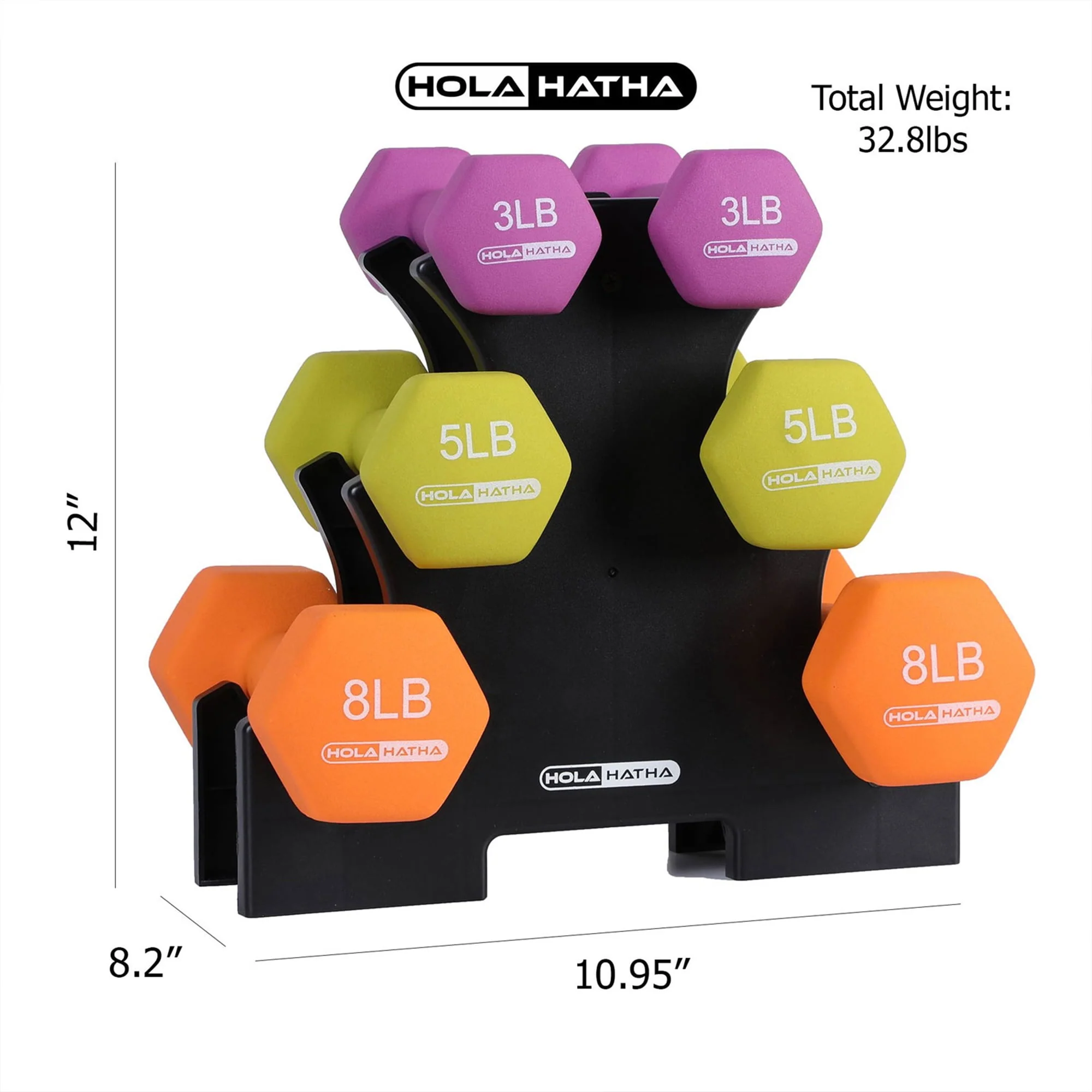 HolaHatha 3, 5, and 8 Pound Dumbbell Hand Weight Set with Storage Rack, Multi