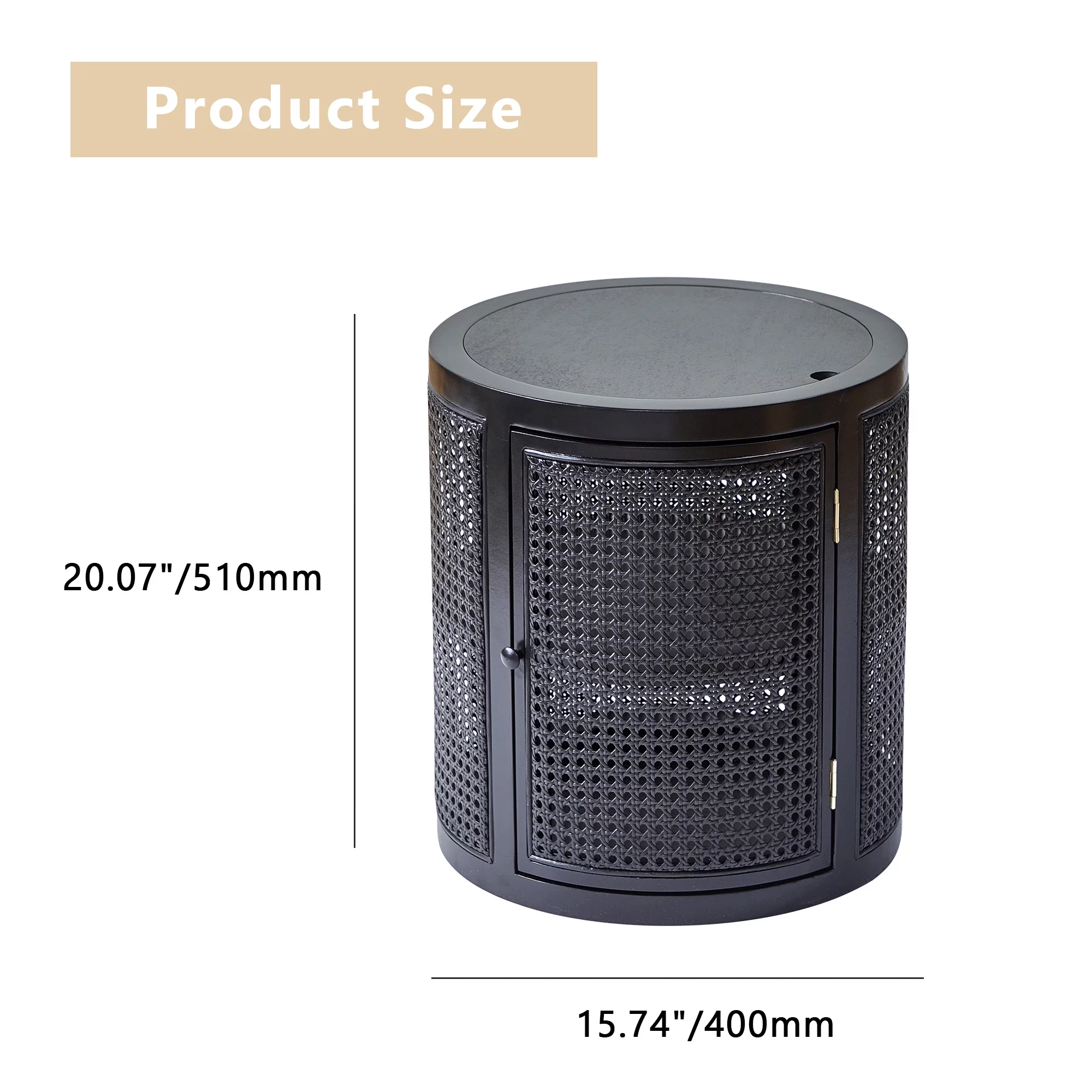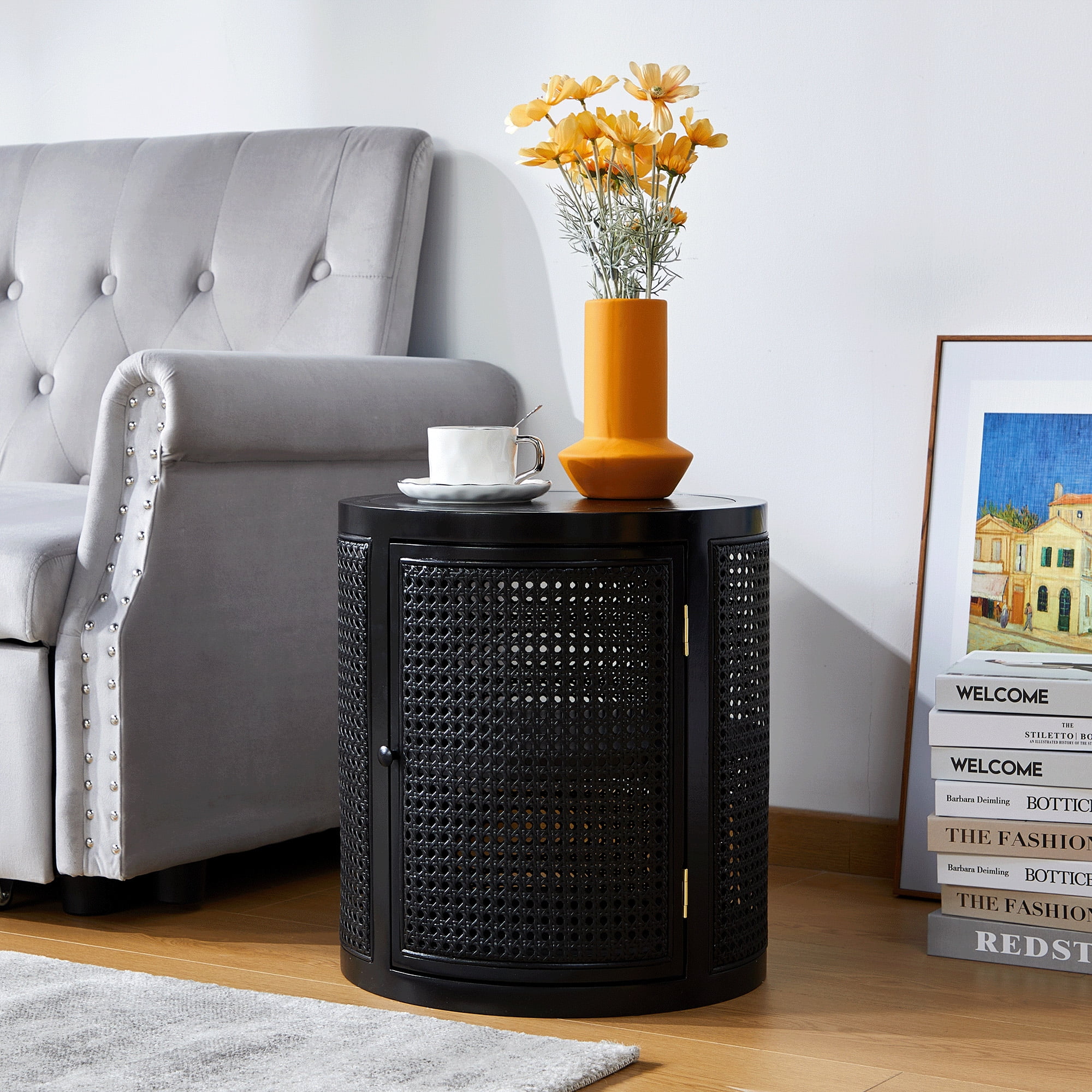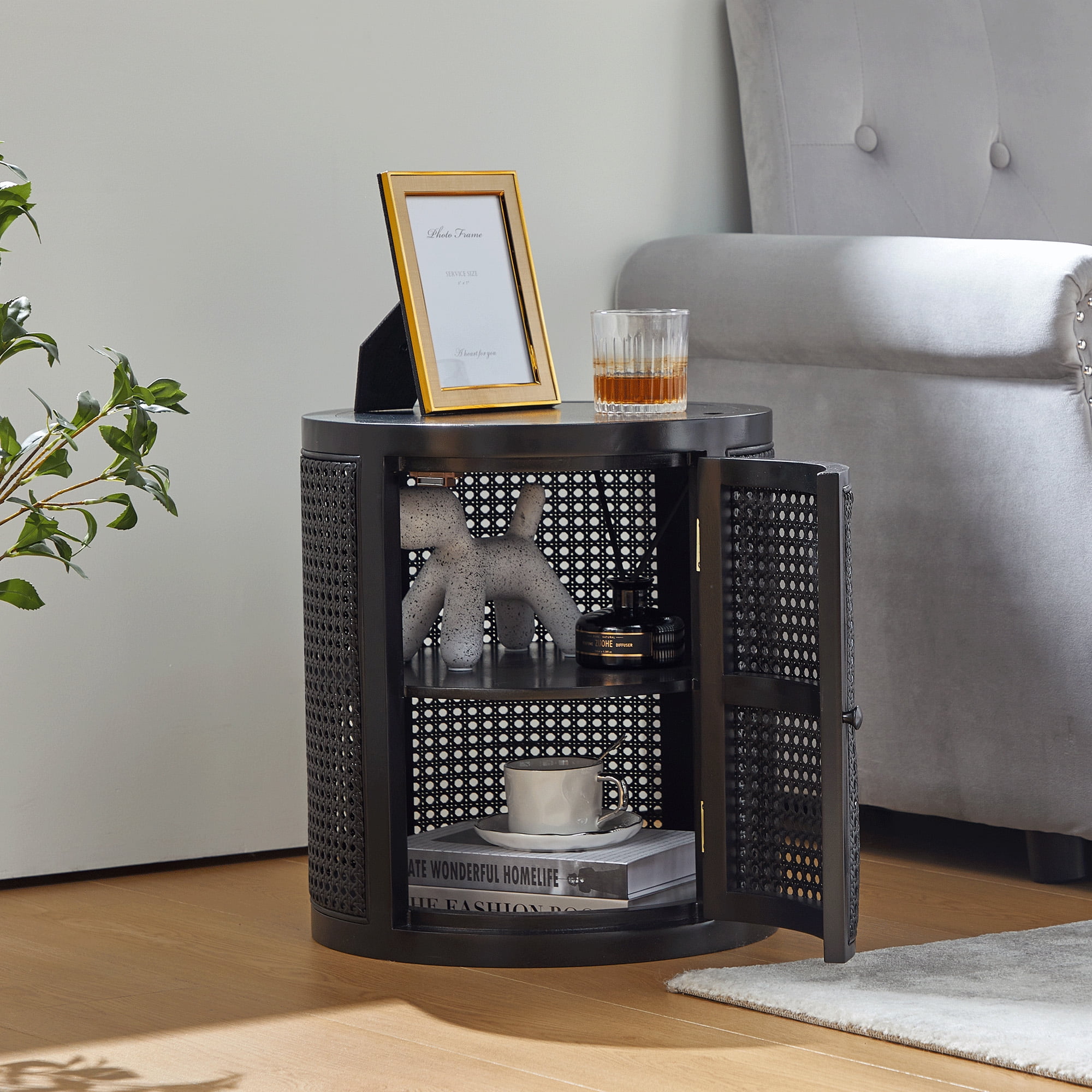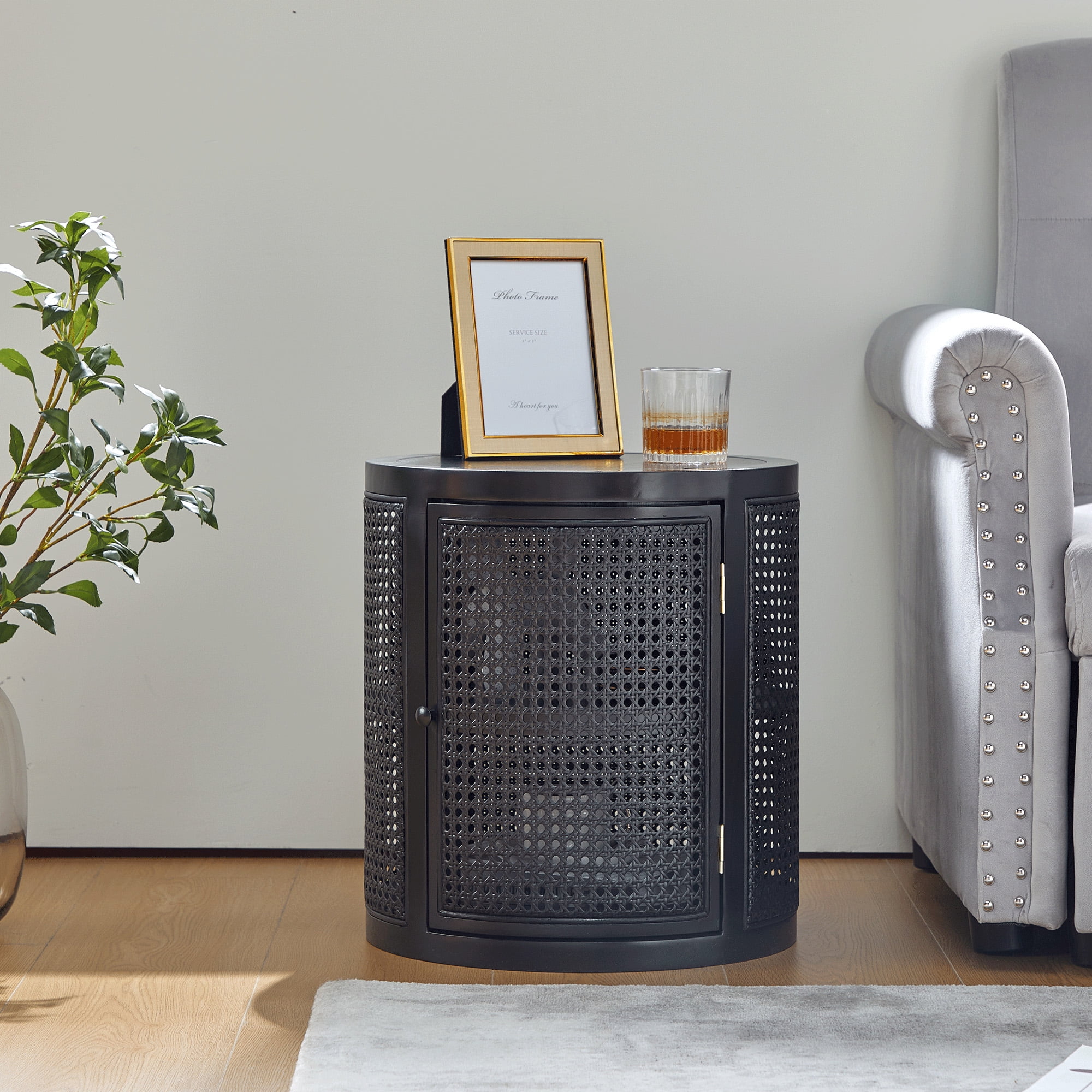 Giratree 15 Diameter Round End Table with Double Storage Cabinet Rattan Door for Living Room Small Space, Black
