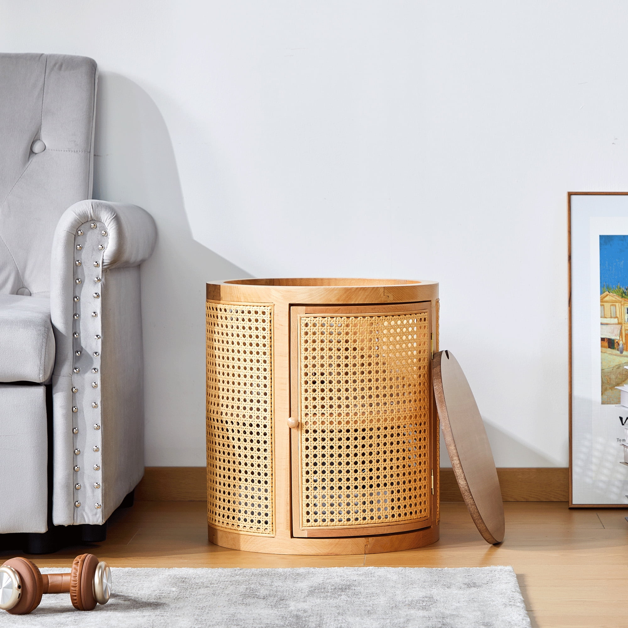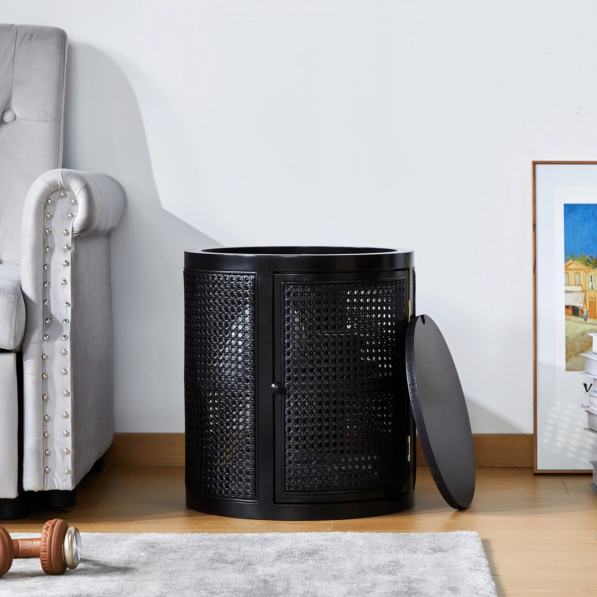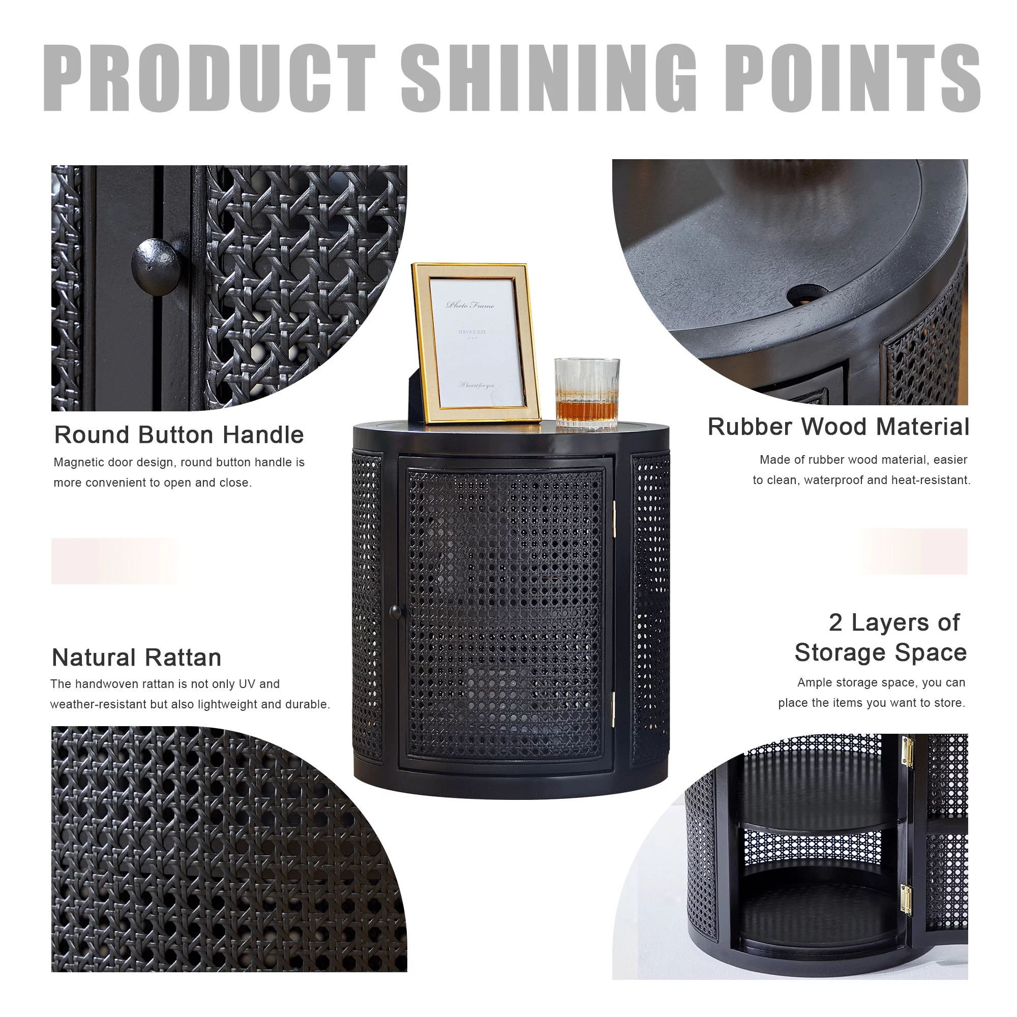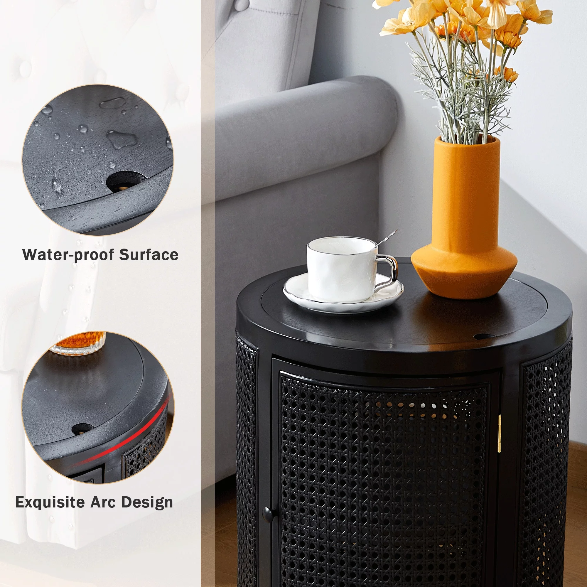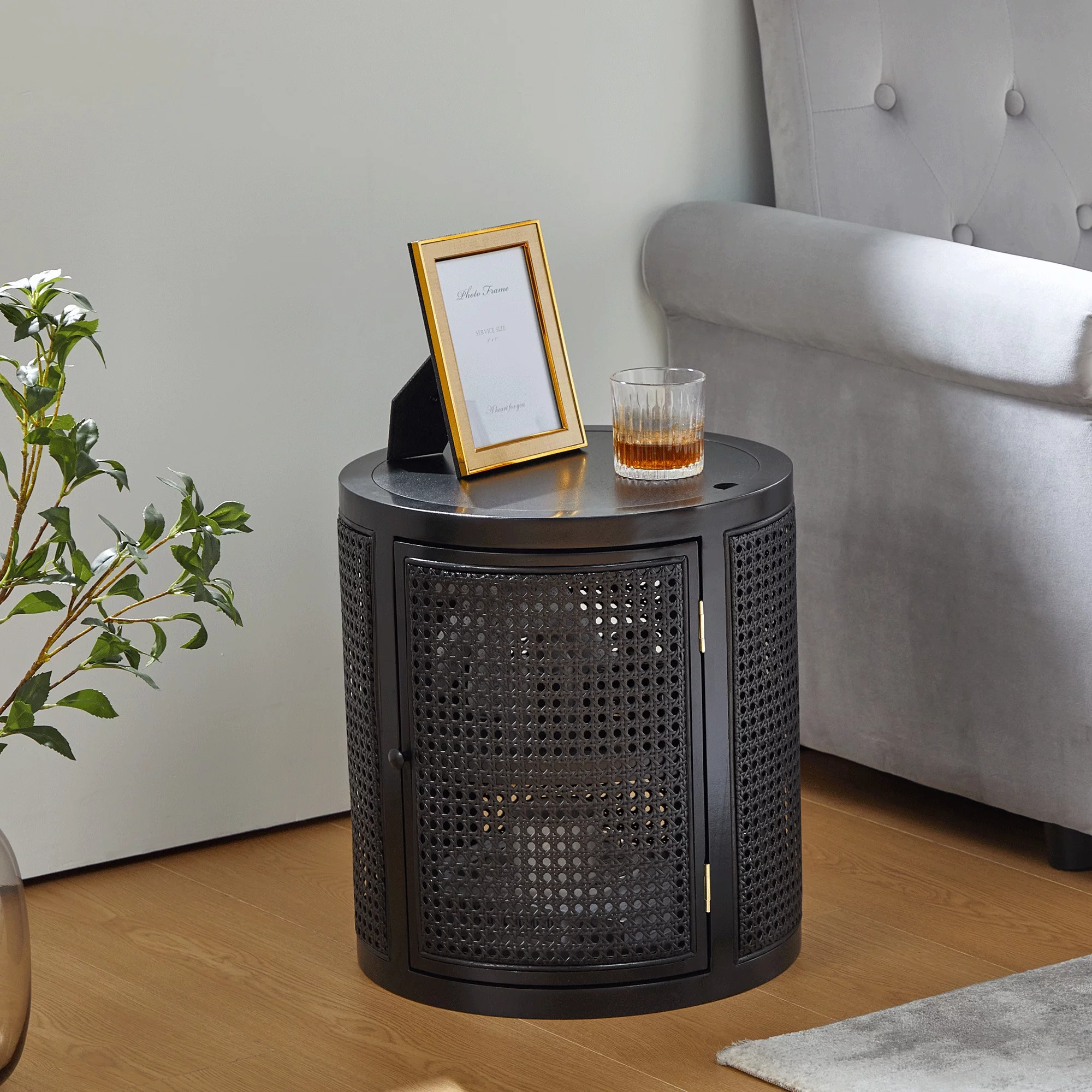 Giratree 15 Diameter Round End Table with Double Storage Cabinet Rattan Door for Living Room Small Space, Black