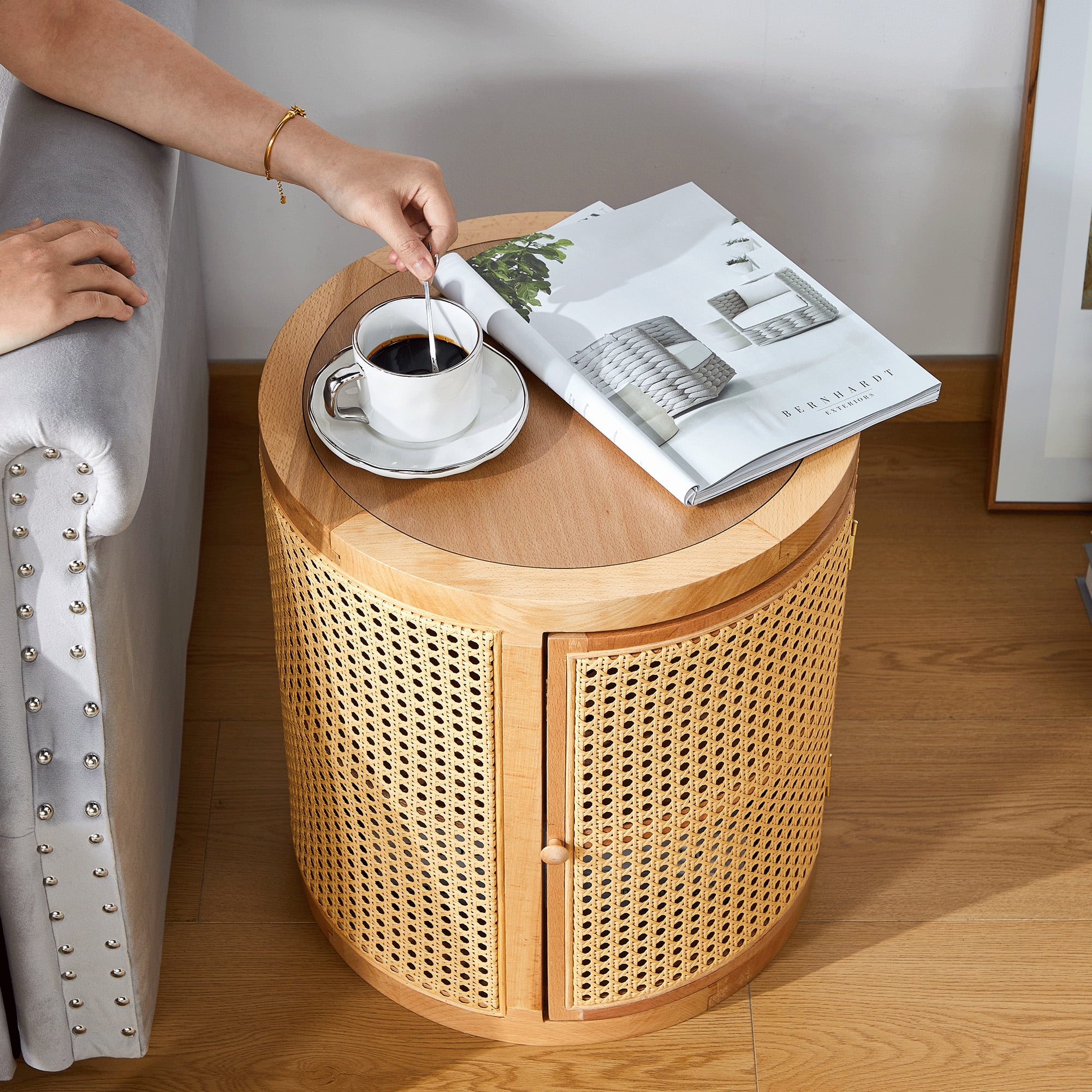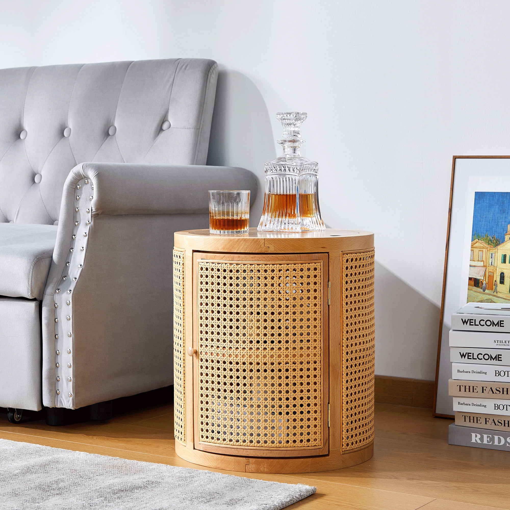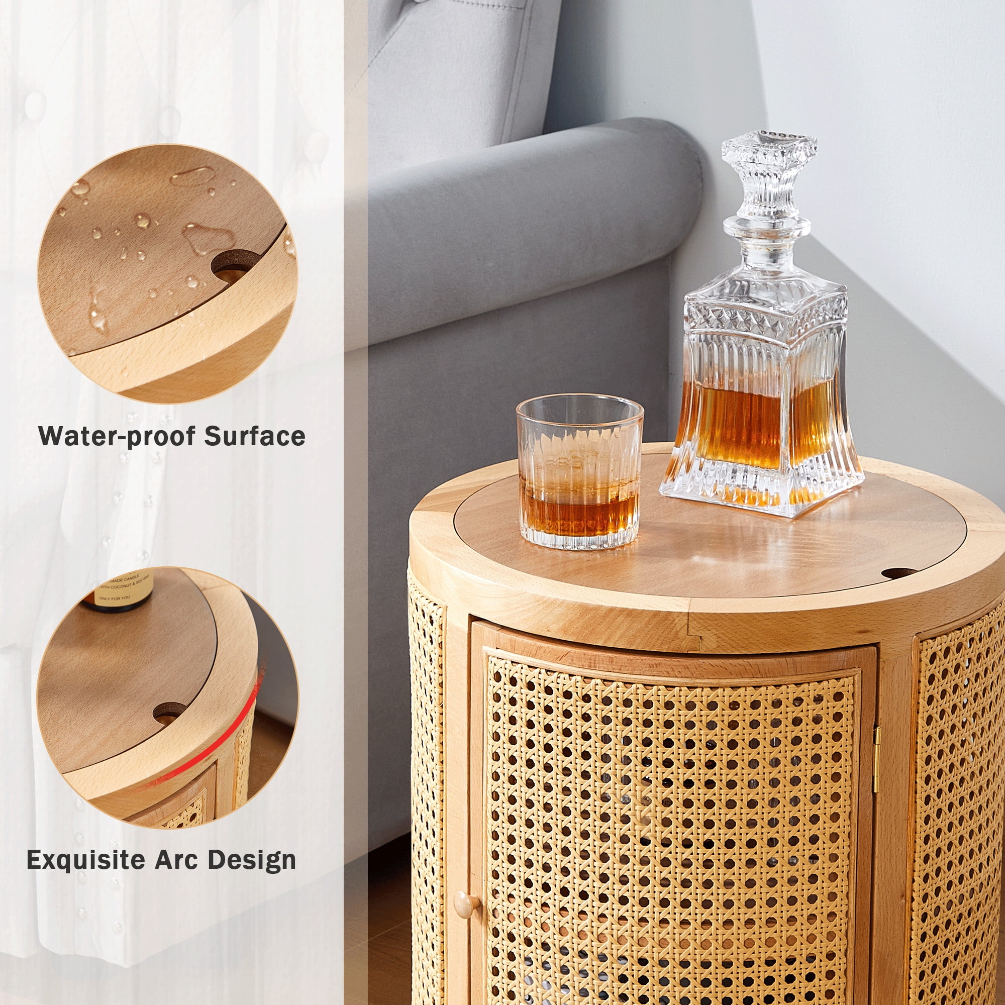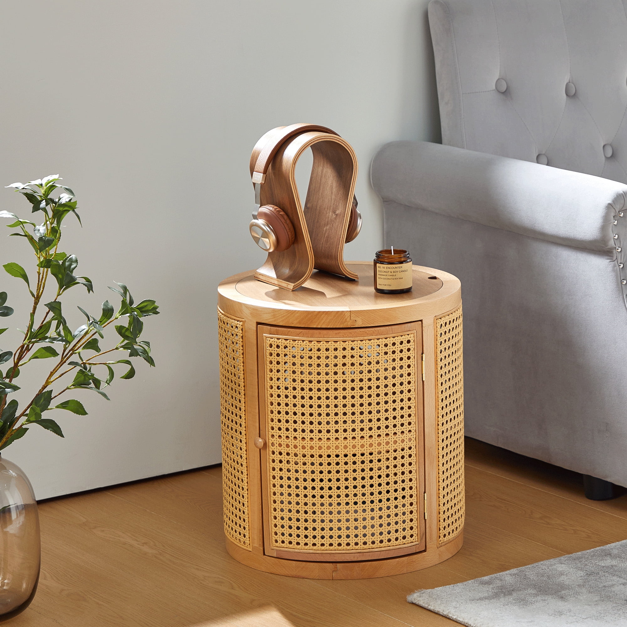 Giratree 15 Diameter Round End Table with Double Storage Cabinet Rattan Door for Living Room Small Space, Black