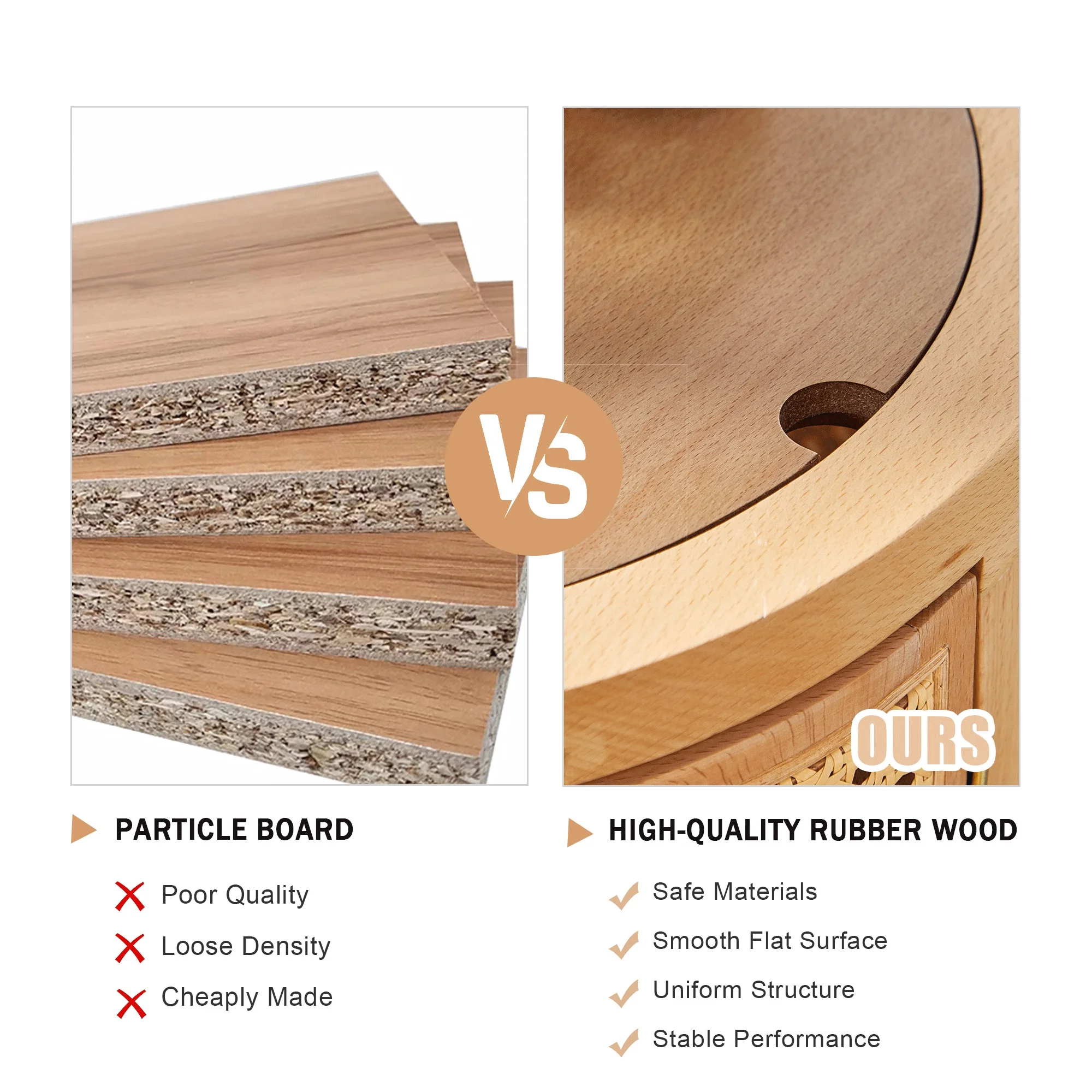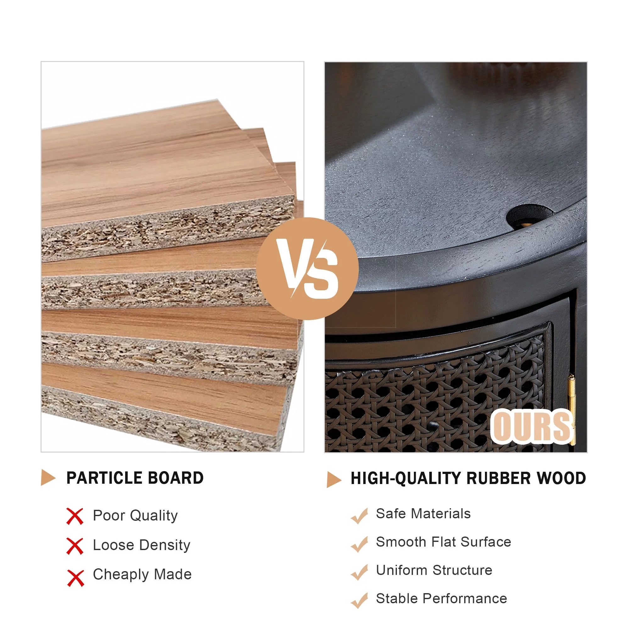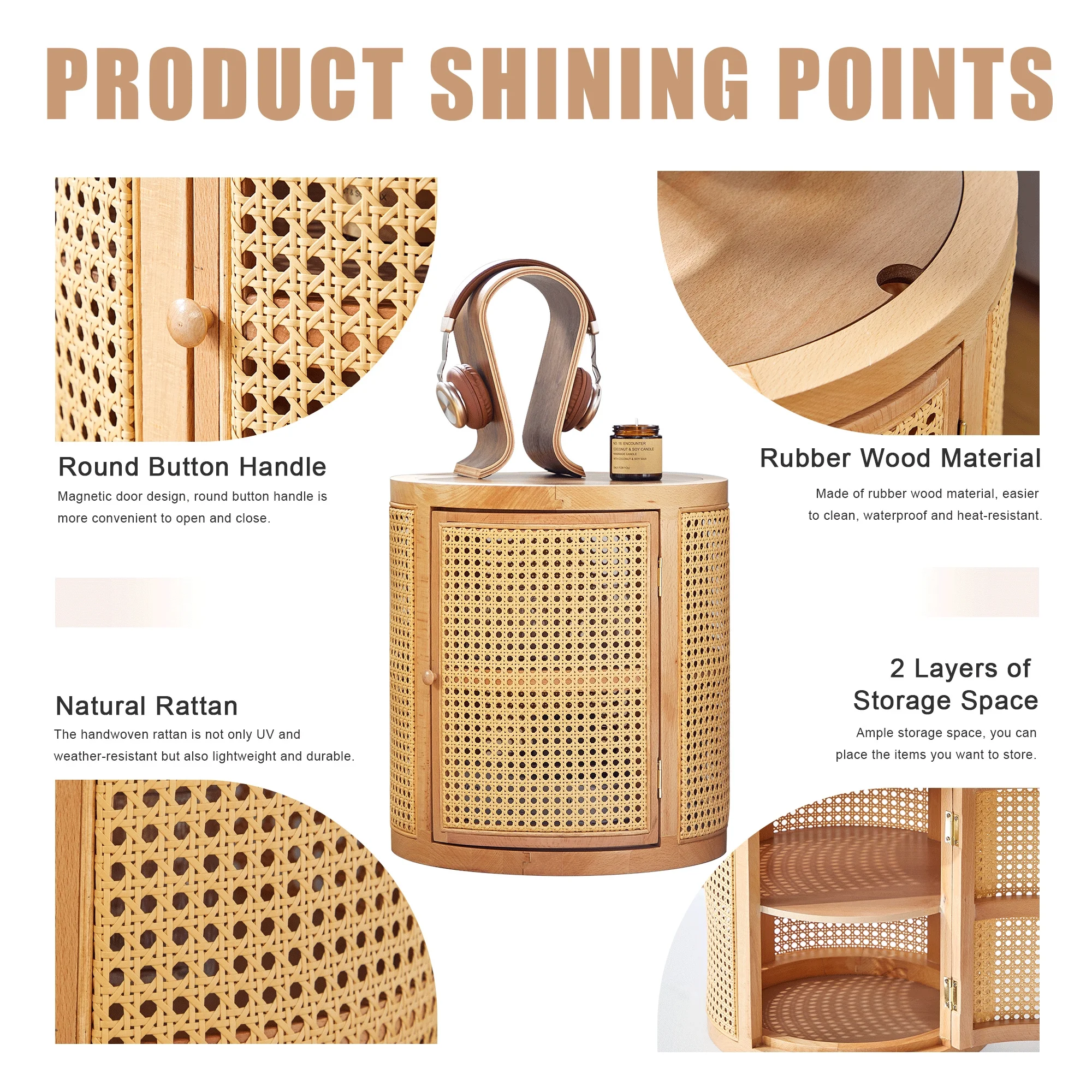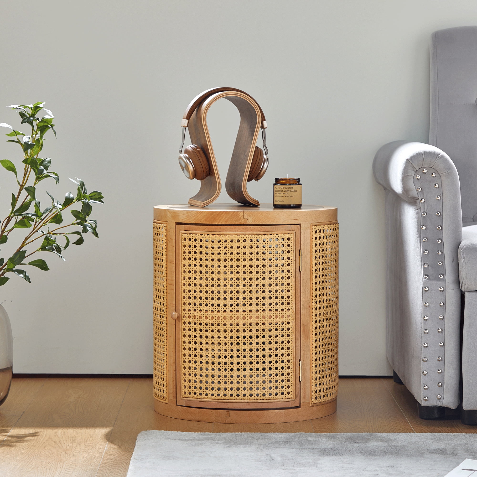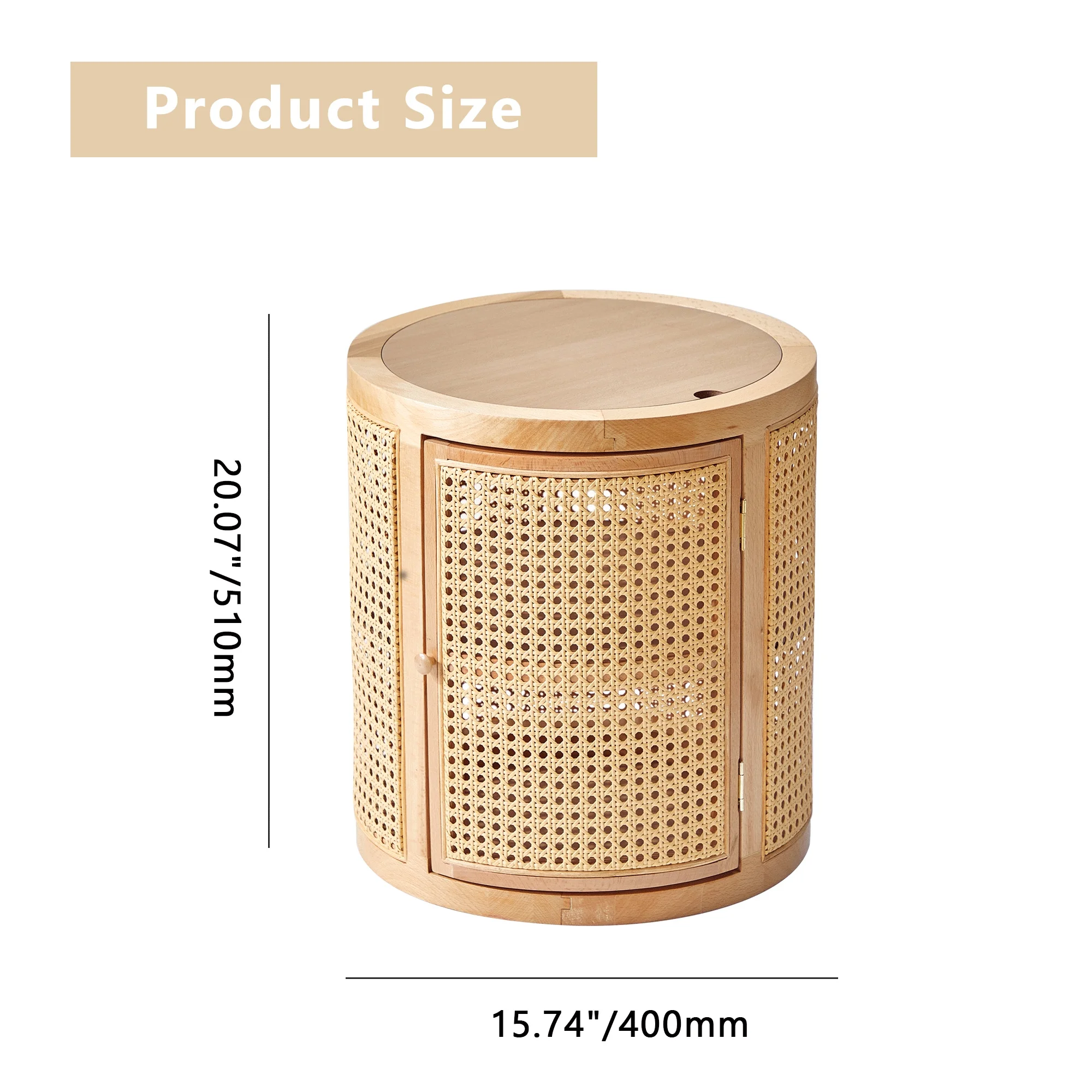 Giratree 15 Diameter Round End Table with Double Storage Cabinet Rattan Door for Living Room Small Space, Black