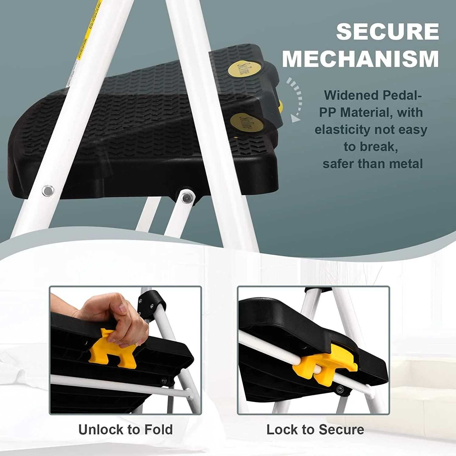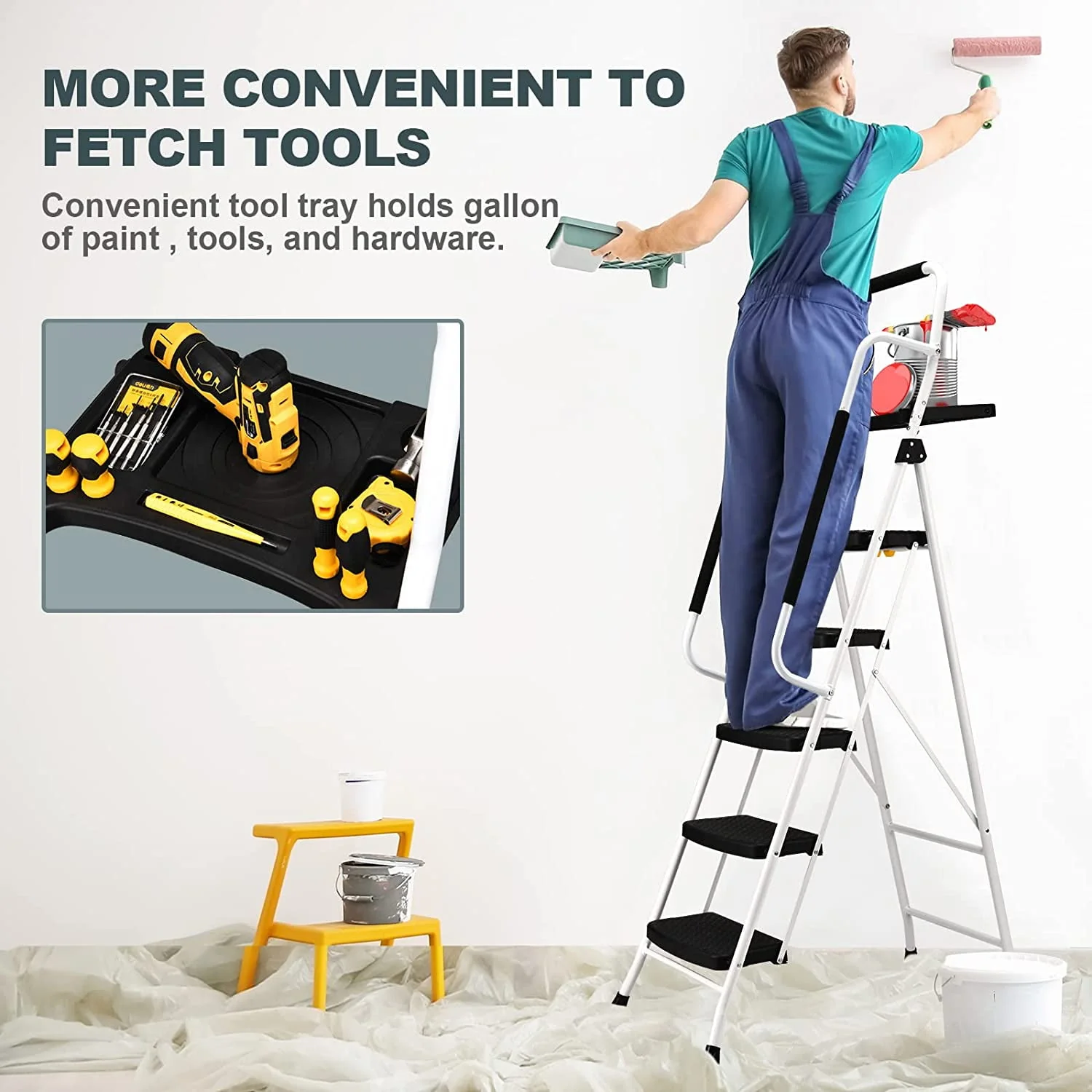HBTower Folding 5-Step Ladder, 330lbs, with Handrails and Tool Tray and Anti-Slip Pedal, White