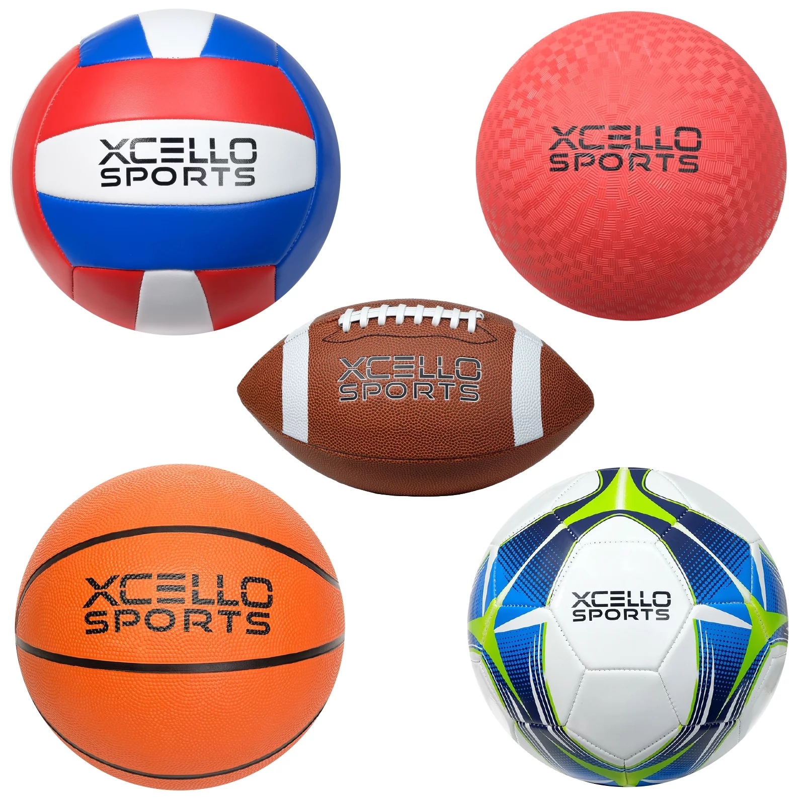 Xcello Sports Multi Sport 5 Ball Assortment, Football, Basketball, Soccer ball, Volleyball, and Kickball with Ball Pump and Carry Bag