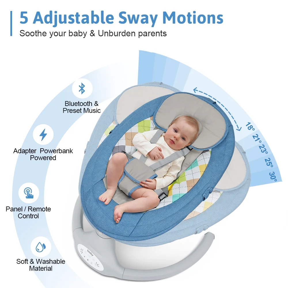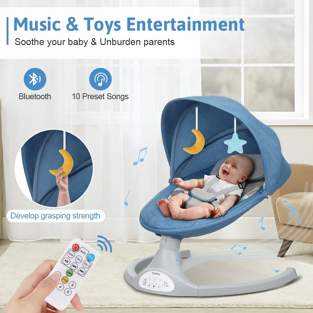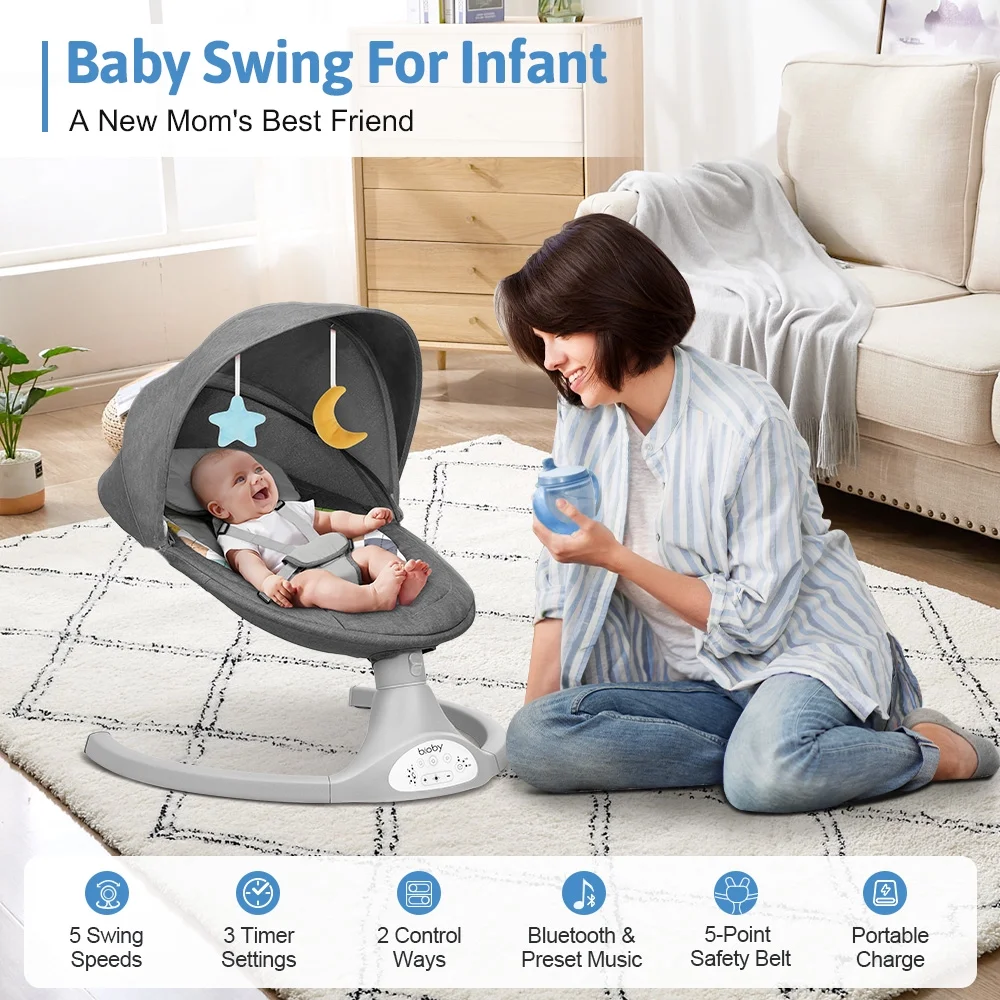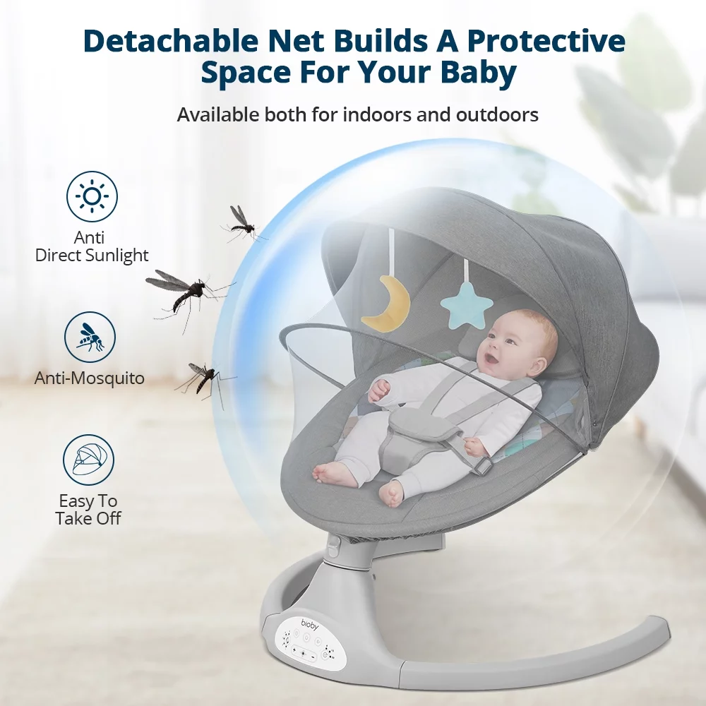 Electric Baby Swing, Bioby Infant Swing Chair Rocker with Remote Control, 5 Swing Speeds, Seat Belt, Bluetooth Music, Grey