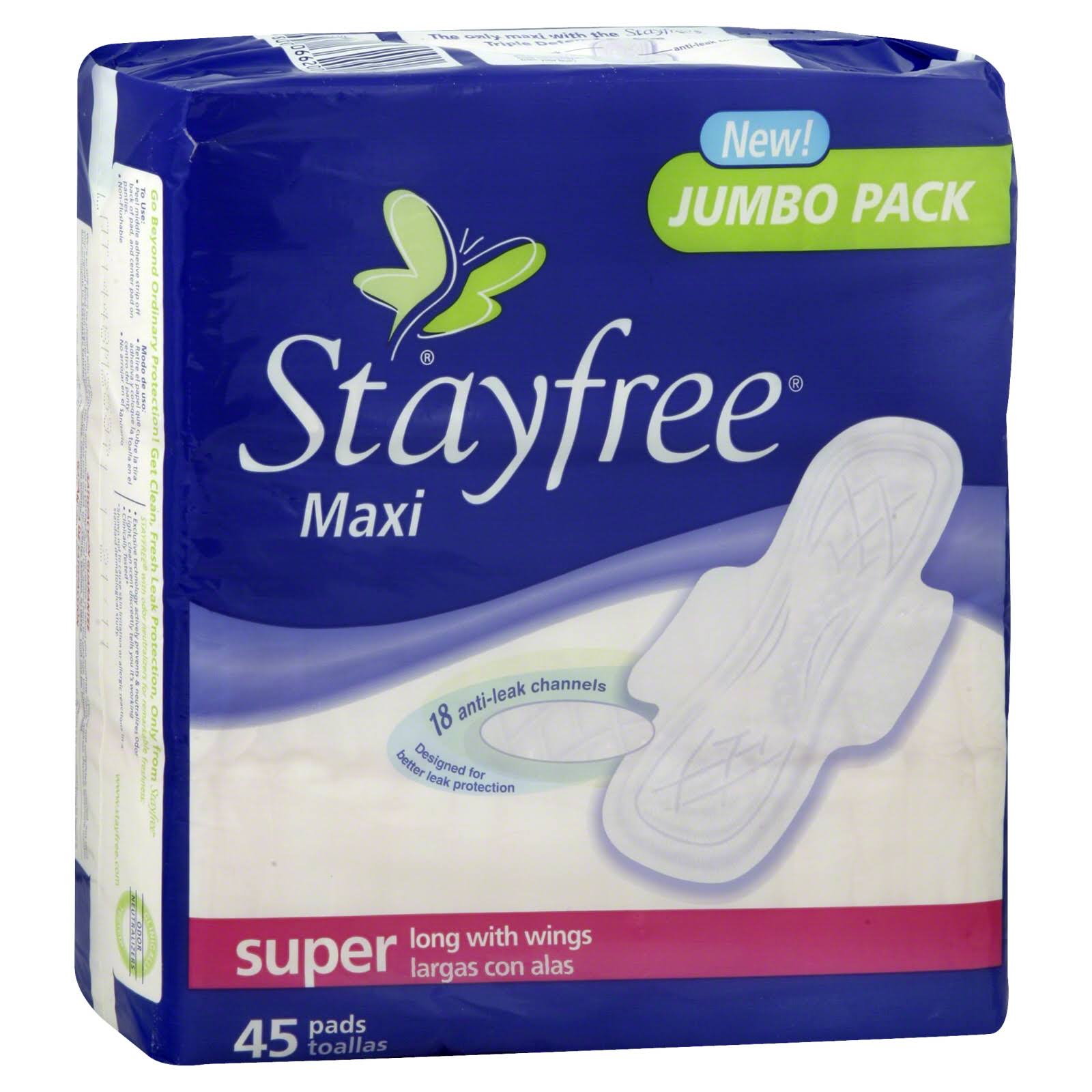 Stayfree Maxi Pads, Super Long with Wings, Jumbo Pack - 45 count - Megean