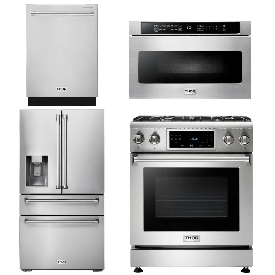 Thor Kitchen Package - 30 Gas Range, Microwave, Refrigerator with Water and Ice Dispenser, Dishwasher, AP-TRG3001-12