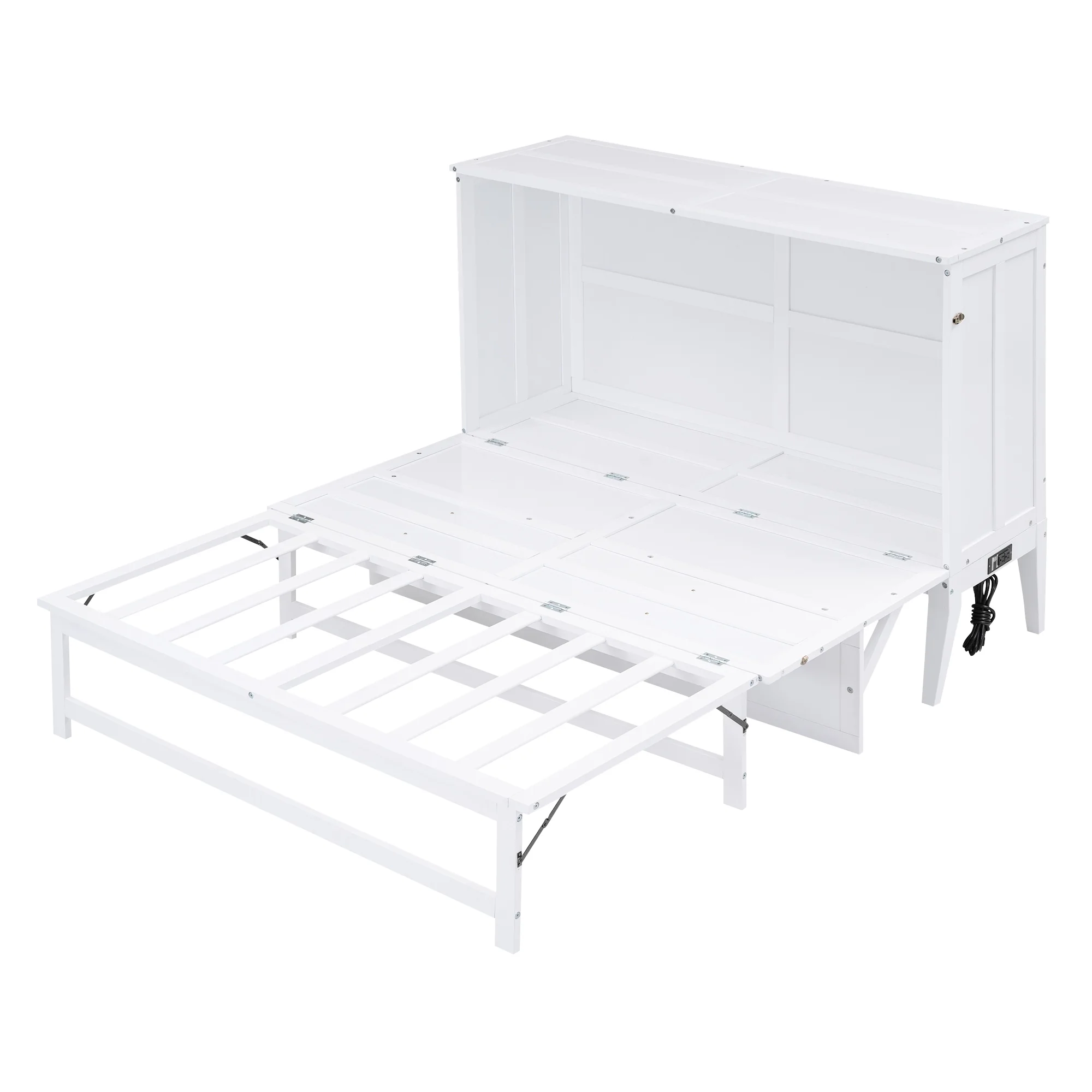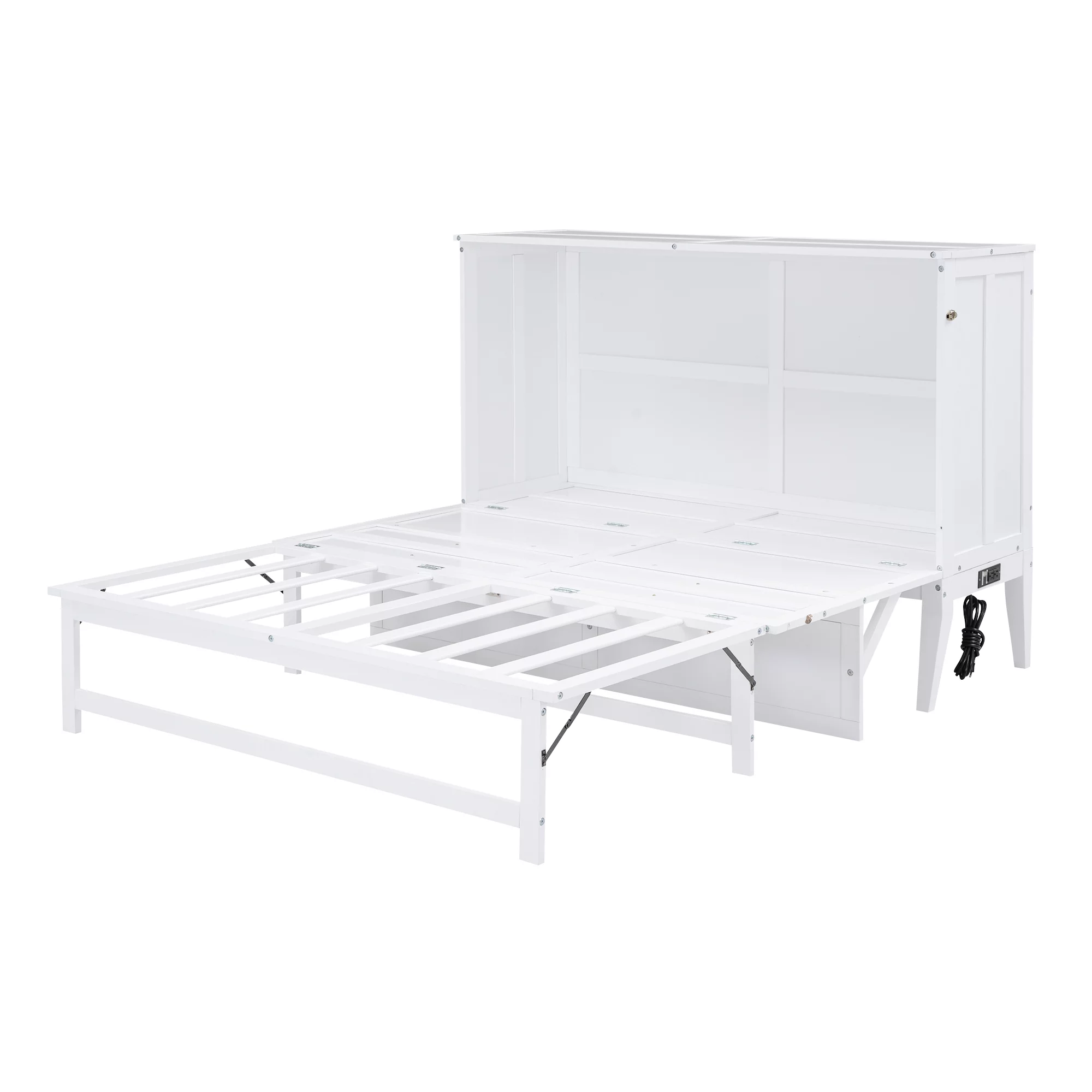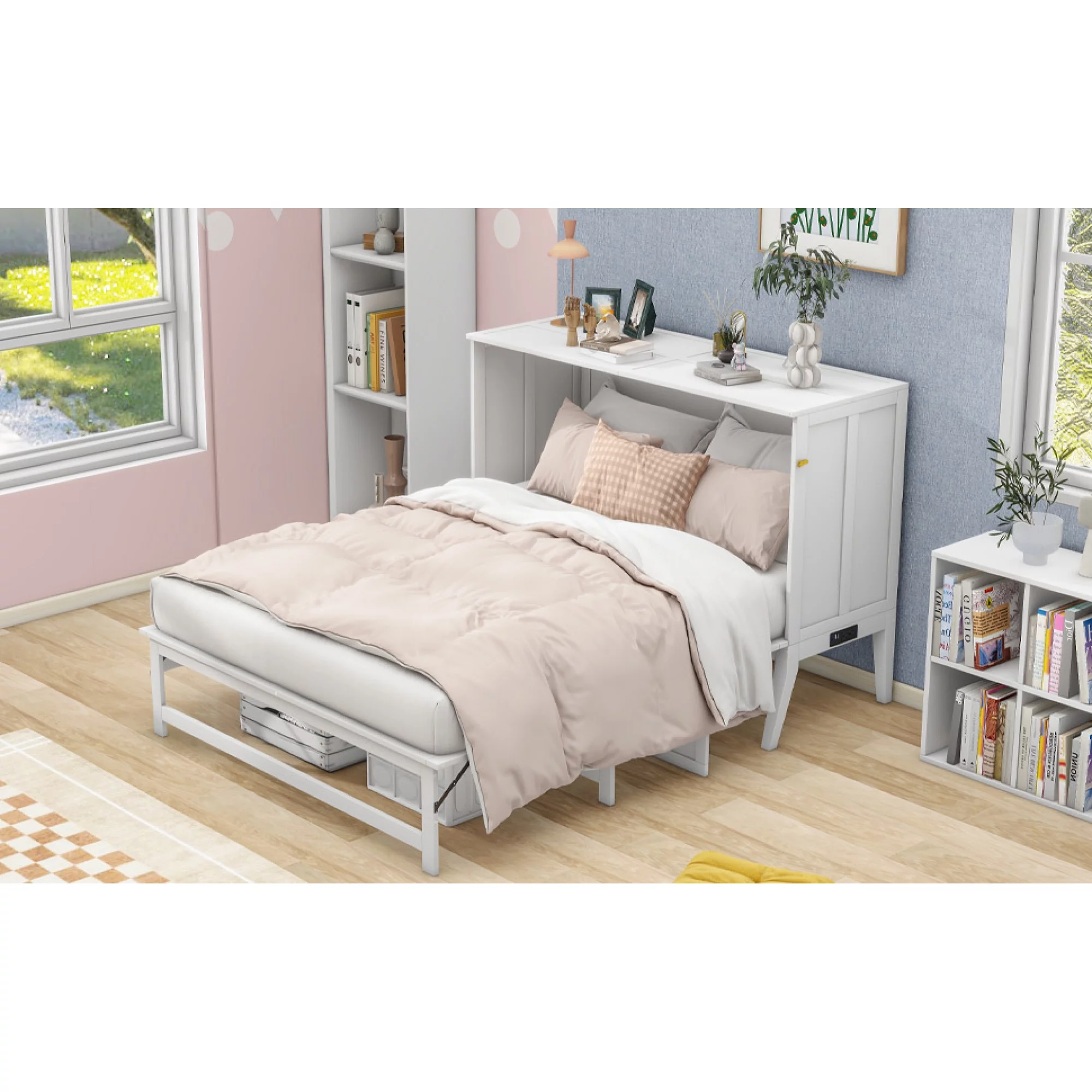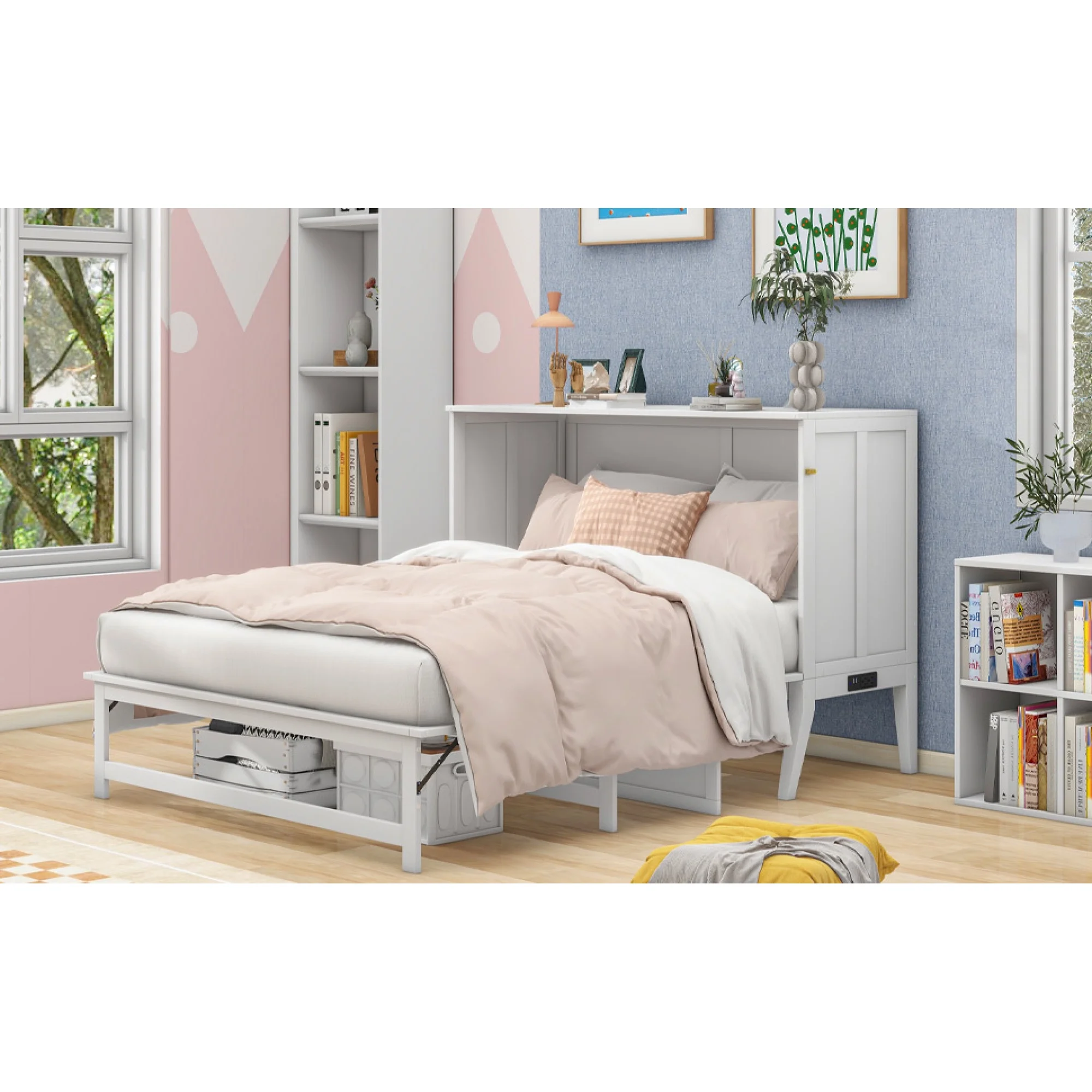 Queen Size Murphy Bed with Built-In Charging Station and a Shelf, White