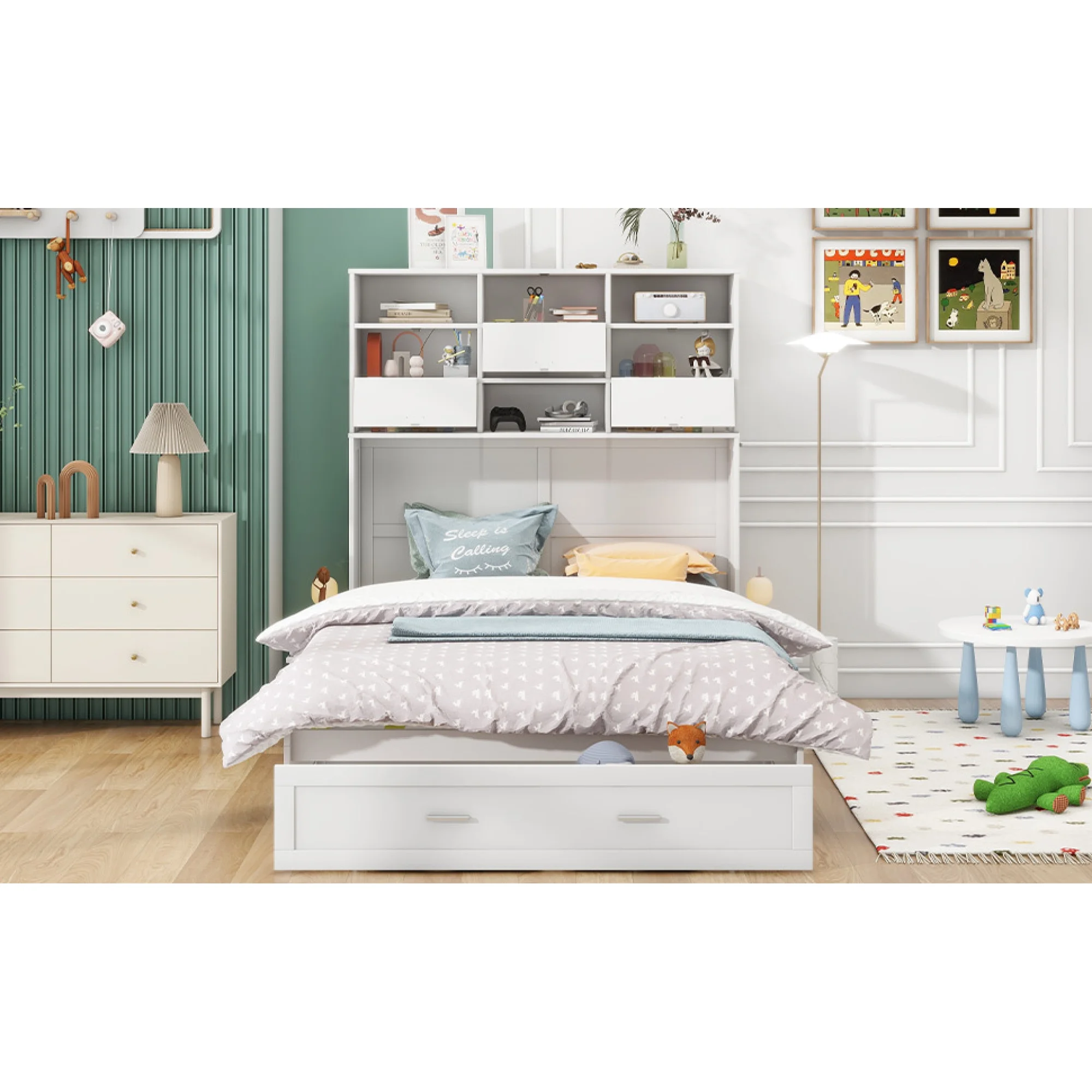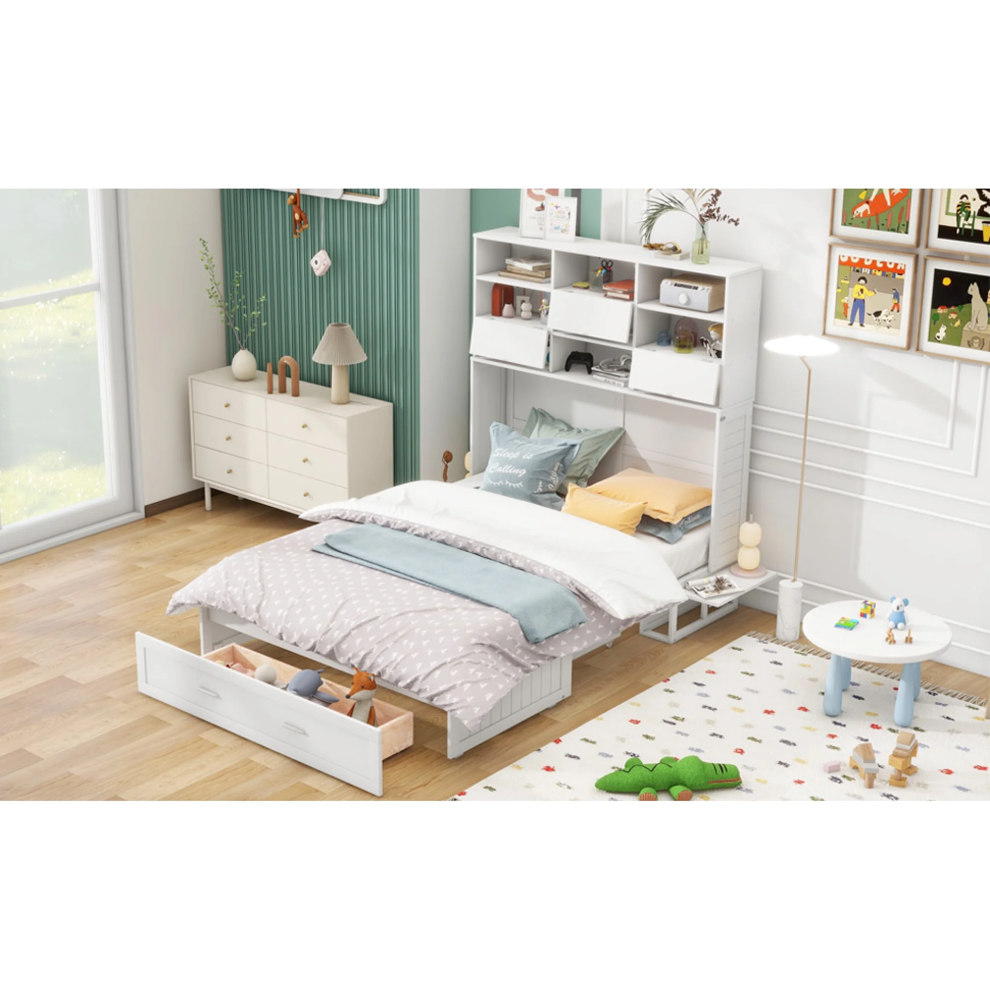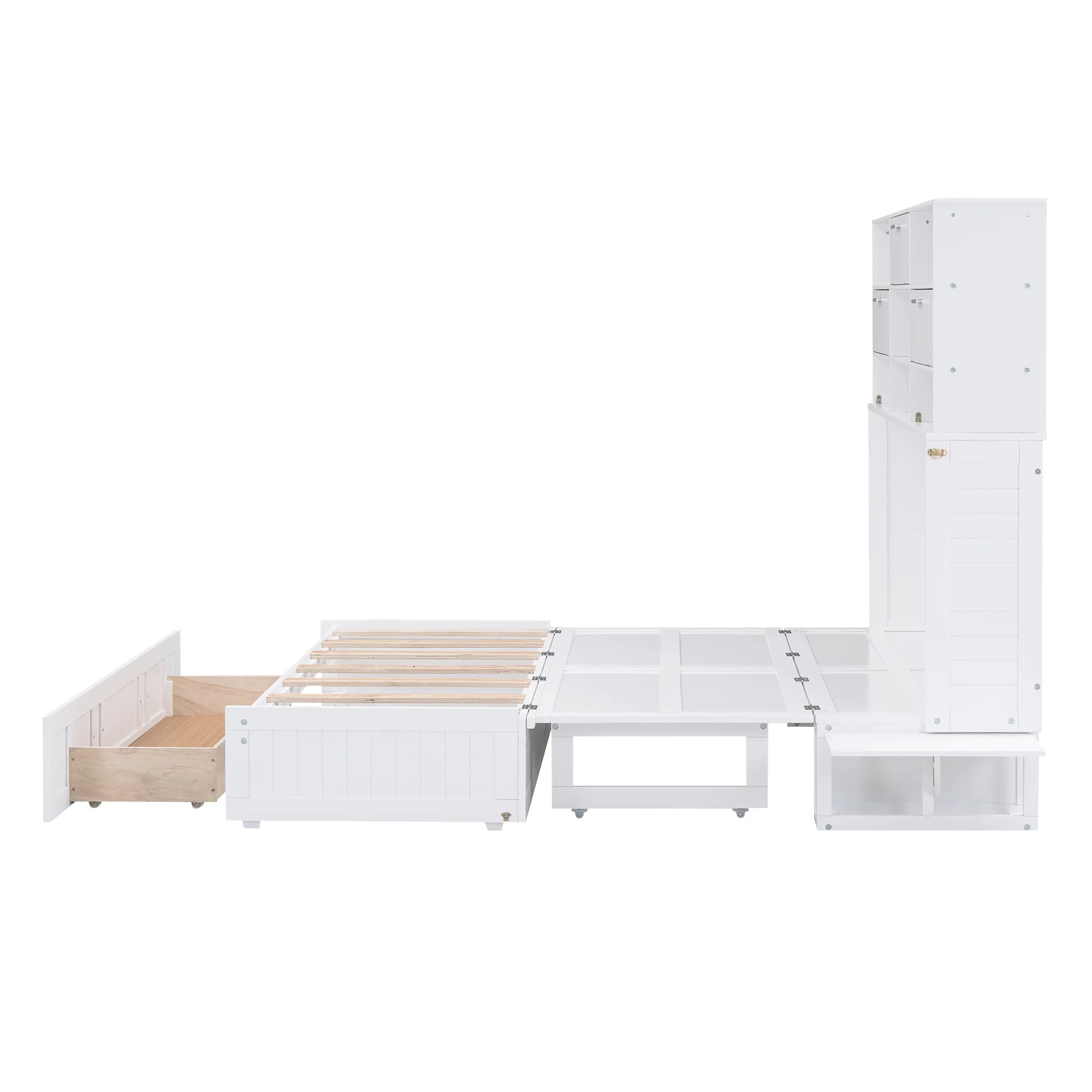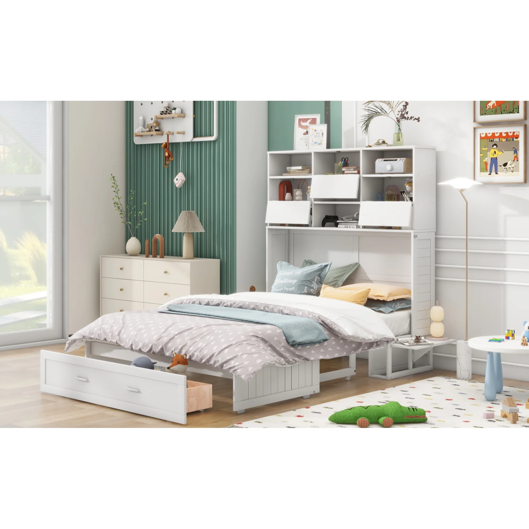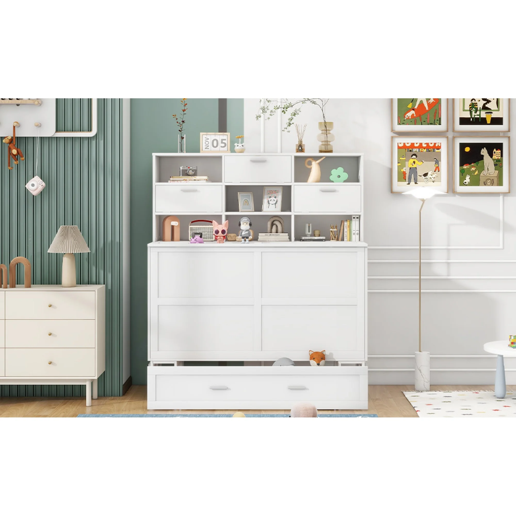 Queen Size Murphy Bed with Built-In Charging Station and a Shelf, White
