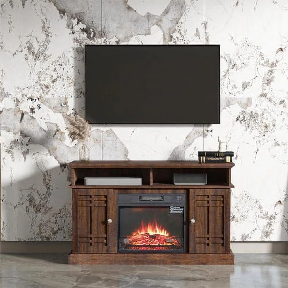 KINFFICT 47.6 Fireplace TV Stand. Safe Electronic Heating TV Cabinet for 55 TV. Farmhouse Media Console. Entertainment Center for Living Room. Antique Brown