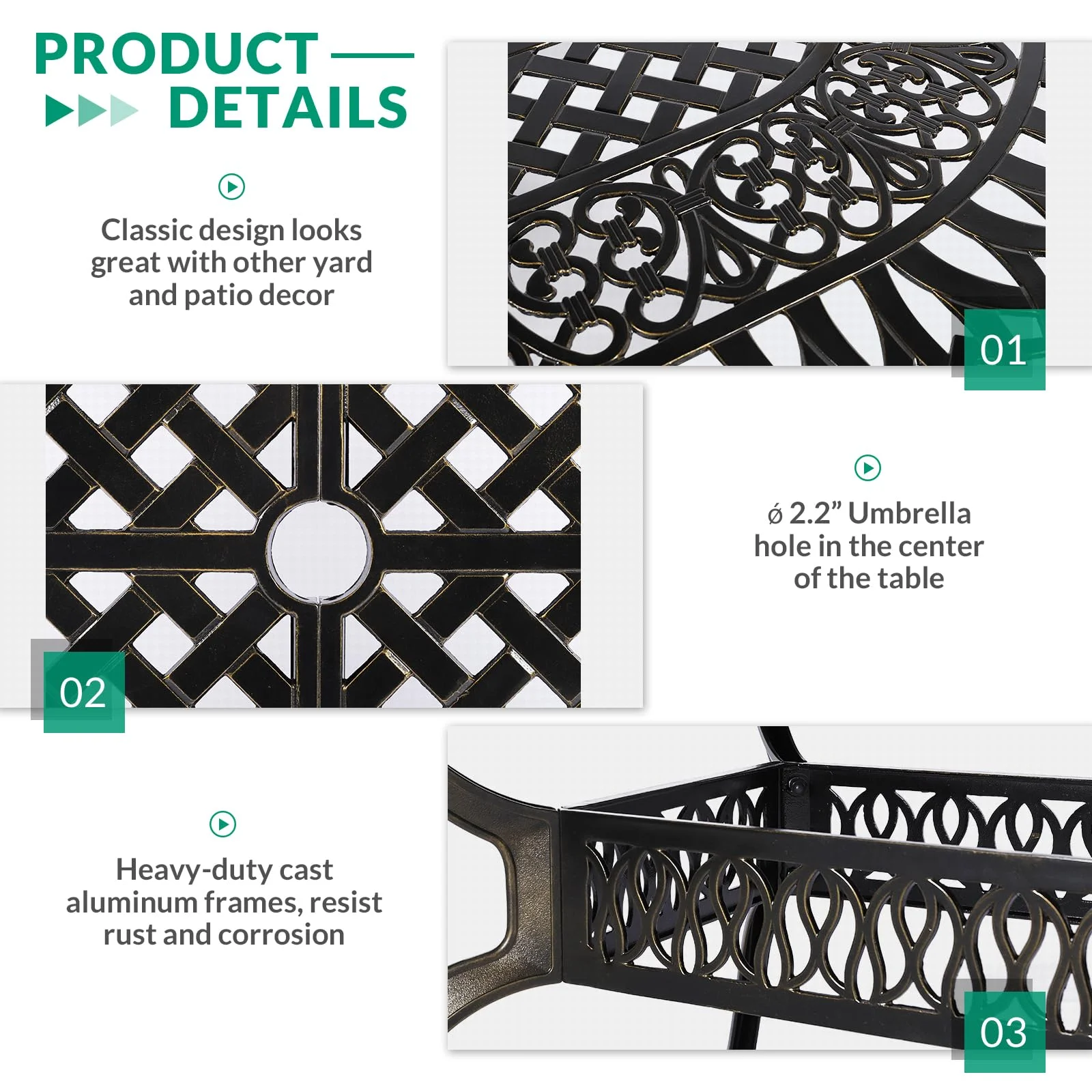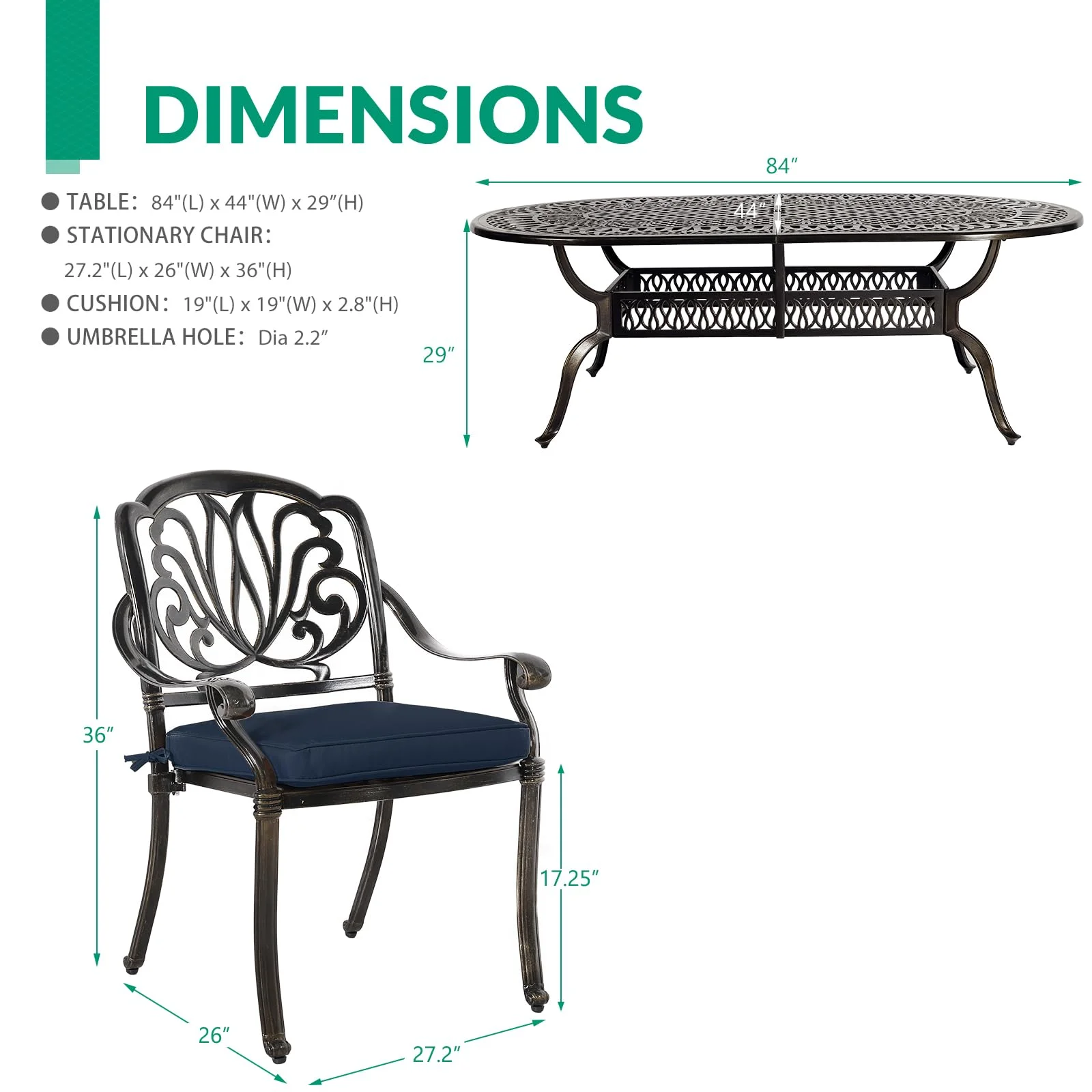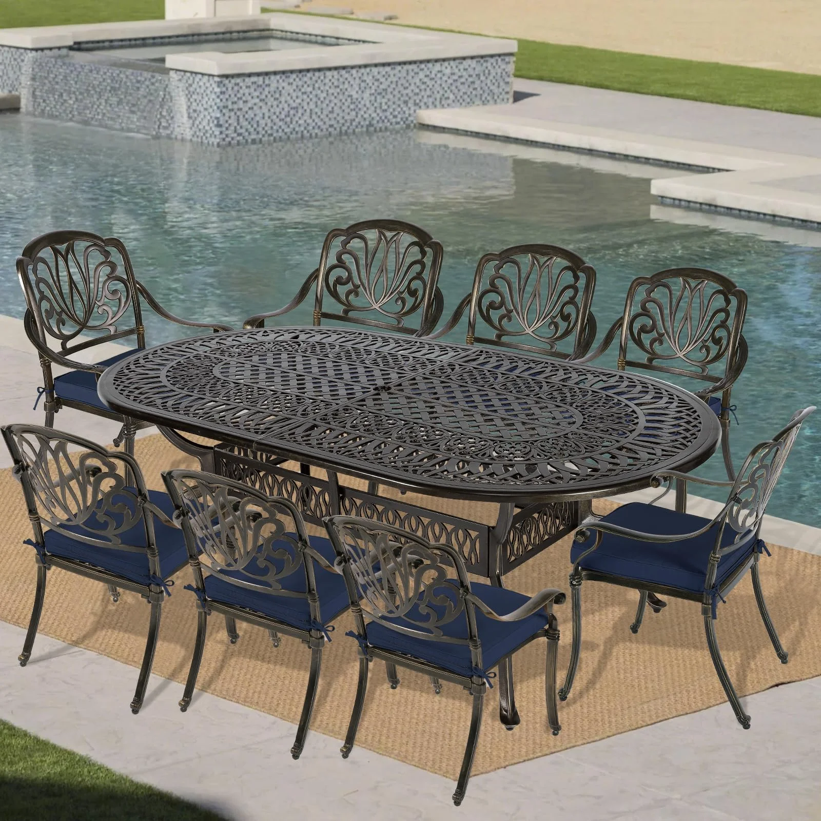 VIVIJASON 9-Piece Outdoor Furniture Dining Set, All-Weather Cast Aluminum Patio Conversation Set, Include 8 Cushioned Chairs and an Oval Table with Umbrella Hole for Lawn Backyard, Navy Blue Cushion - Curated Treasures Market