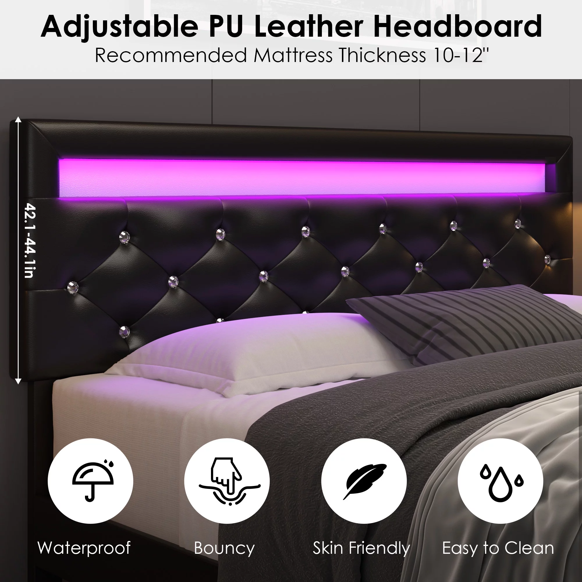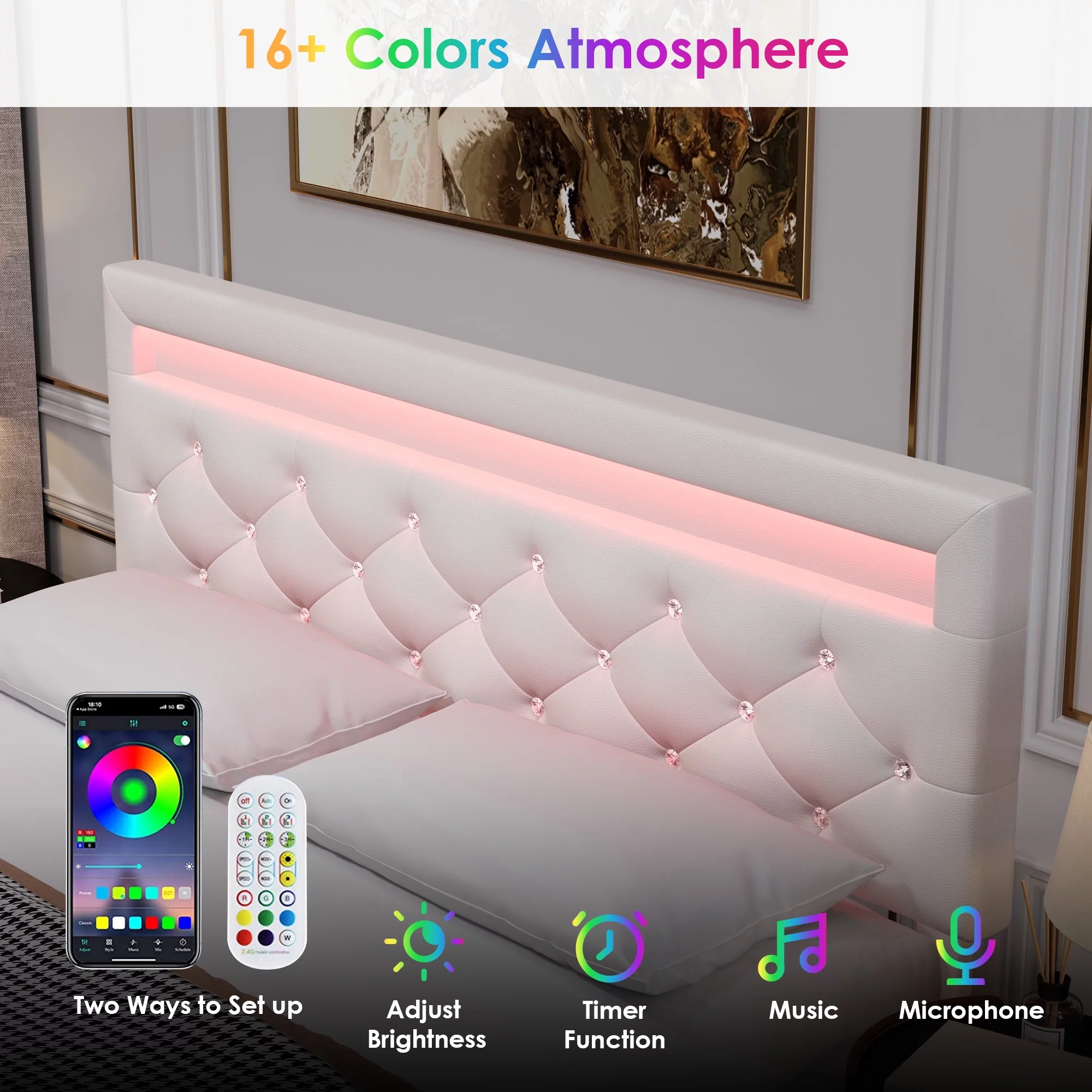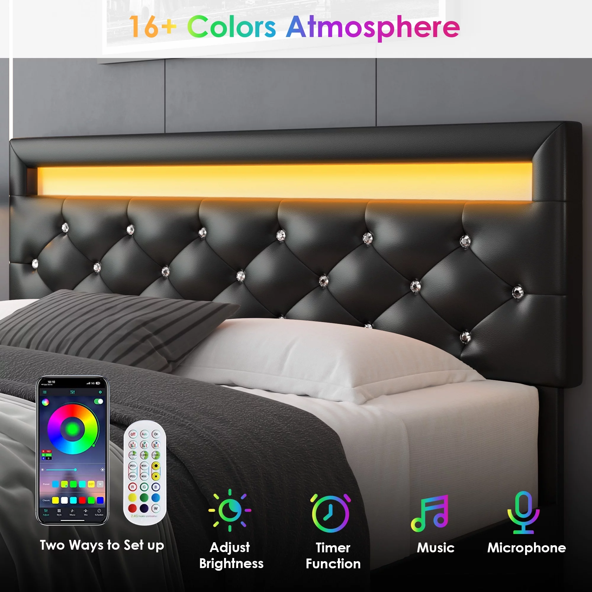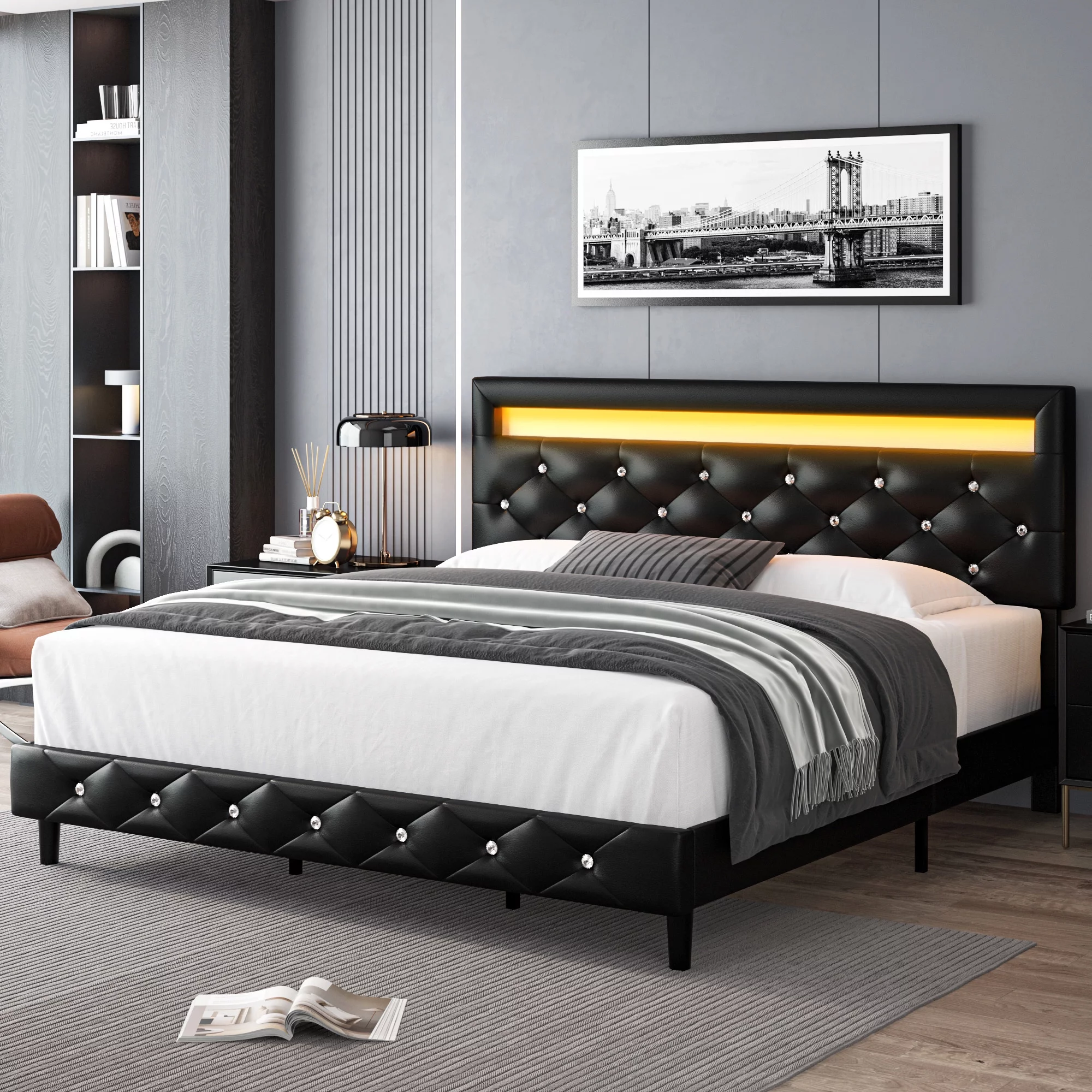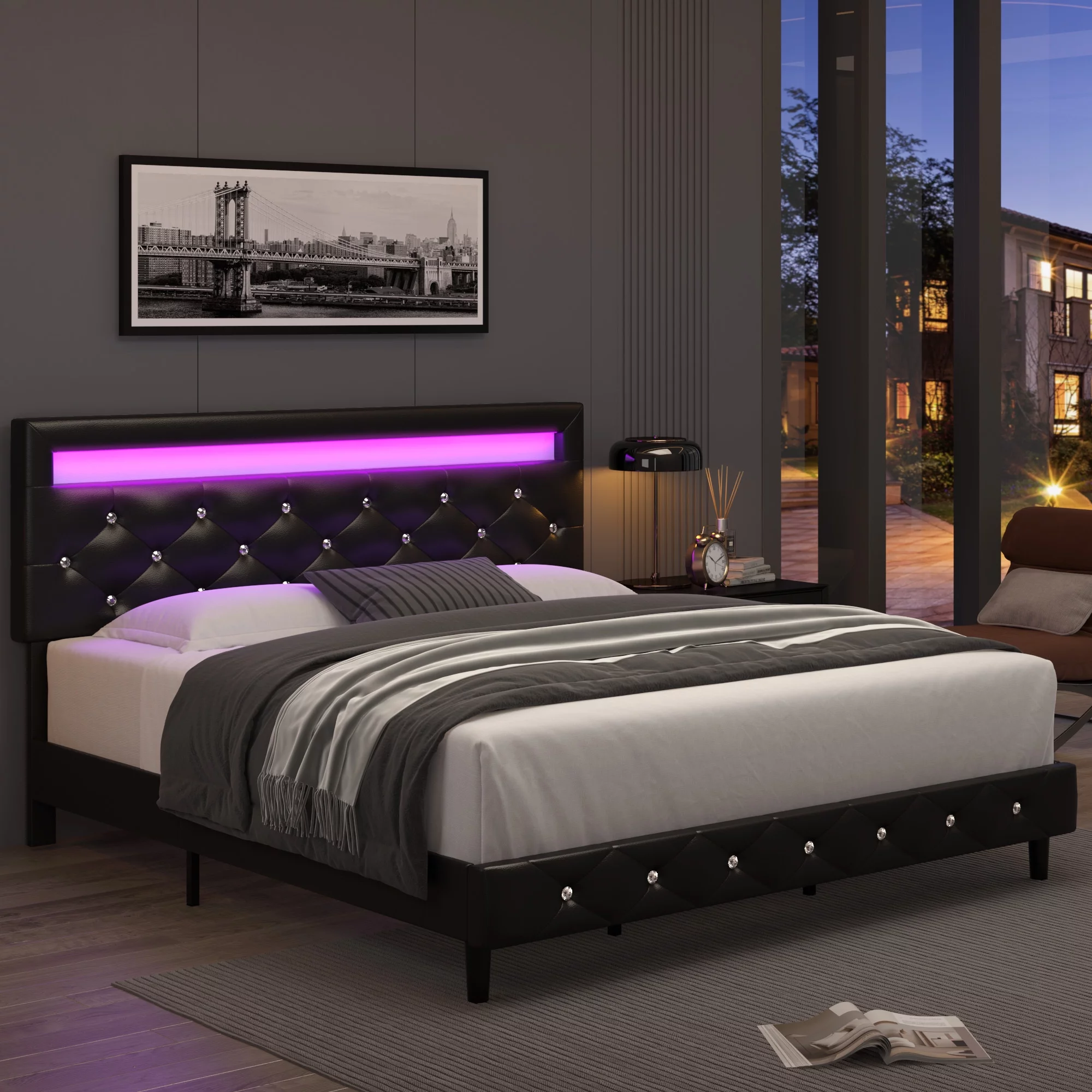 Homfa Queen Size LED Bed, PU Crystal Buckle Upholstered Platform Bed Frame with Adjustable Headboard, Black