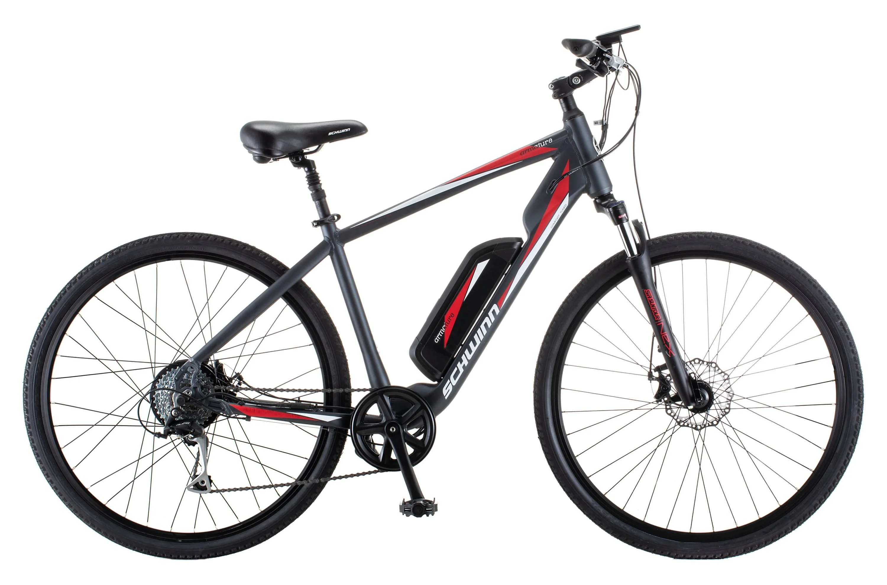 Schwinn 700c Armature Unisex Electric Bike, Black and Red Ebike for Adults, Large Frame