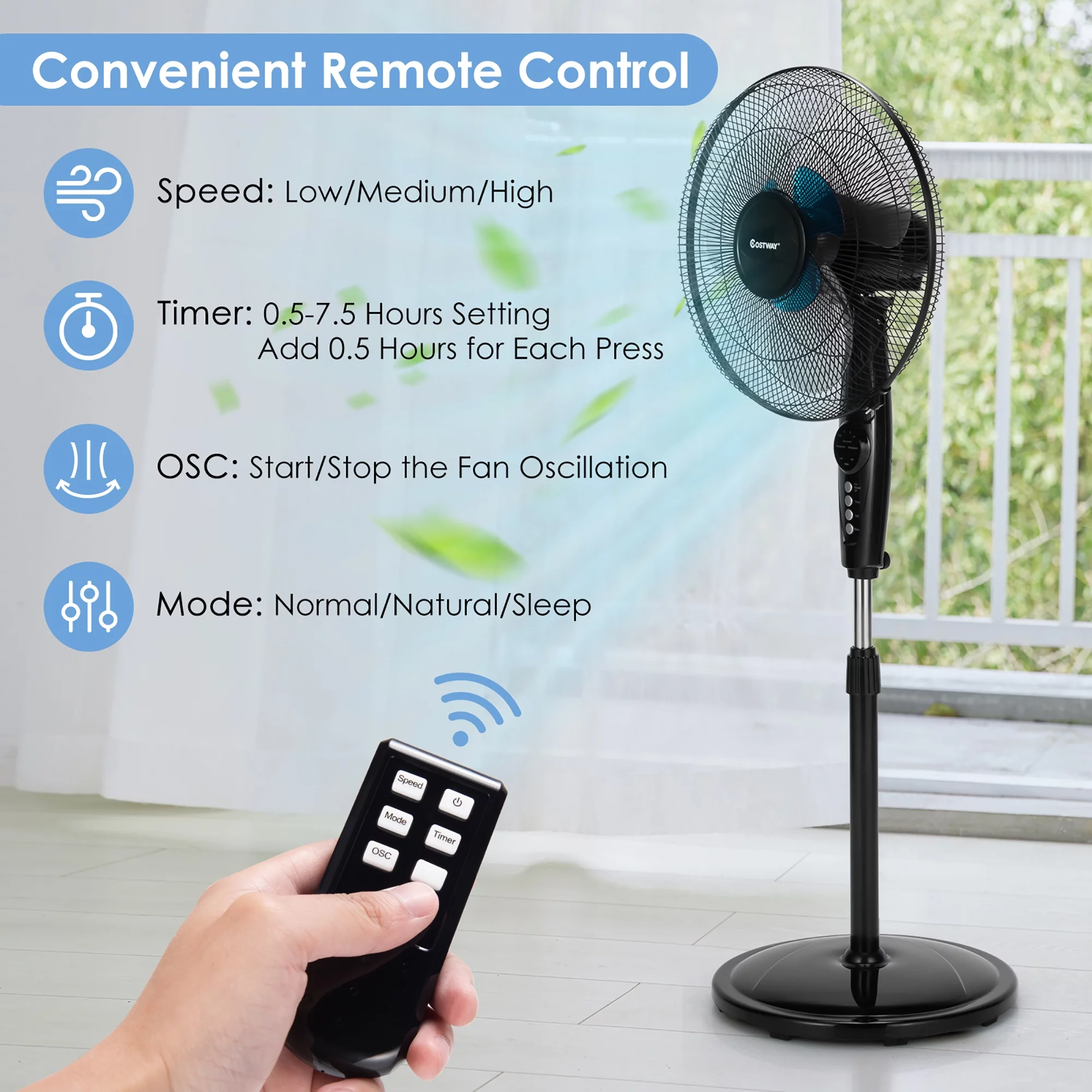 Costway 16'' Adjustable Oscillating Pedestal Fan Dual Blades w/Remote Control
