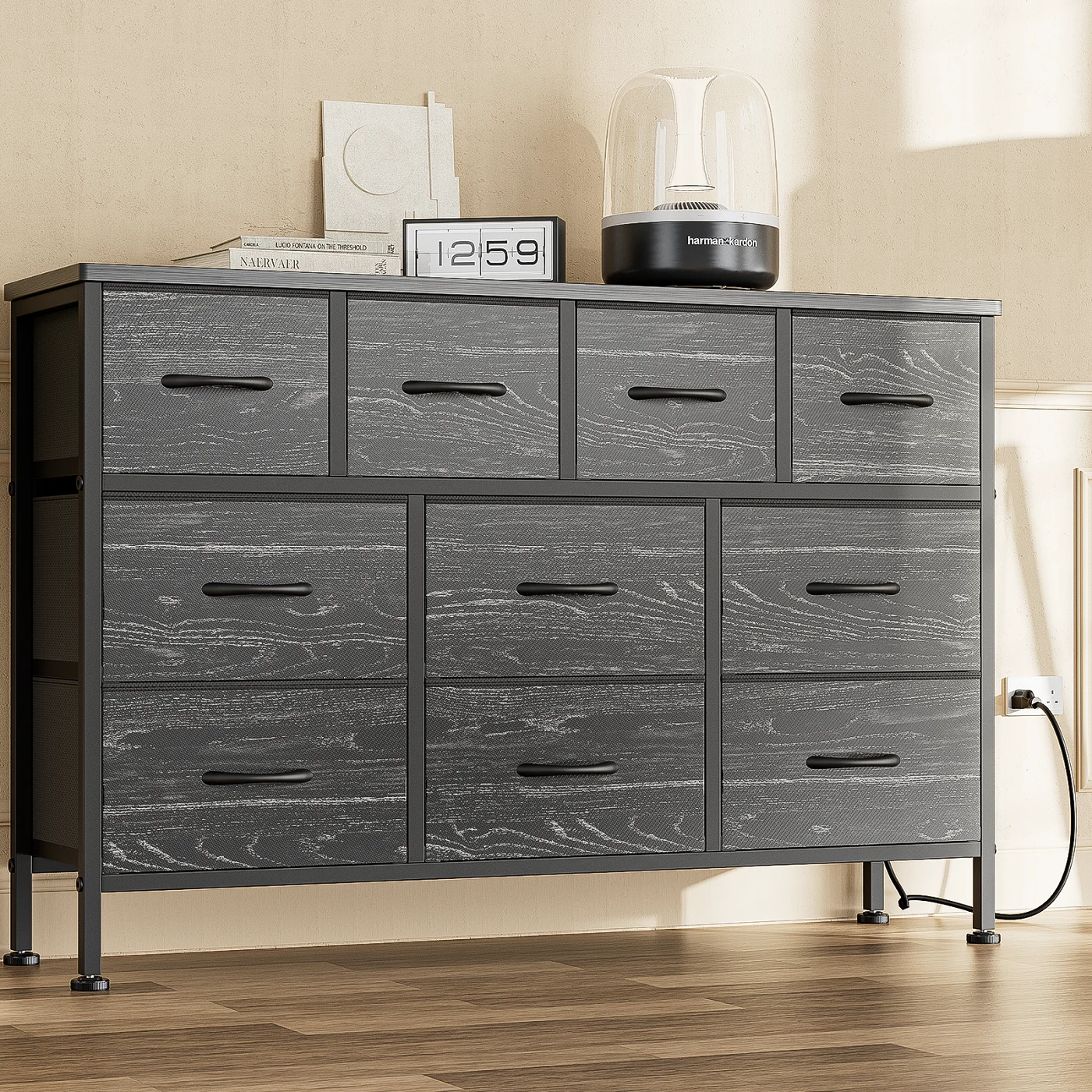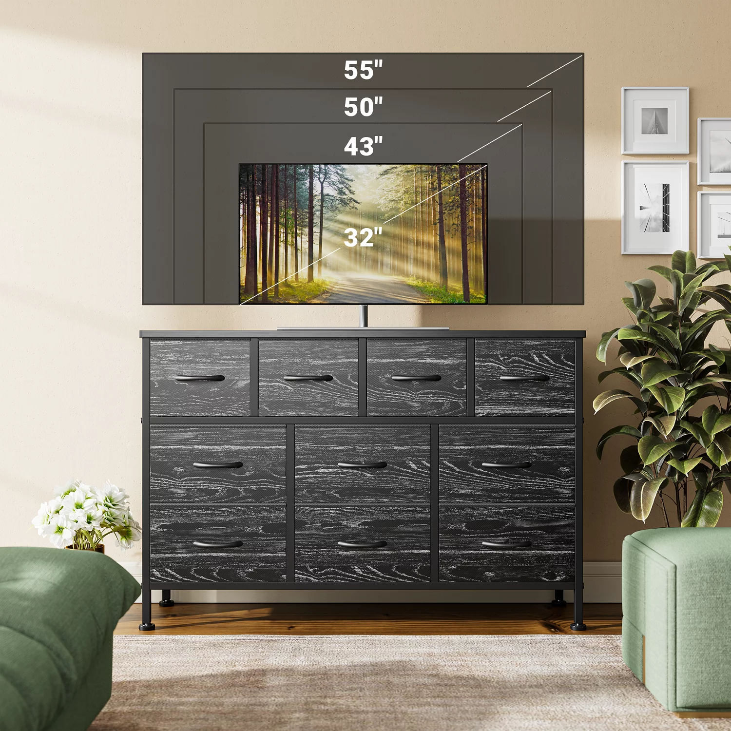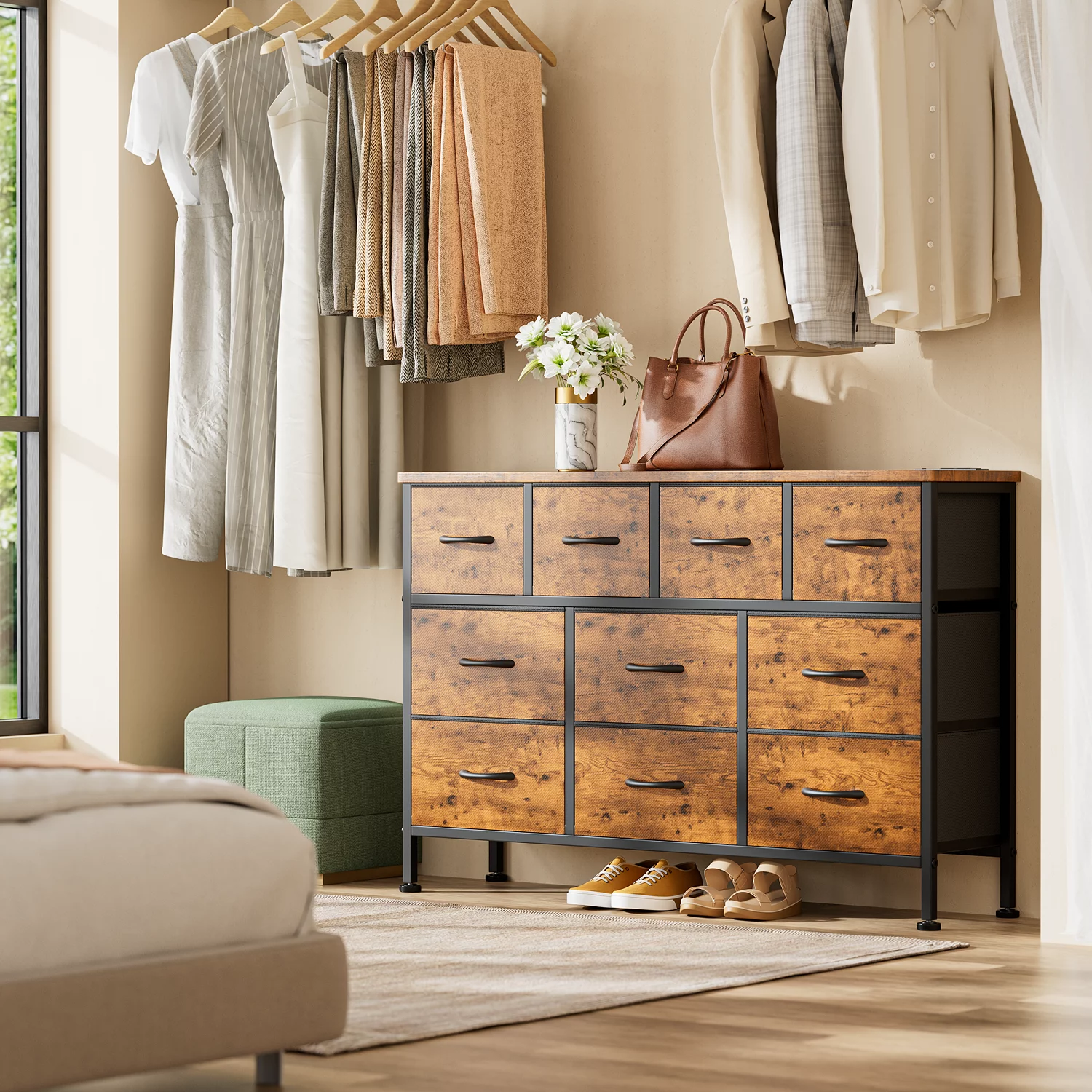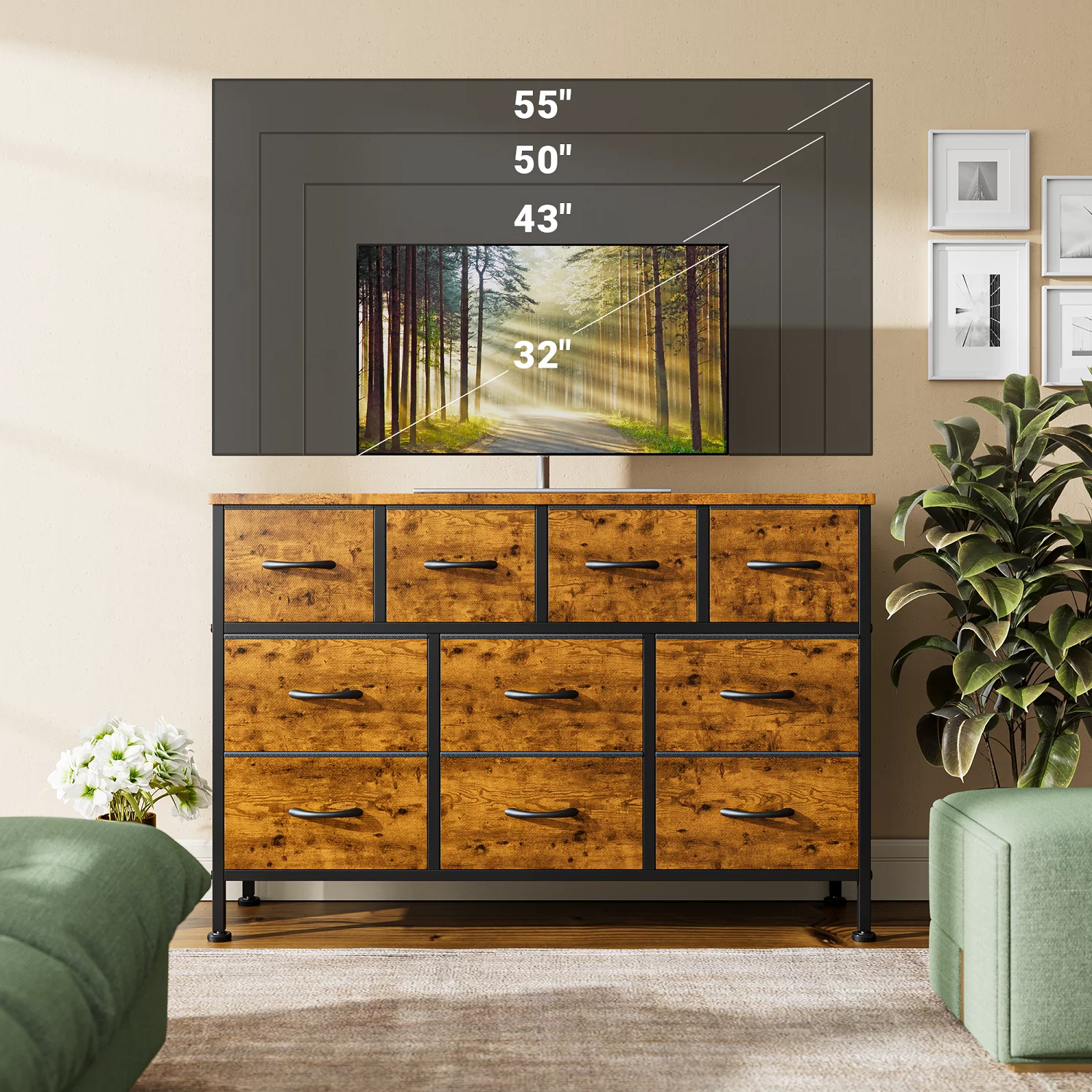 GIKPAL Dresser TV Stand, 10 Drawer Dresser for Bedroom with Power Outlet, Chest of Drawers for 55 Long TV, Fabric Dresser for Storage and Organization, Brown