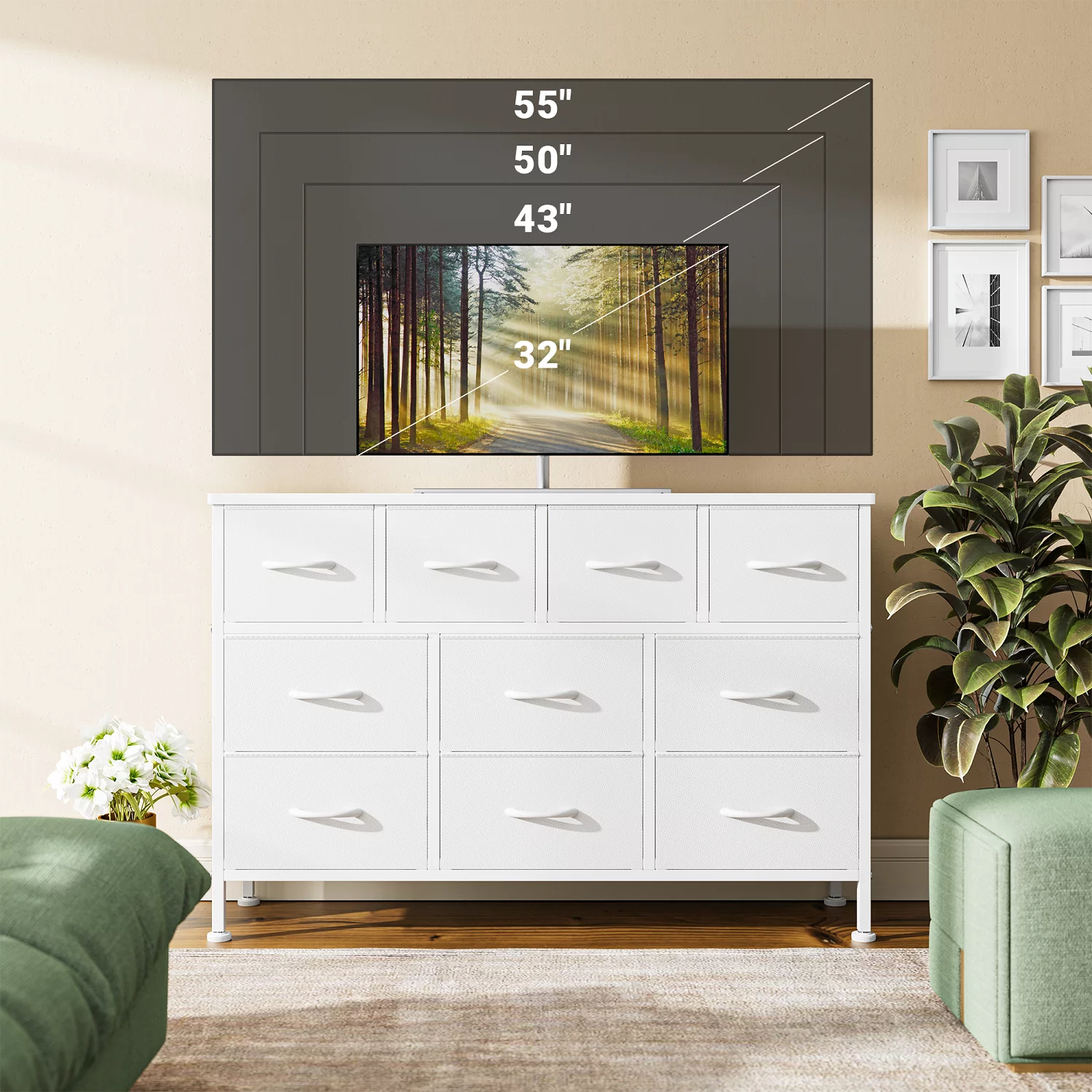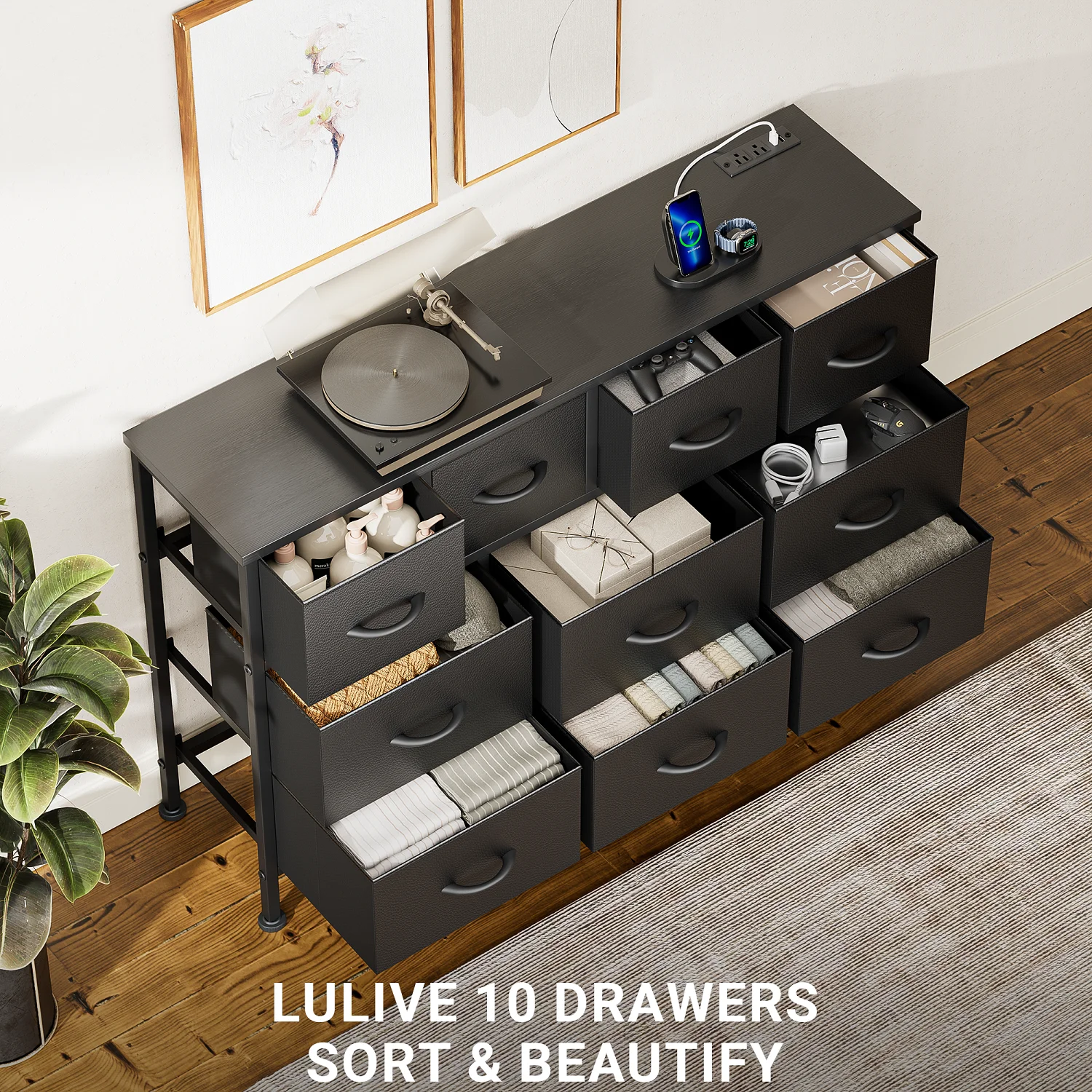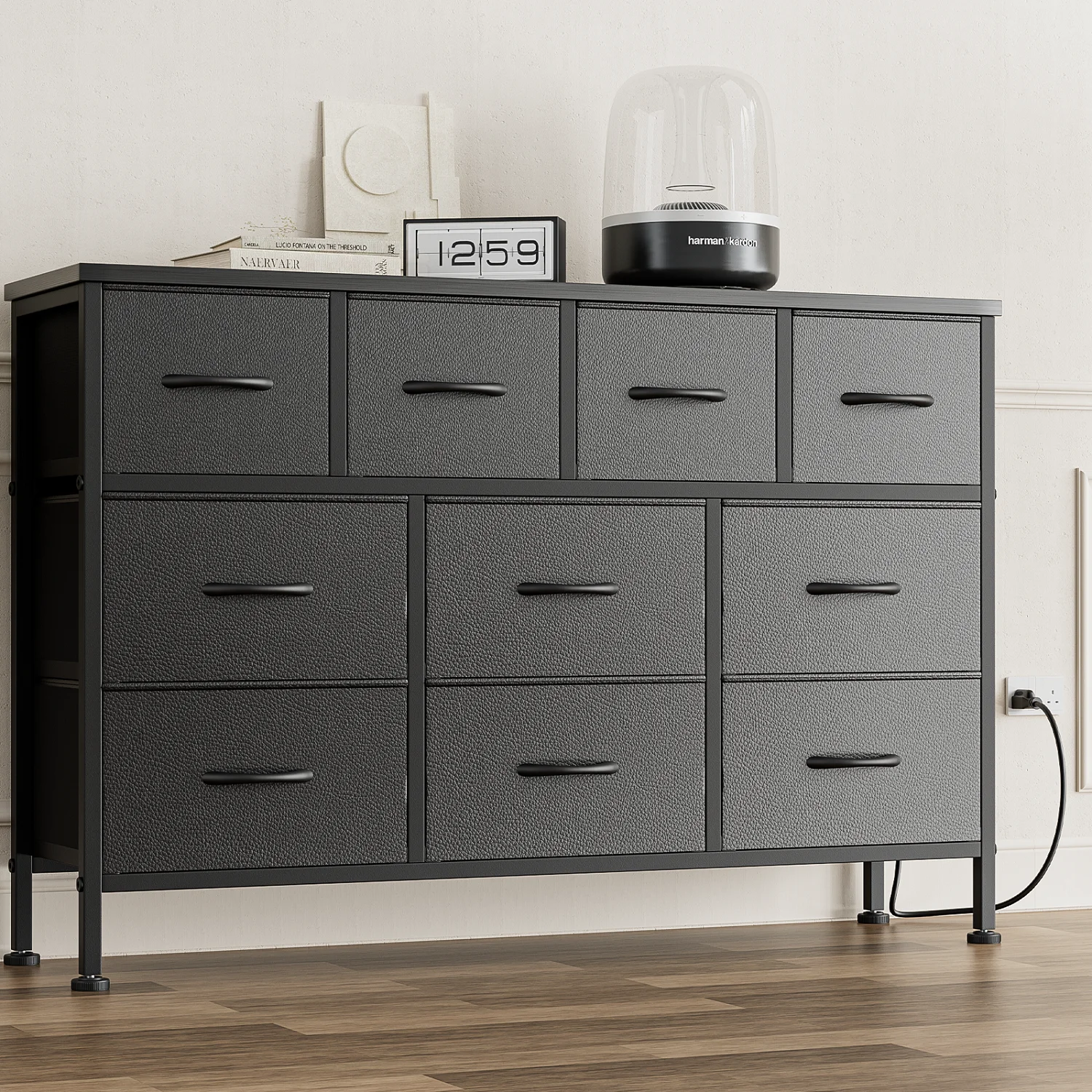 GIKPAL Dresser TV Stand, 10 Drawer Dresser for Bedroom with Power Outlet, Chest of Drawers for 55 Long TV, Fabric Dresser for Storage and Organization, Brown