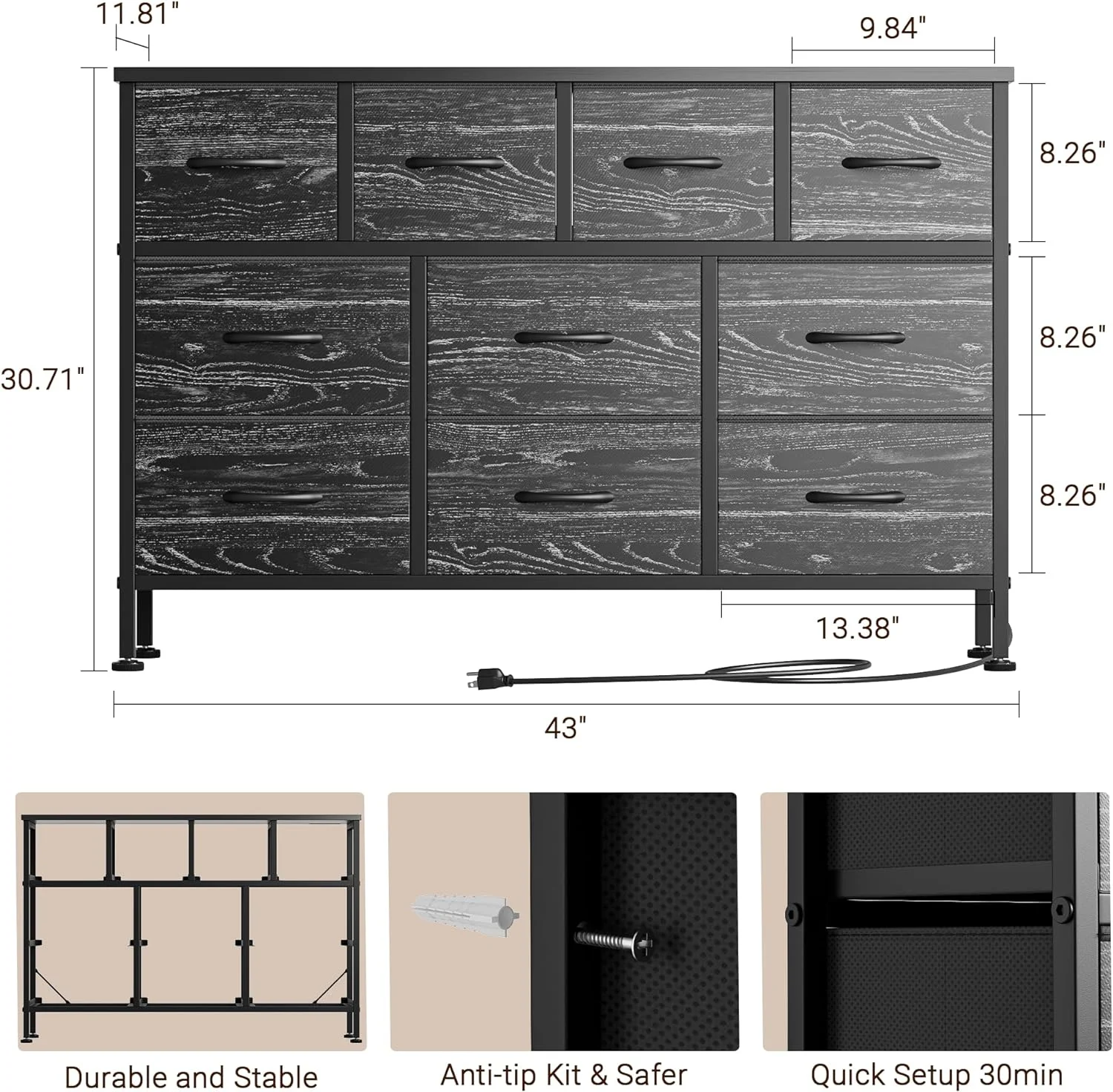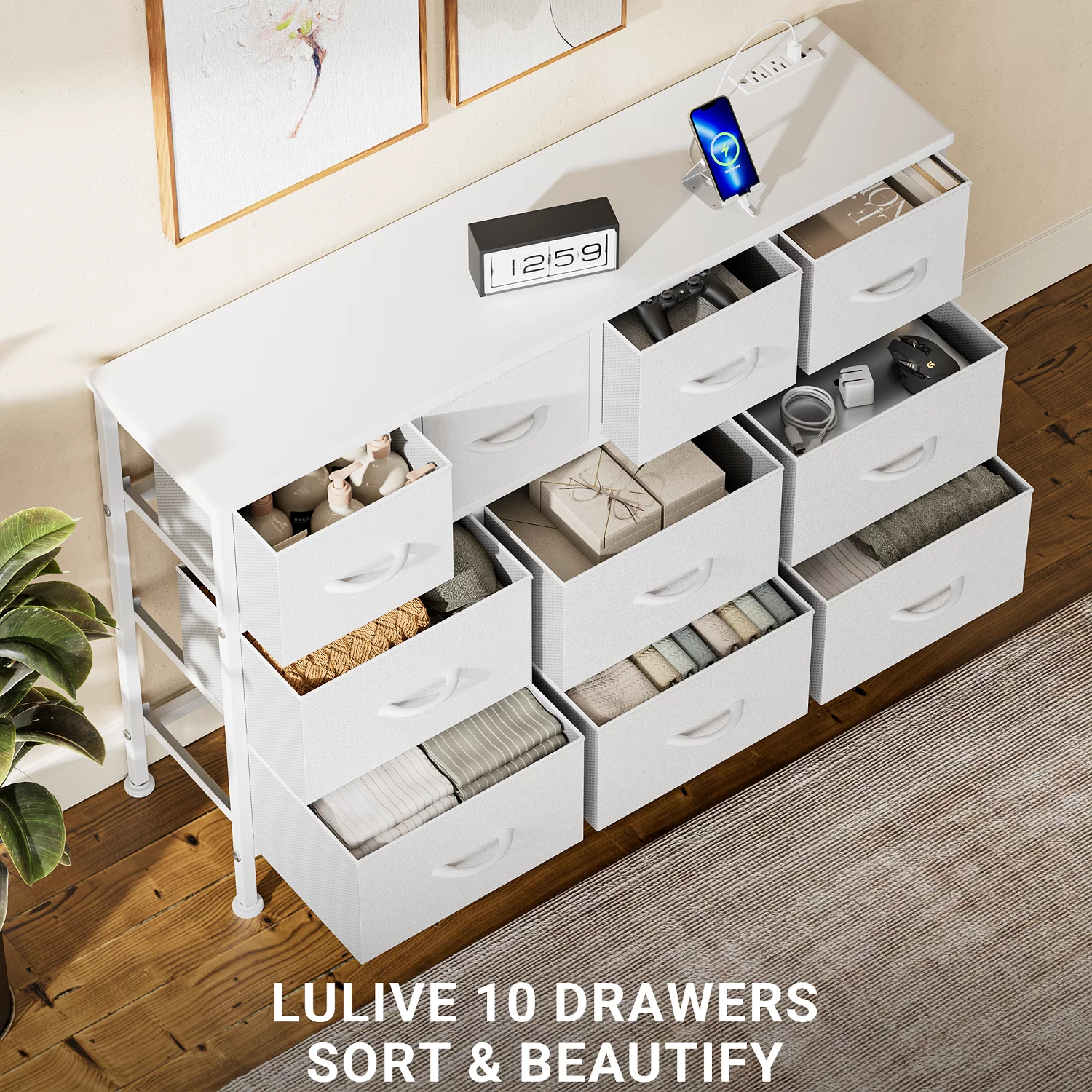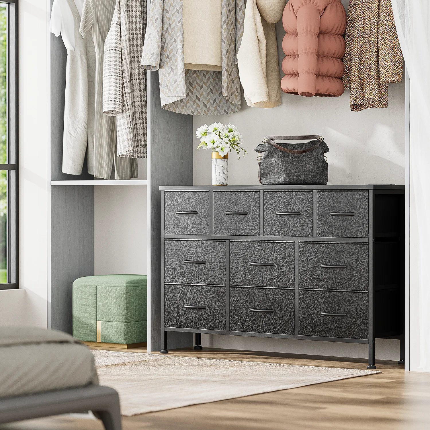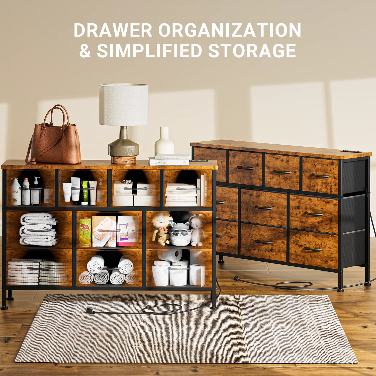 GIKPAL Dresser TV Stand, 10 Drawer Dresser for Bedroom with Power Outlet, Chest of Drawers for 55 Long TV, Fabric Dresser for Storage and Organization, Brown