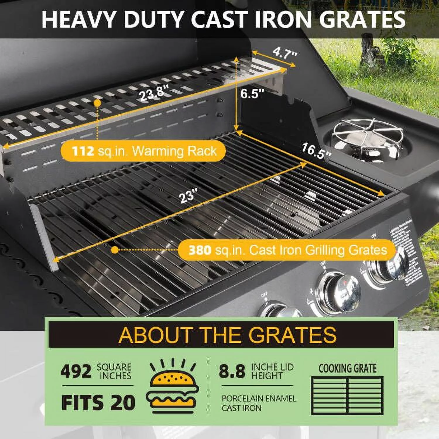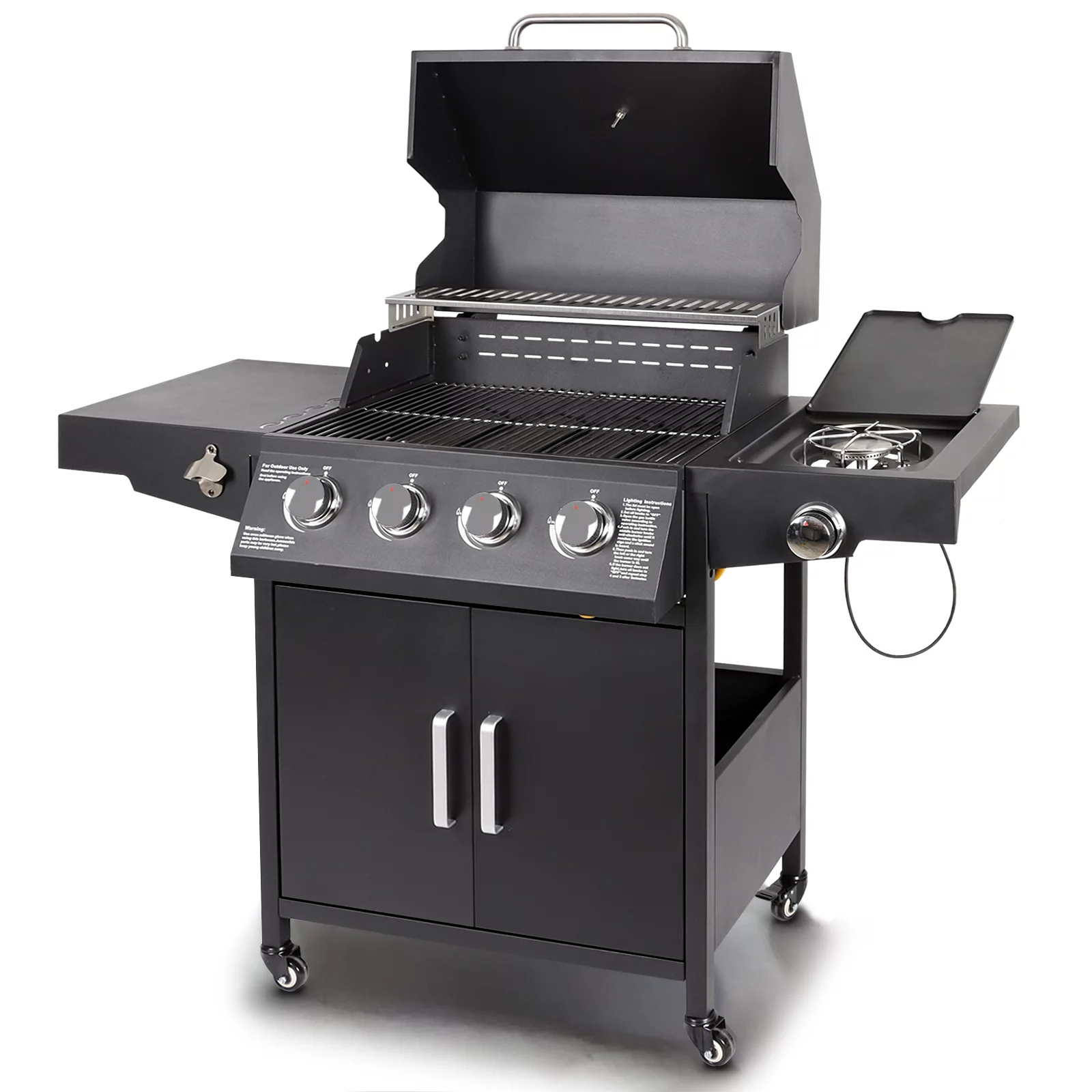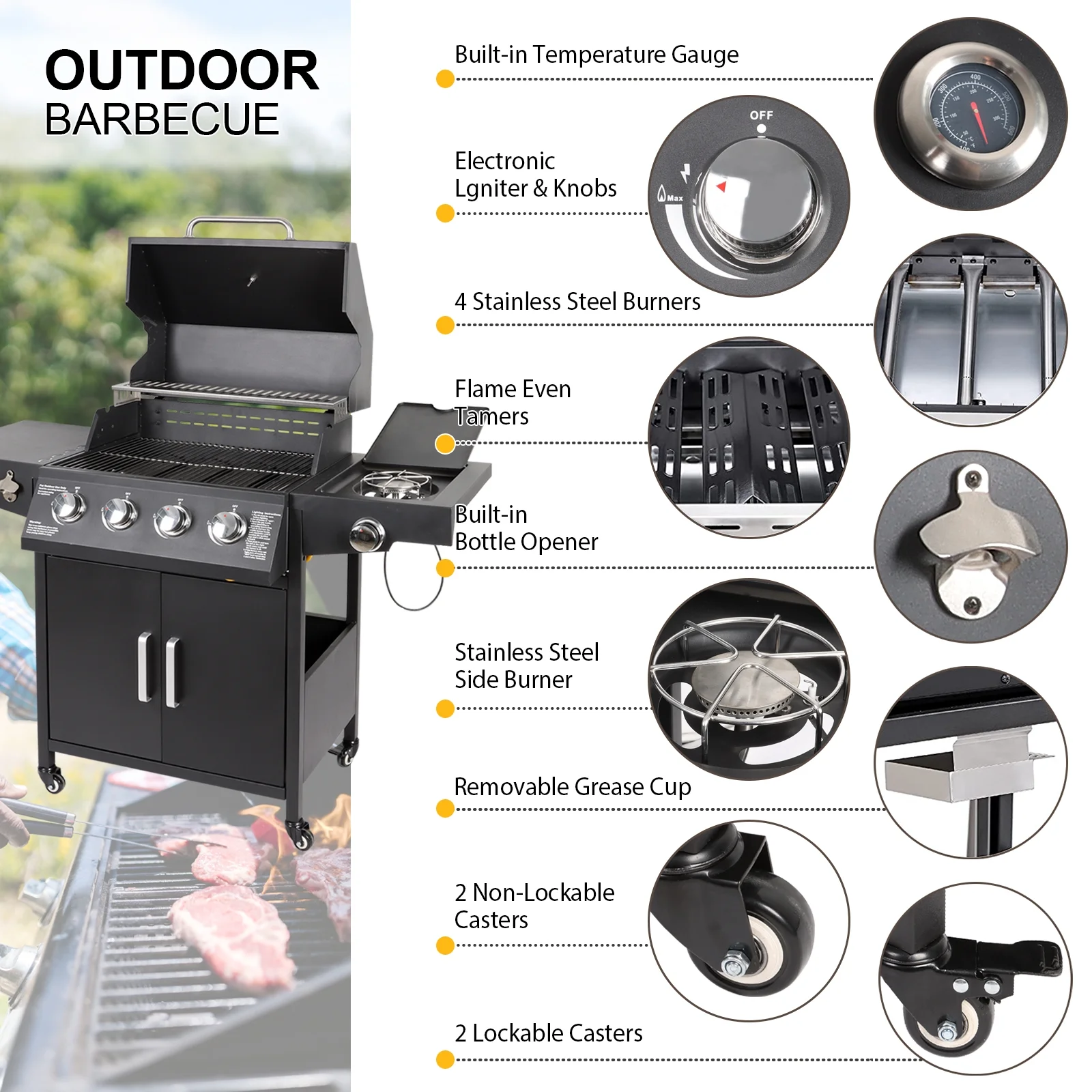 Polar Aurora Propane Gas Grill 4-Burners a Side Burner, Side Table, Steel Grill Cart for Garden Outdoor Cooking Picnic