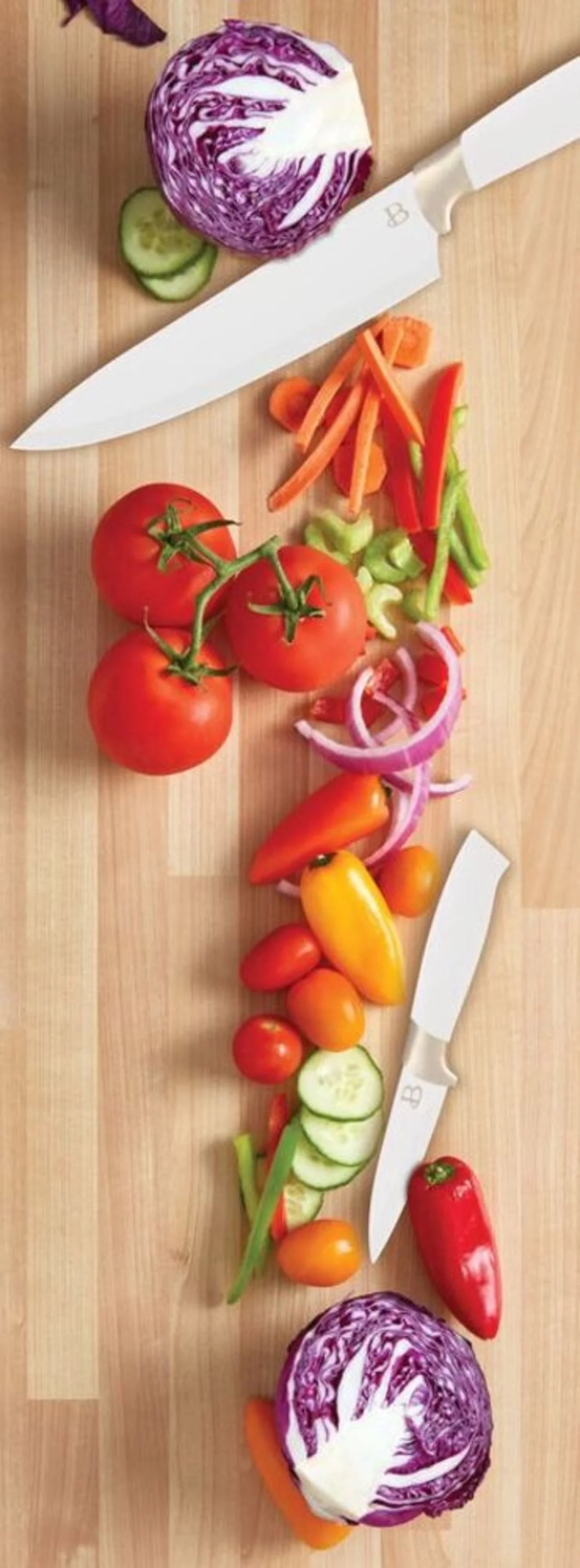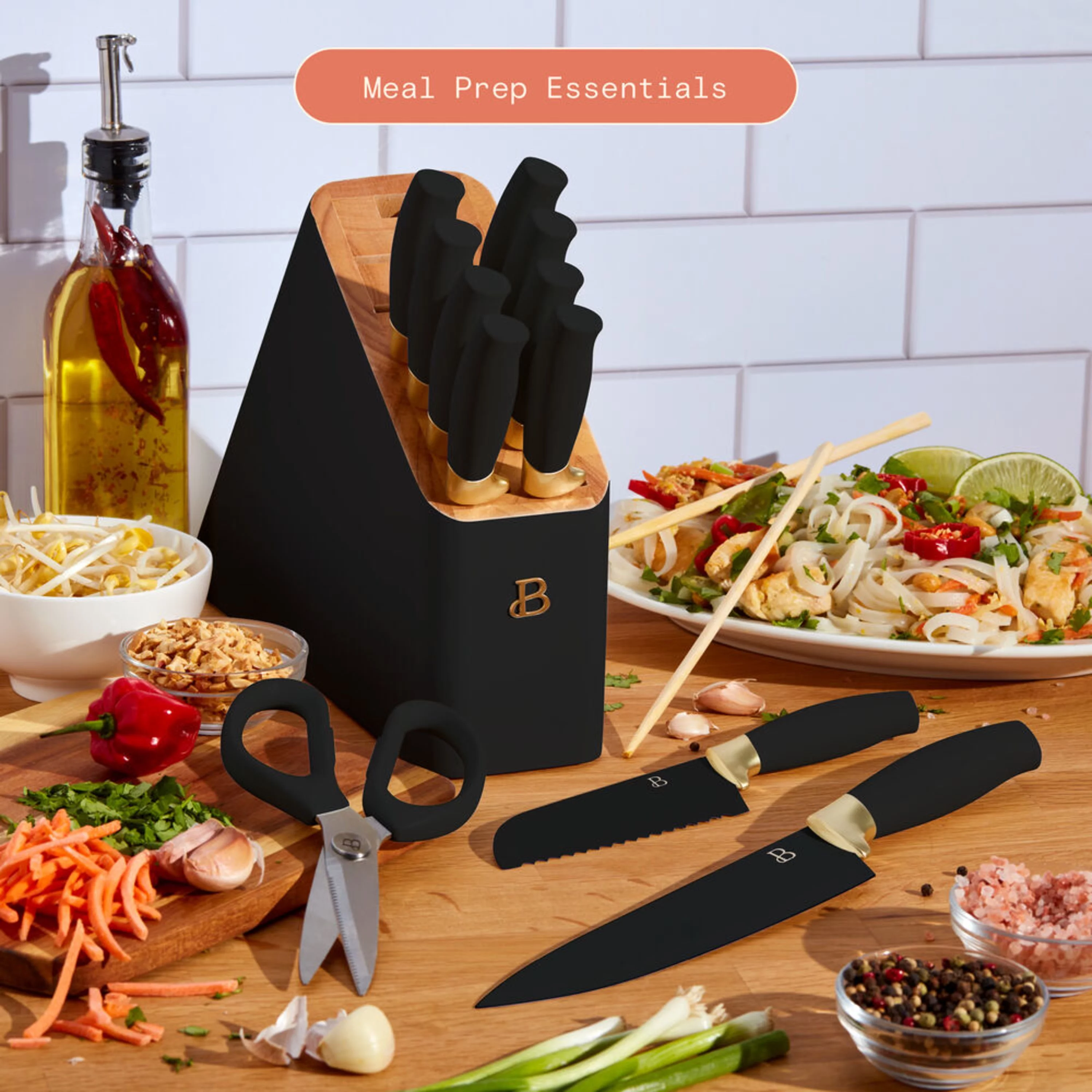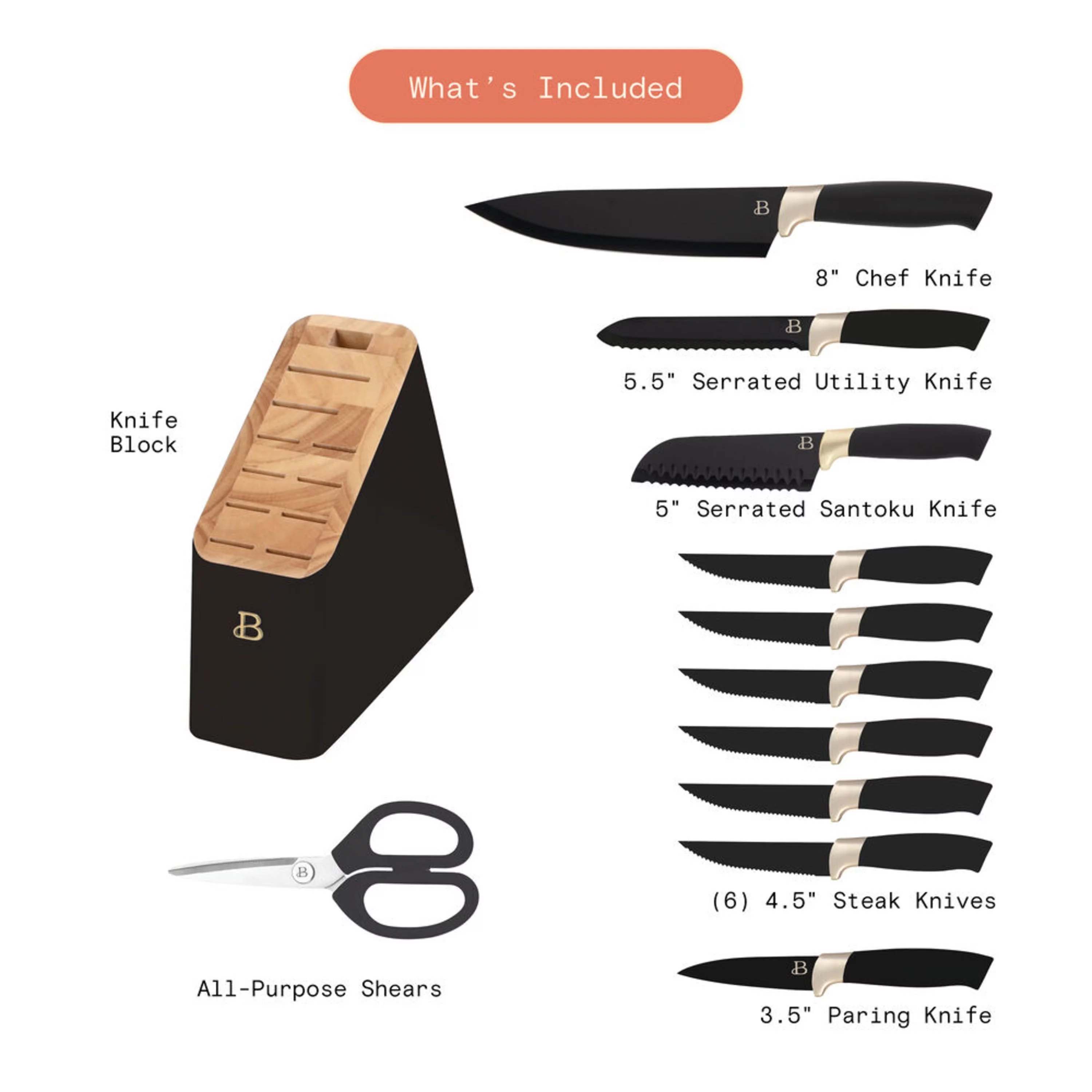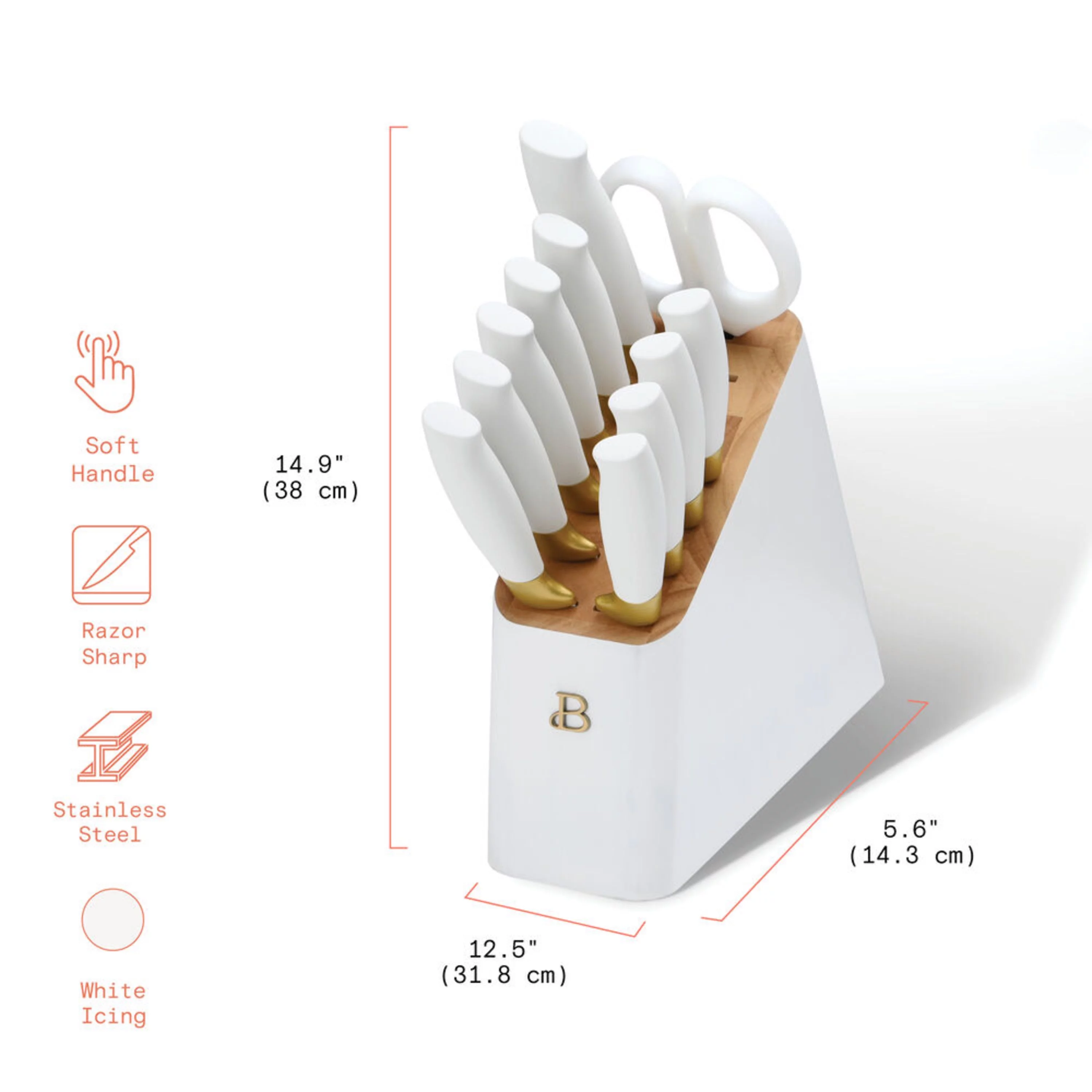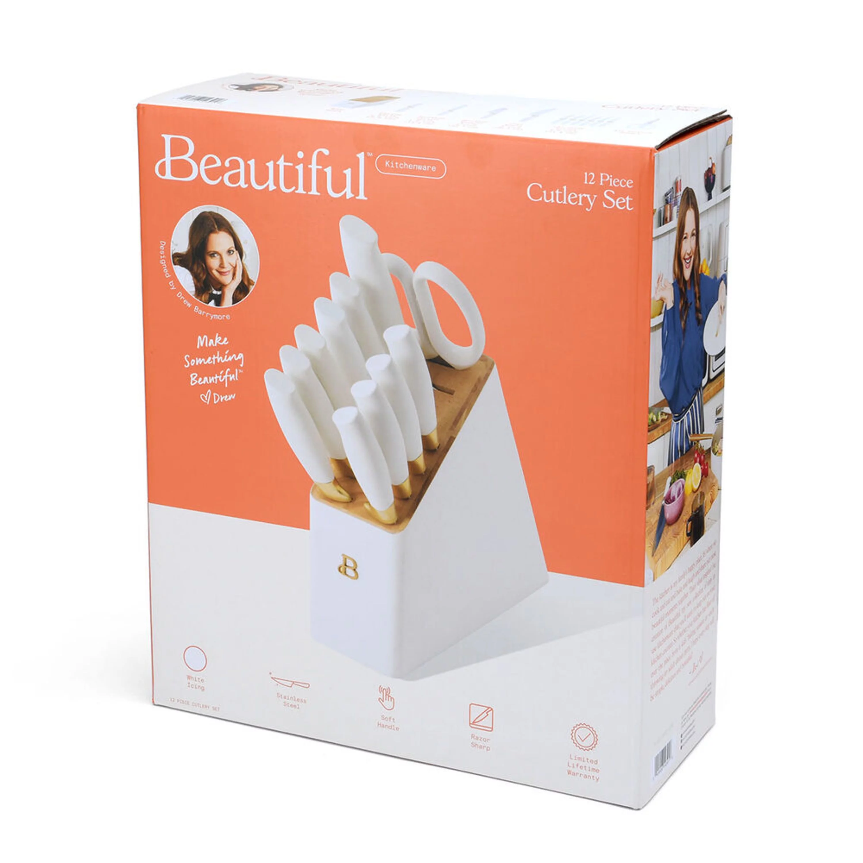 Beautiful 12 Piece Knife Block Set with Soft-Grip Ergonomic Handles White and Gold by Drew Barrymore