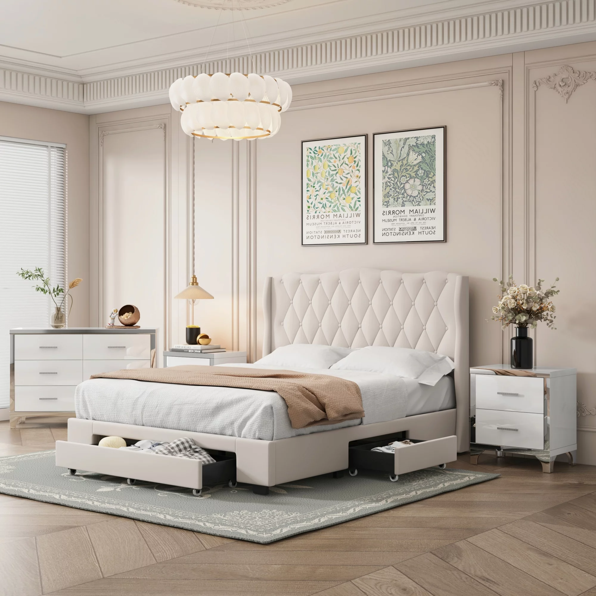 CoSoTower 4-Pieces Bedroom Sets Queen Size Upholstered Bed with Three Drawers. High Gloss Mirrored Nightstands and Dresser with Metal Handles and Legs