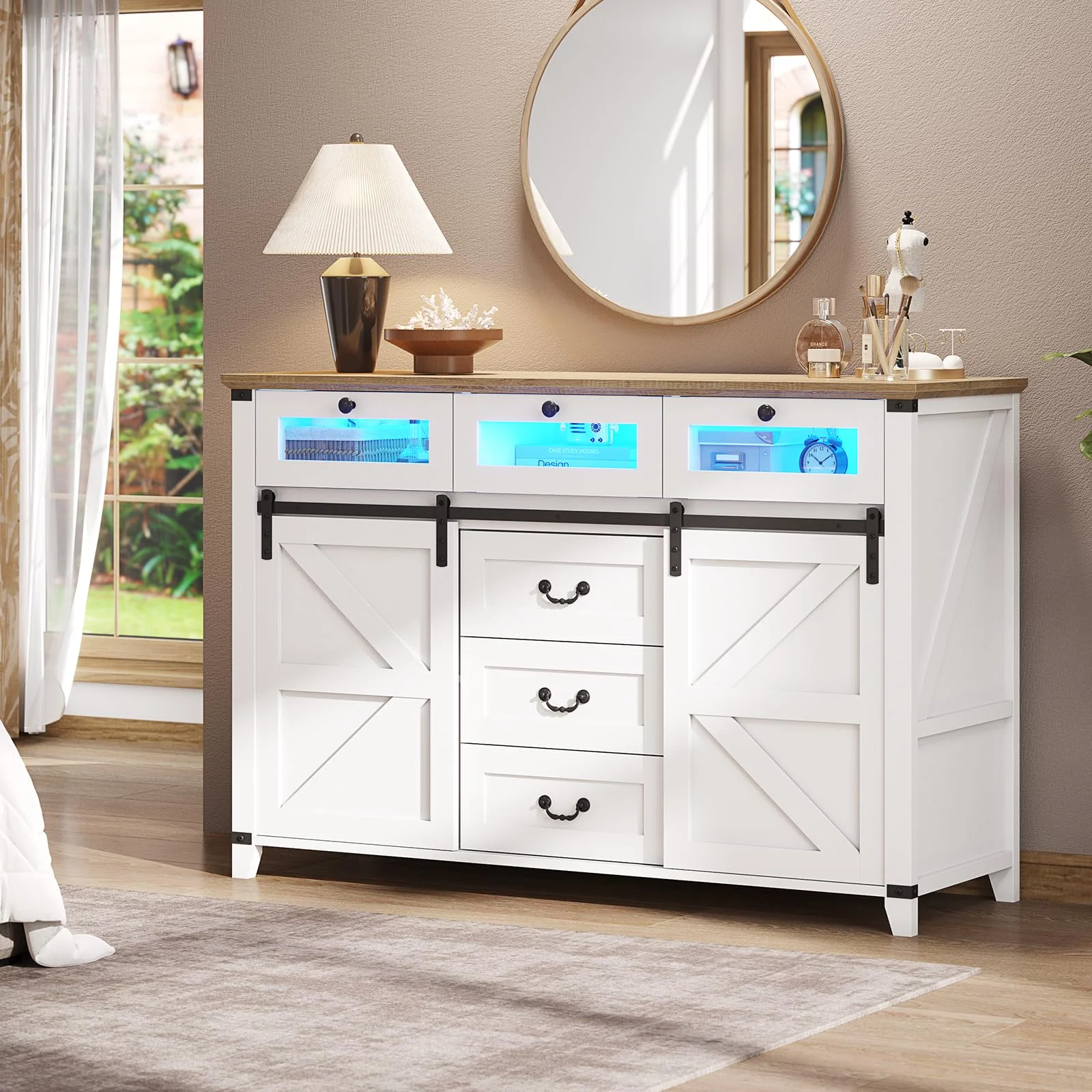 6 Drawers Dresser with LED Lights&2 Sliding Door for Bedroom. Farmhouse TV Stand Chest of Drawers for Living Room. White