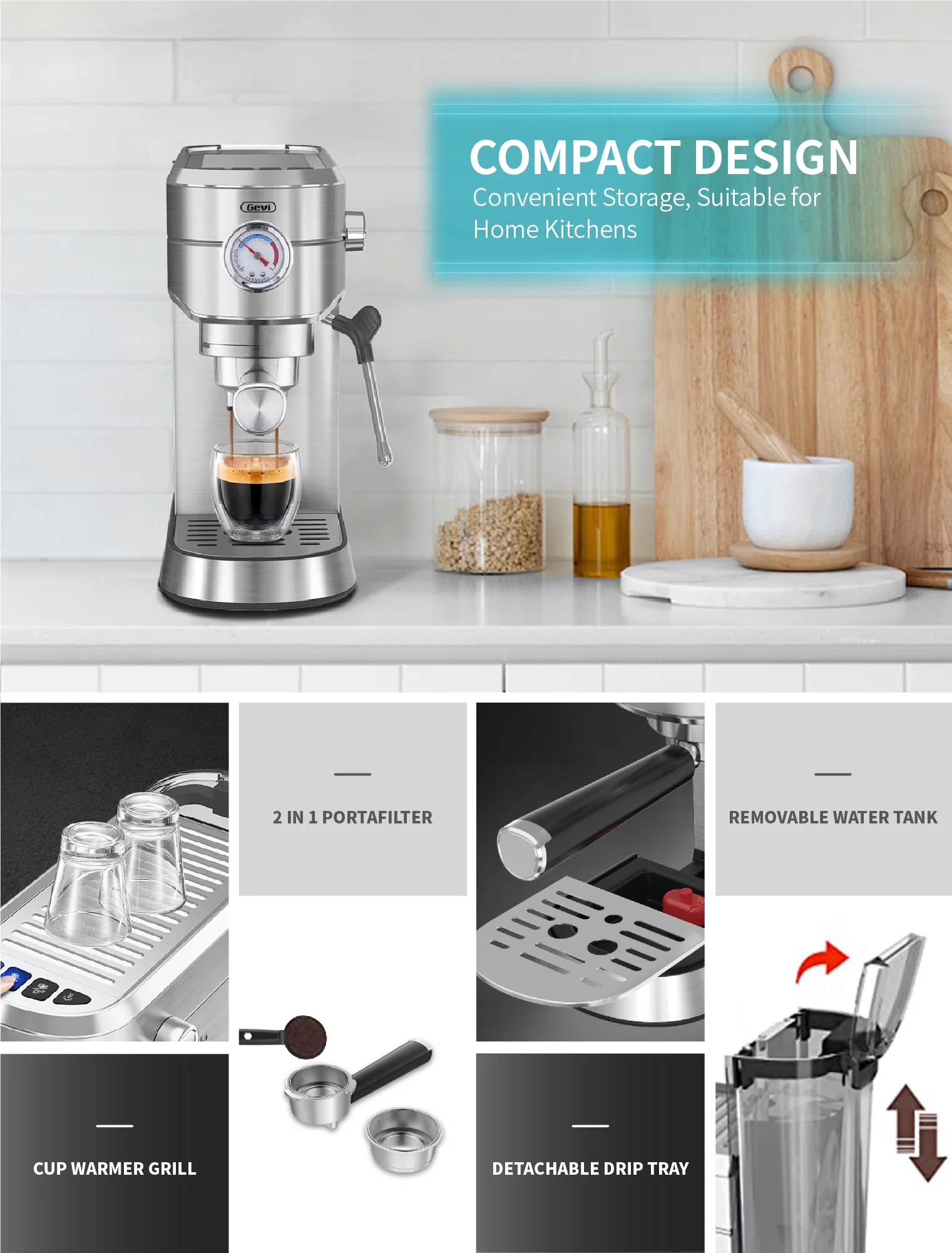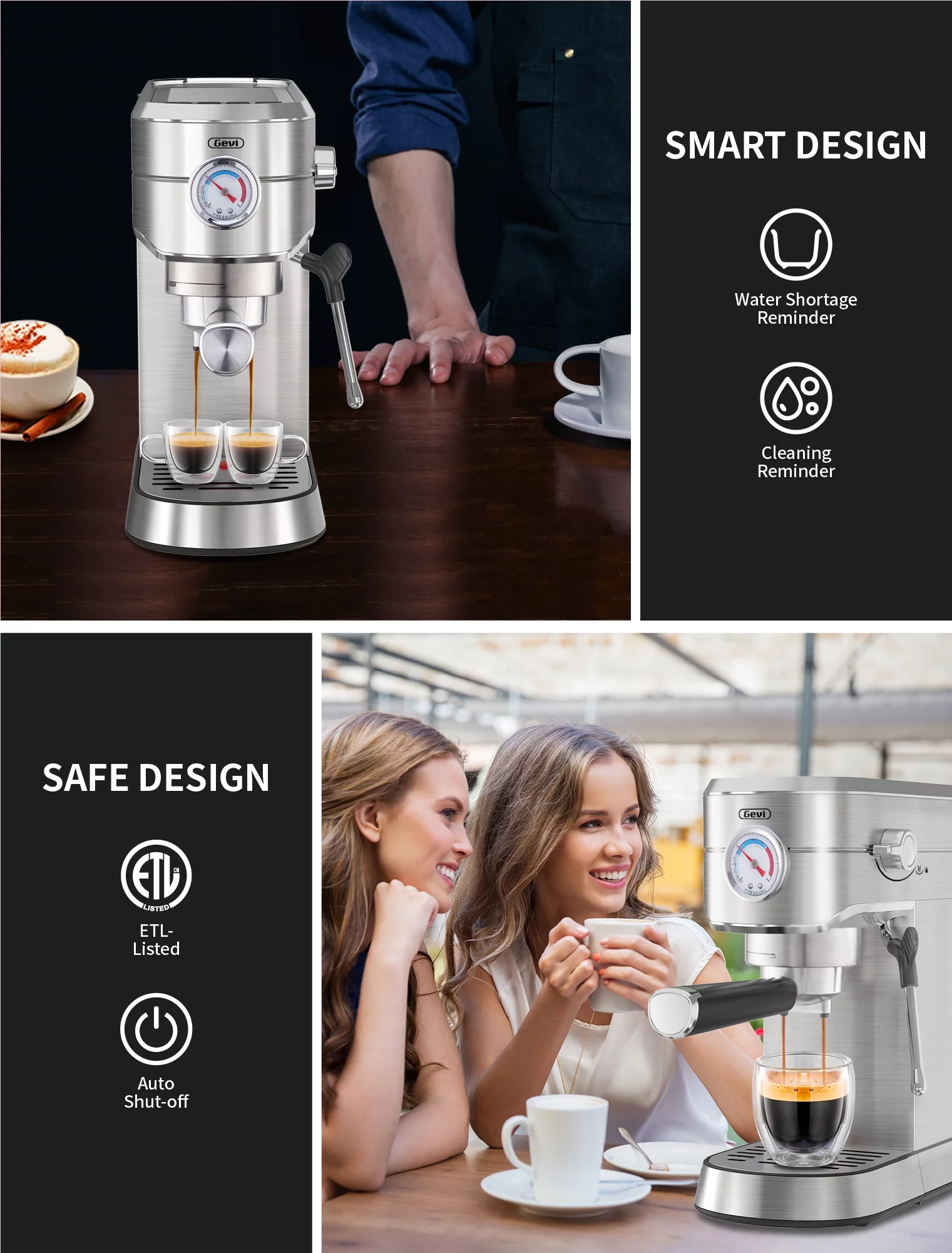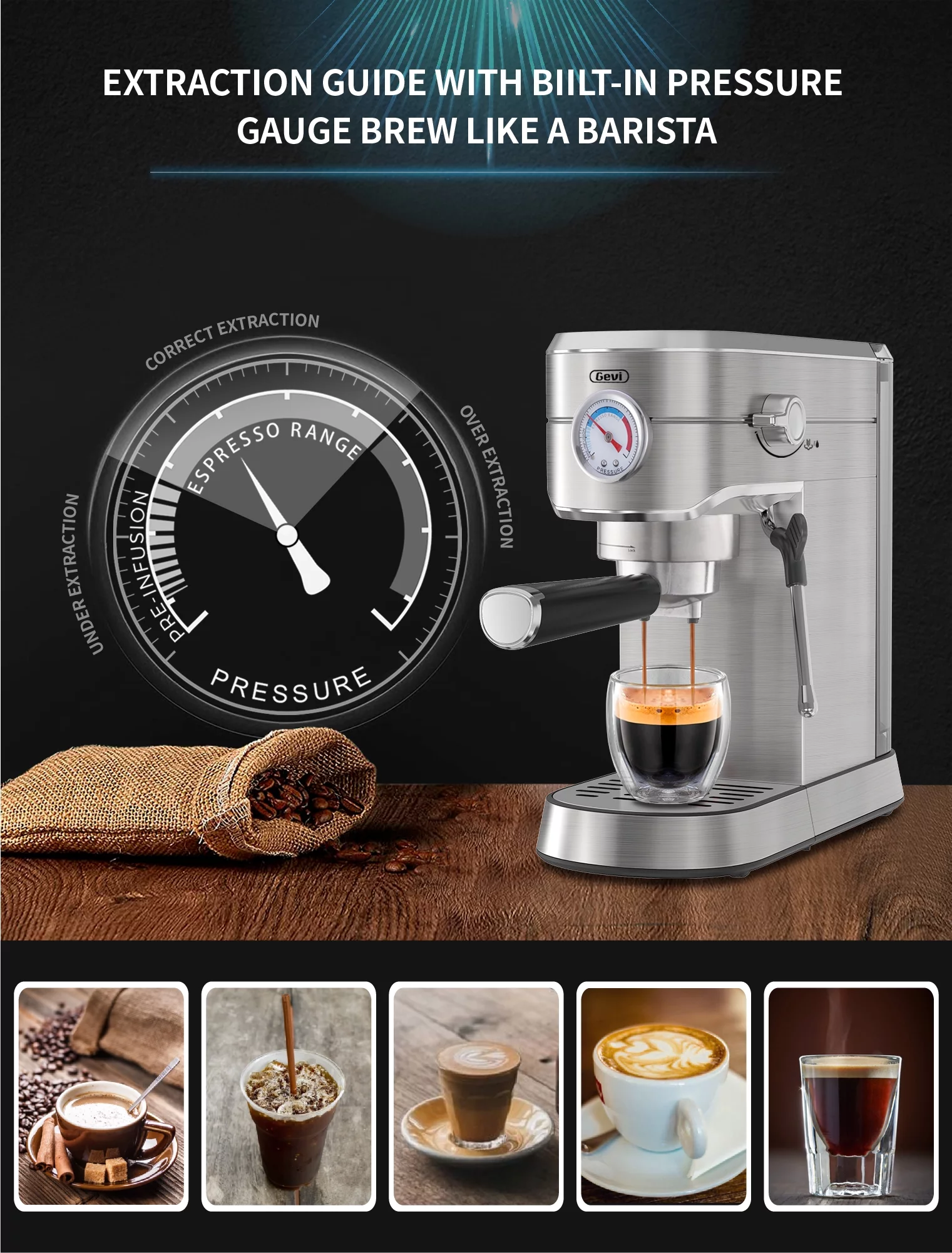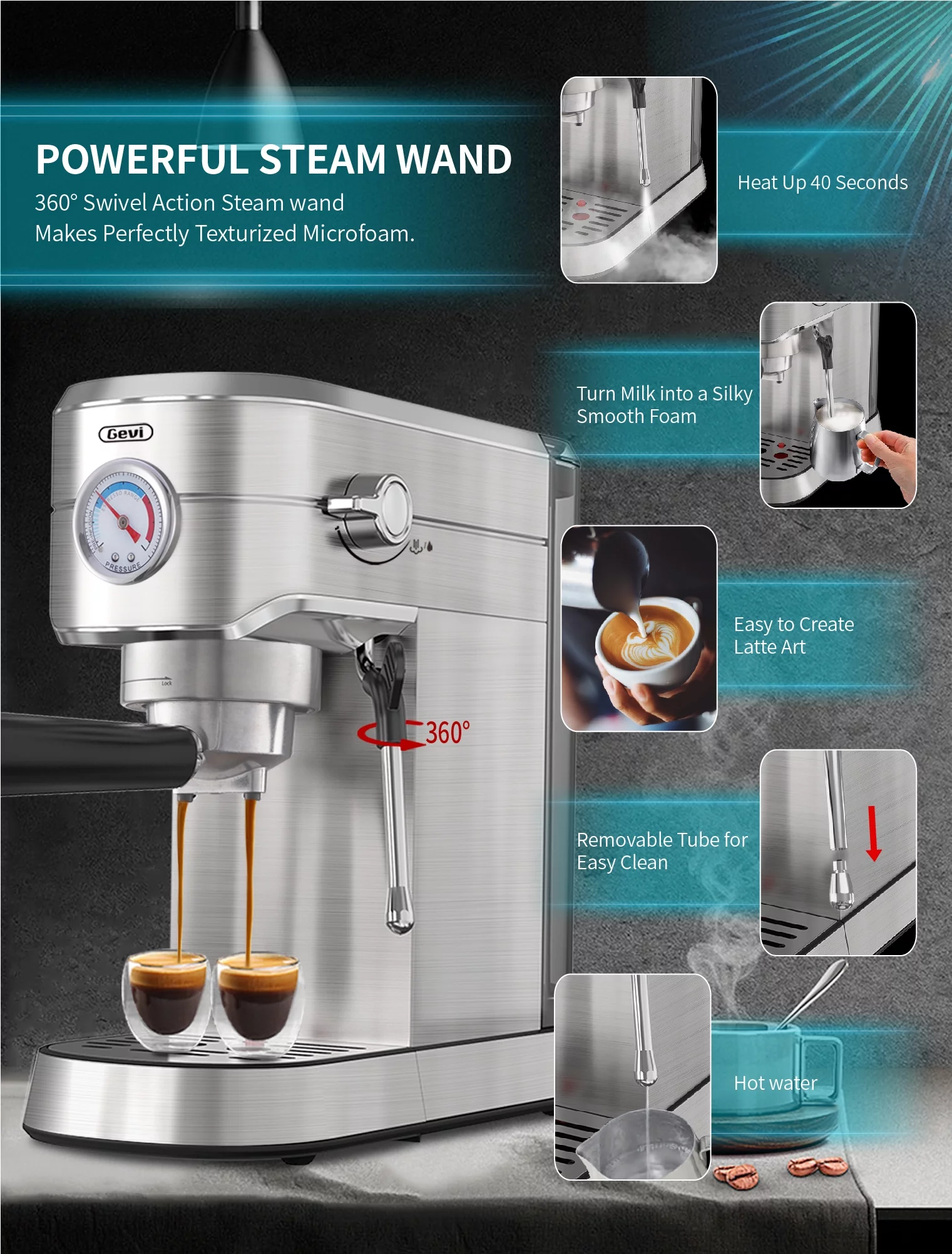Gevi Silver 20 Bar Professional Espresso Machine 35 OZ Water Tank, Stainless Steel, New