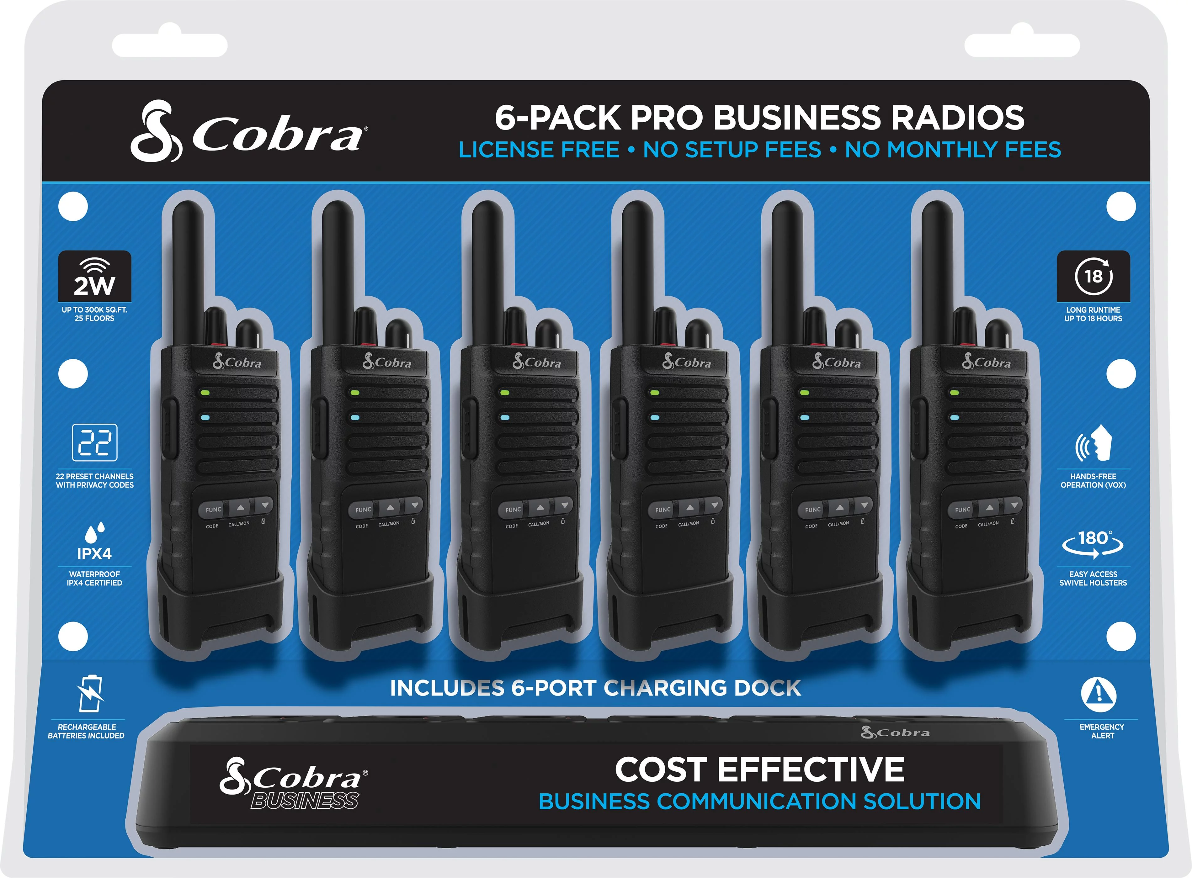 Cobra PX655 Pro Business 2W FRS Two-Way Radios (6-Pack) & Charging Dock, Business Walkie Talkies up to 300,000 Sq ft. & 25 Floors, 22 Channels, Unlimited Expandability