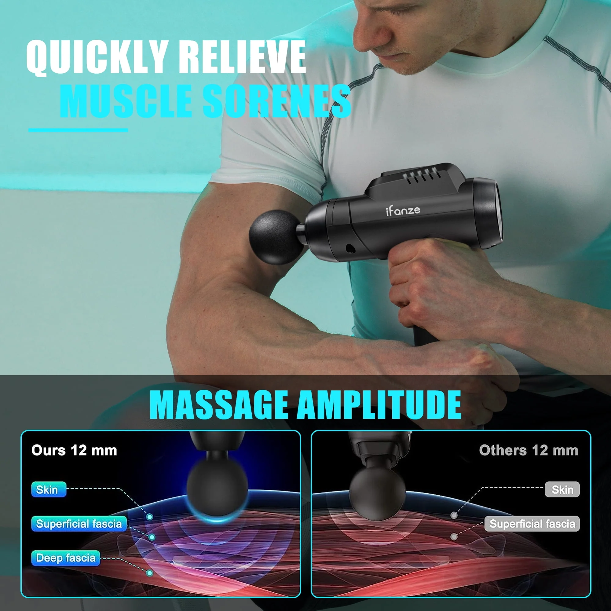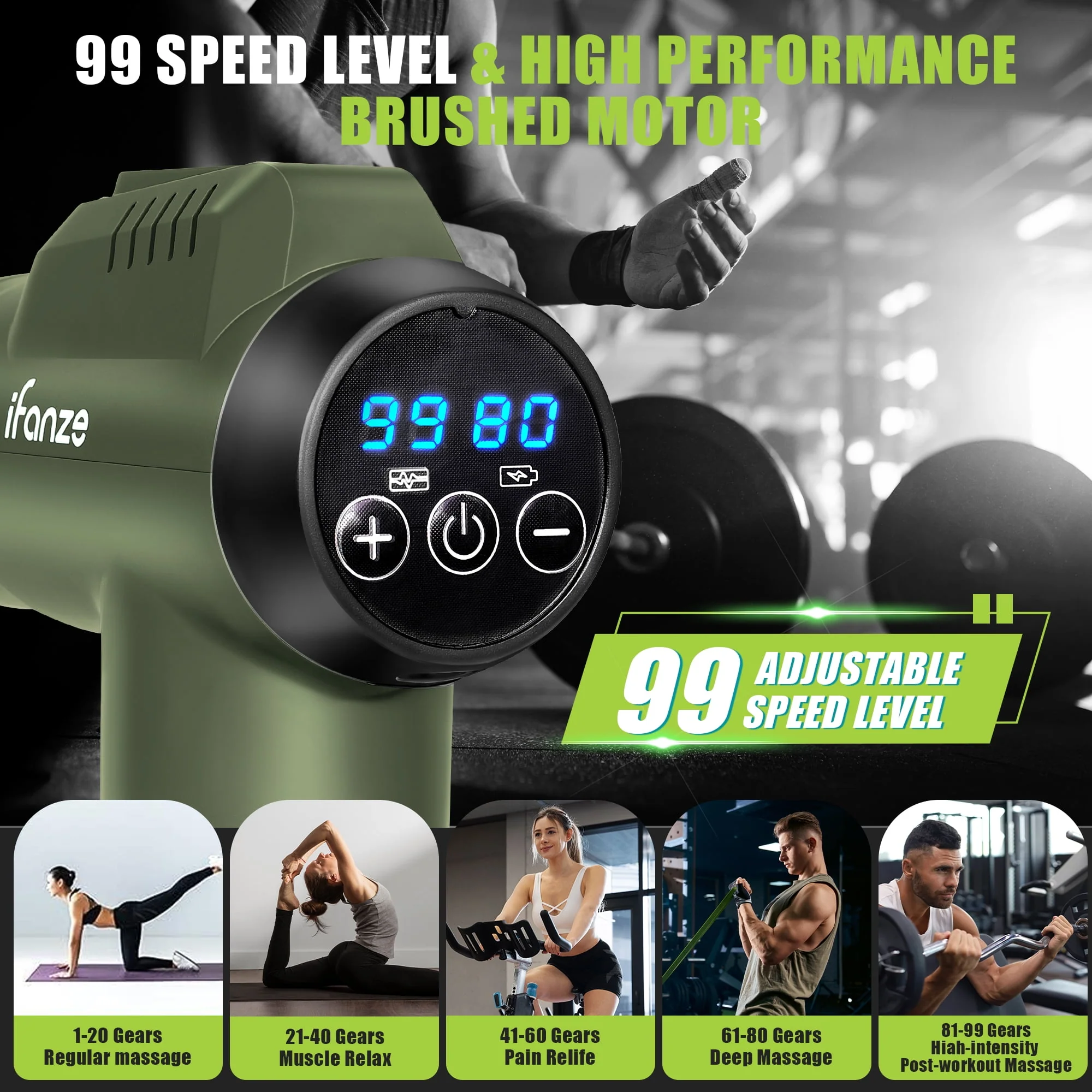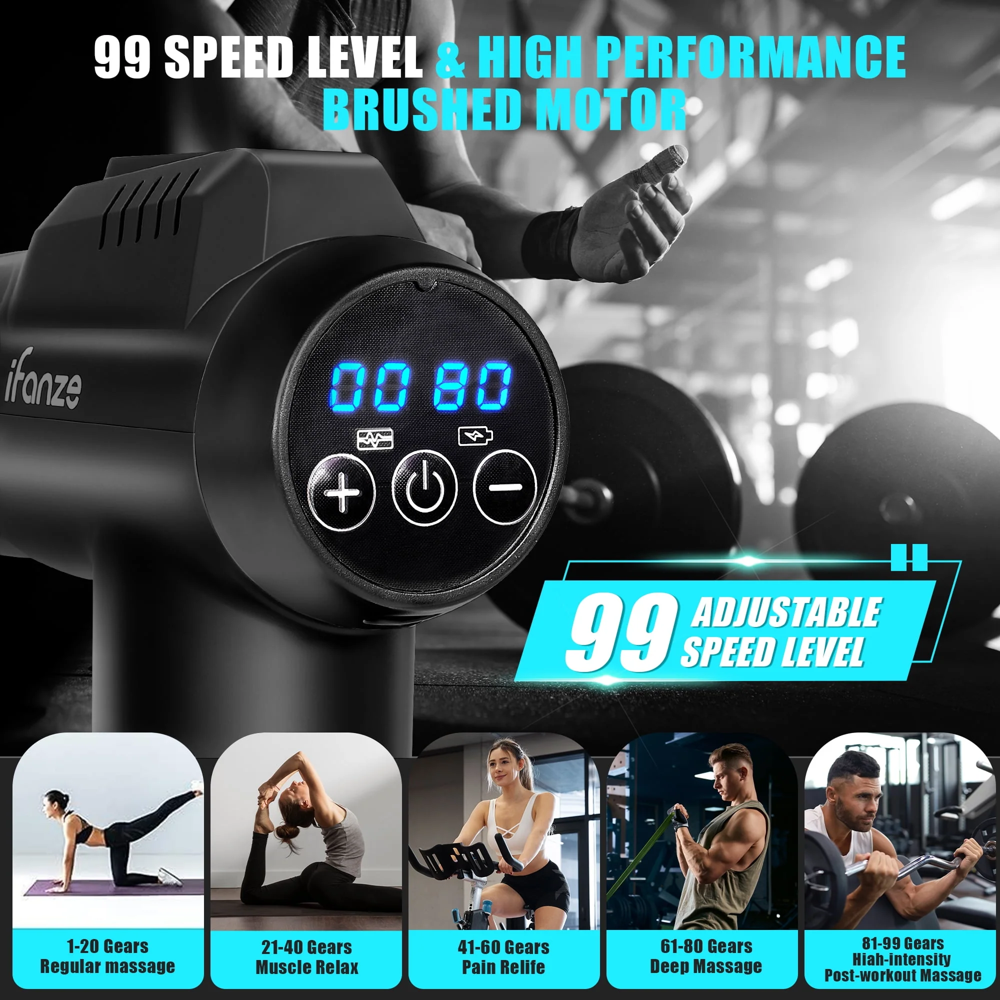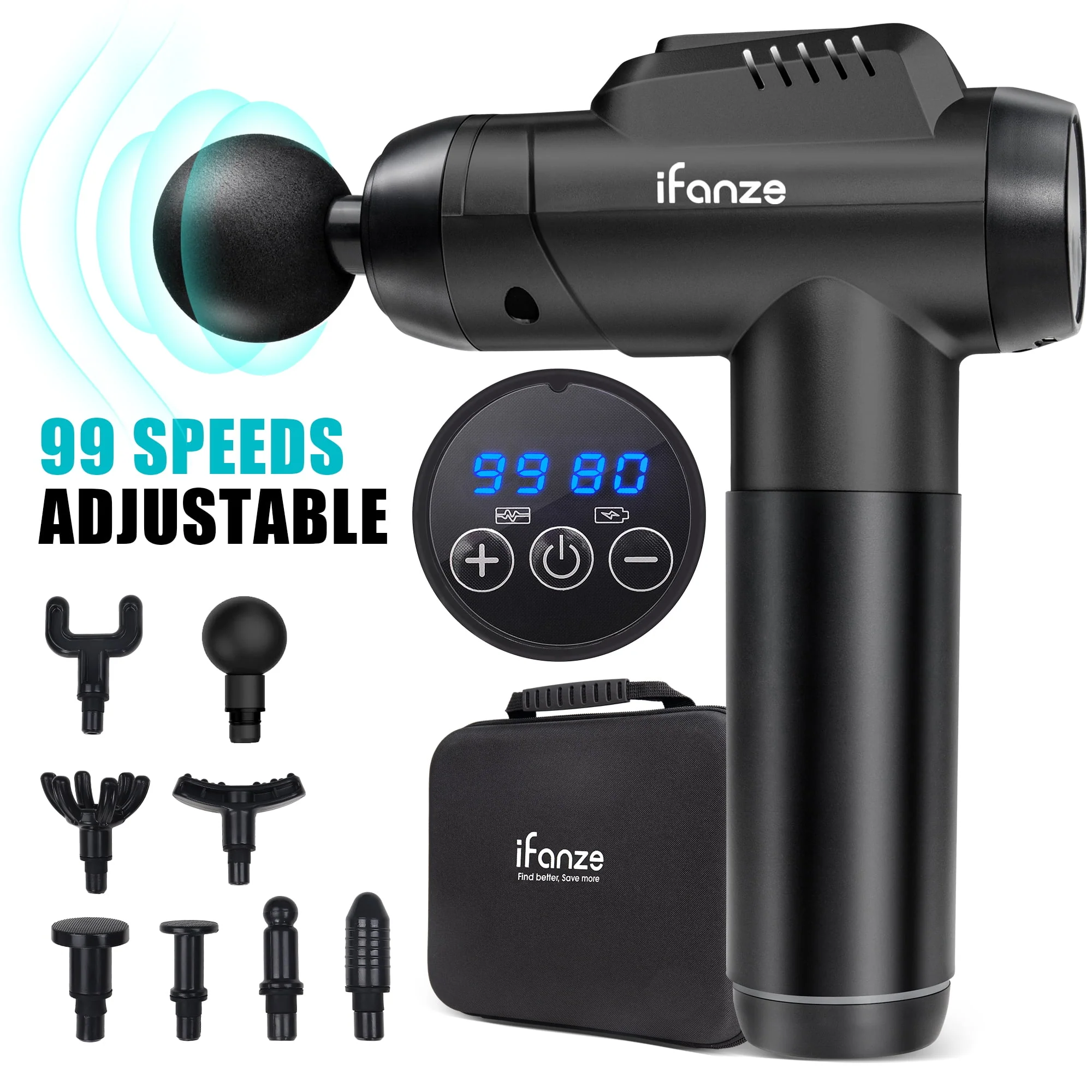 iFanze Massage Gun Deep Tissue, 99 Speeds Quiet Handheld Electric Muscle Massager with 8 Replacement Heads for Gym Office Home Post-Workout Recovery, Black