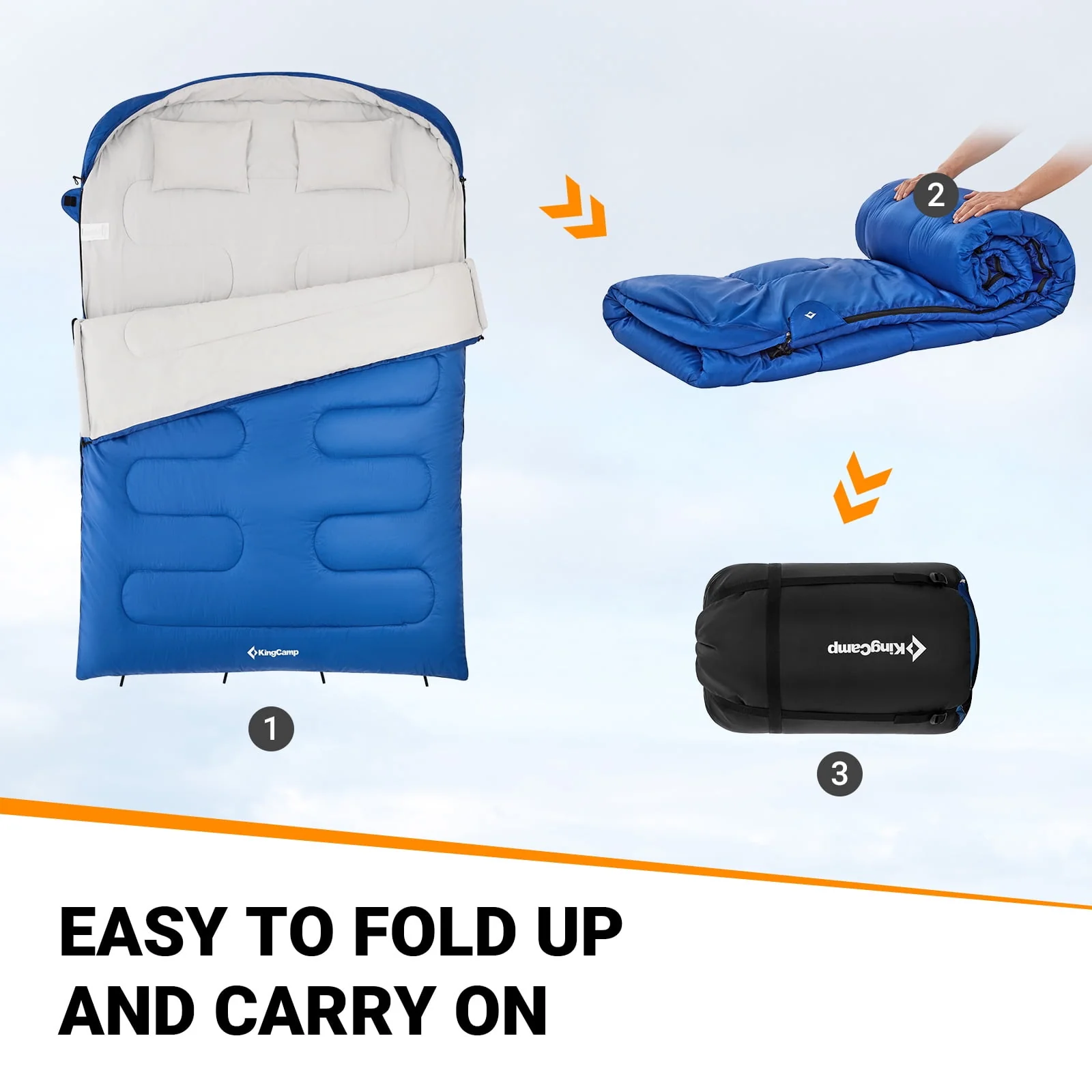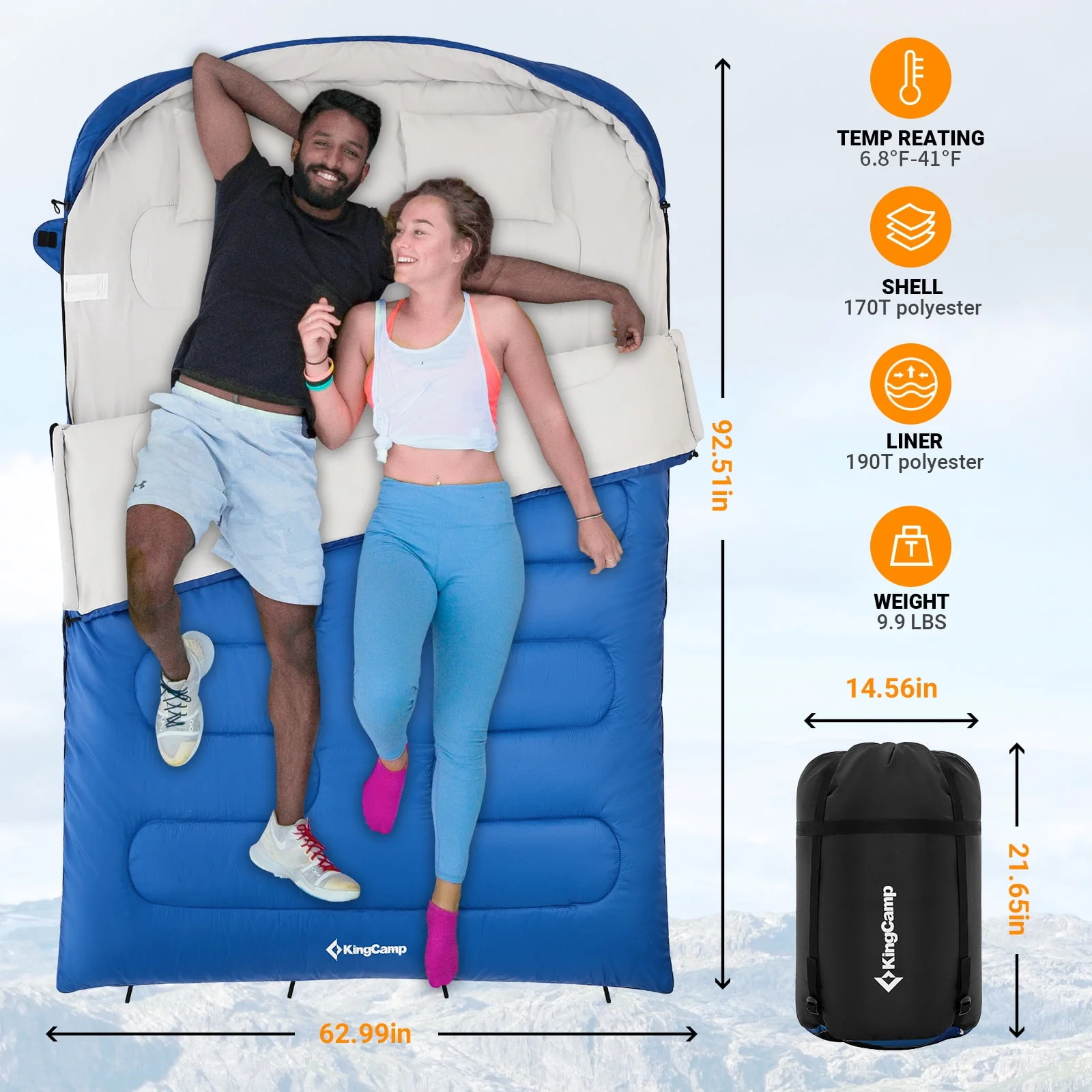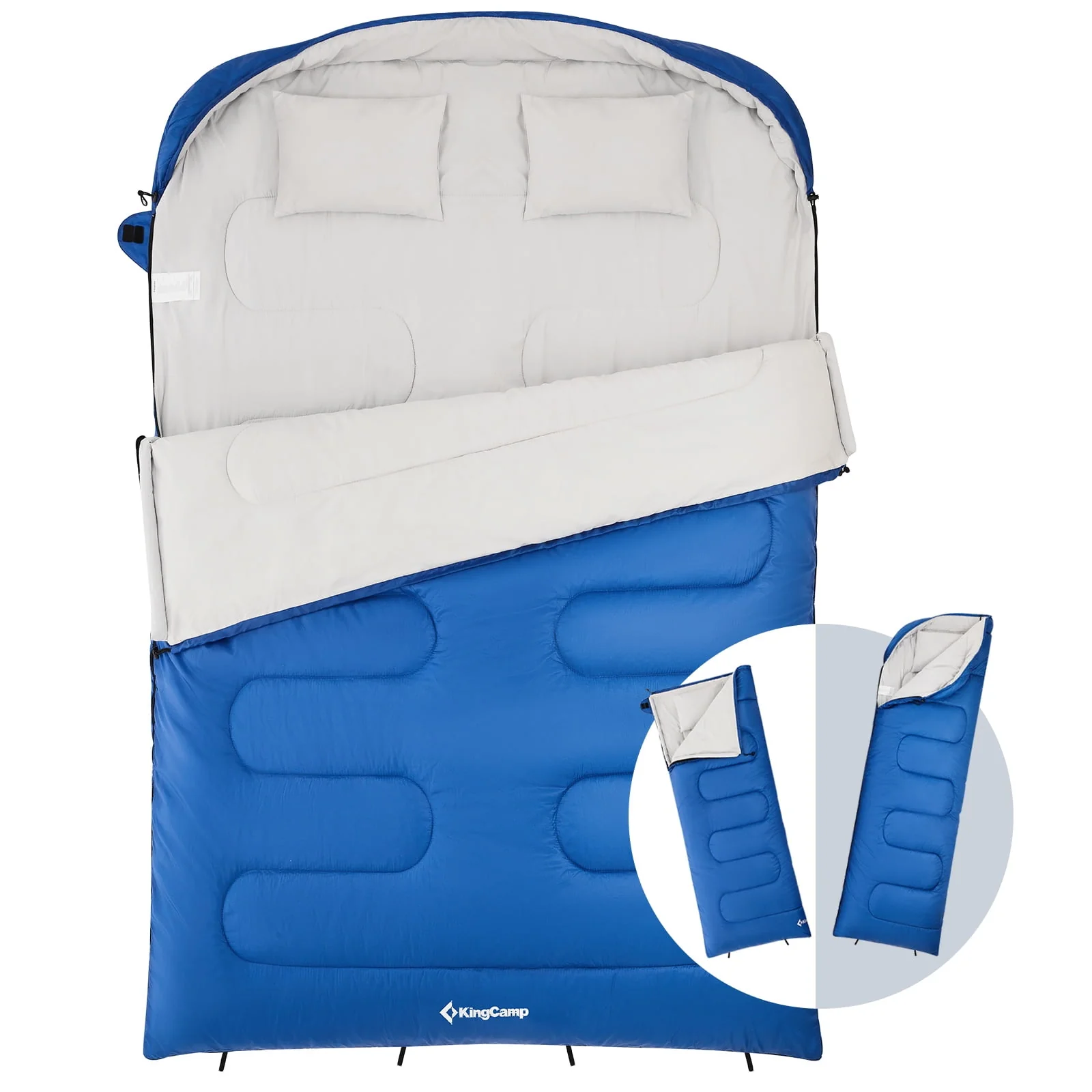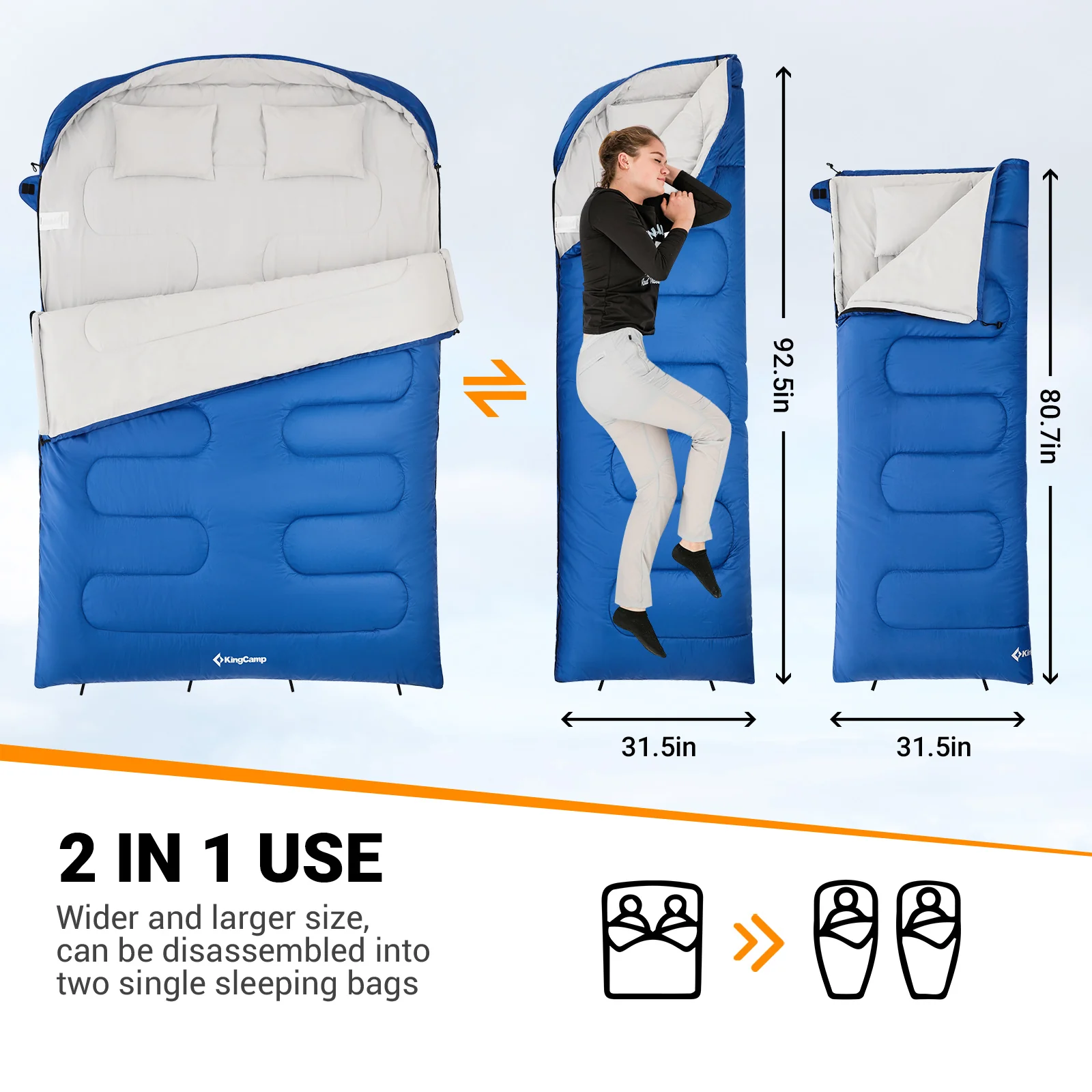 KingCamp Double Sleeping Bag with 2 Pillows for Adult 2 Person 3 Season Camping Sleeping Bag (Blue,6.8℉-41℉)
