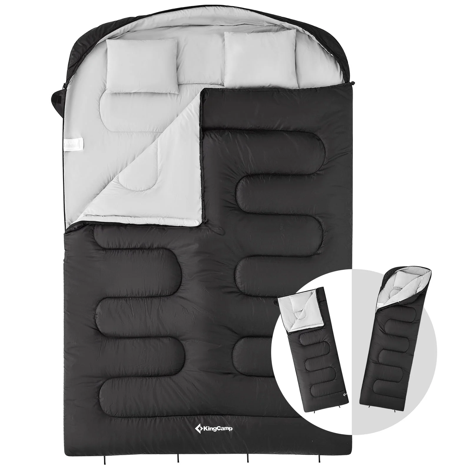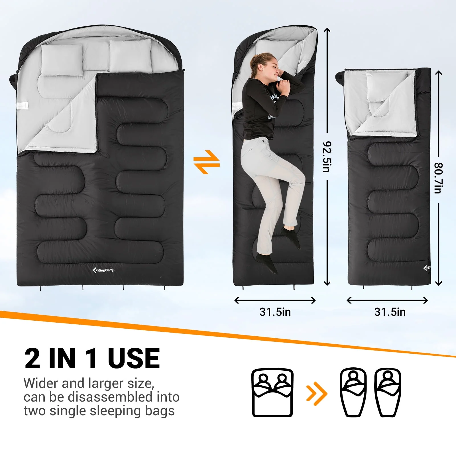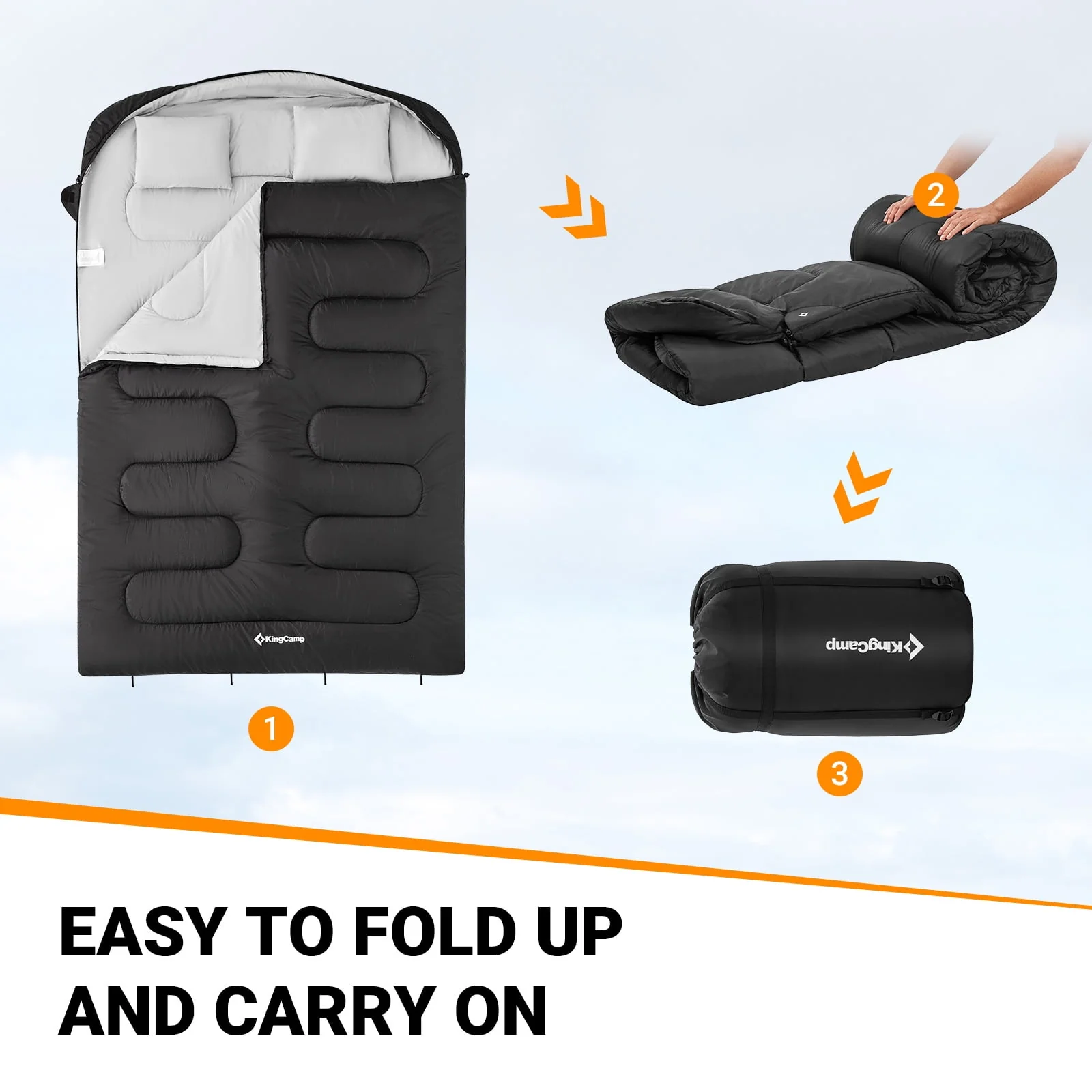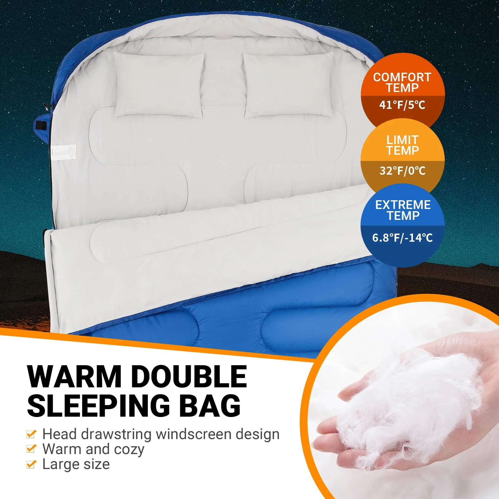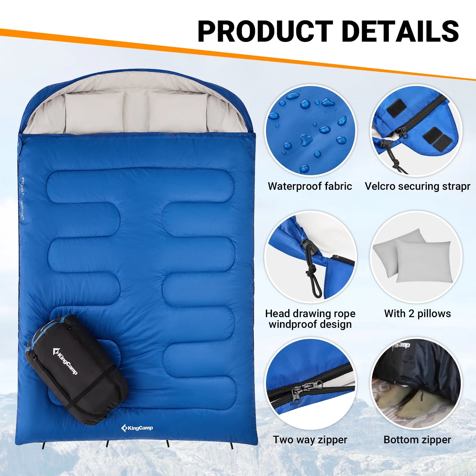 KingCamp Double Sleeping Bag with 2 Pillows for Adult 2 Person 3 Season Camping Sleeping Bag (Blue,6.8℉-41℉)