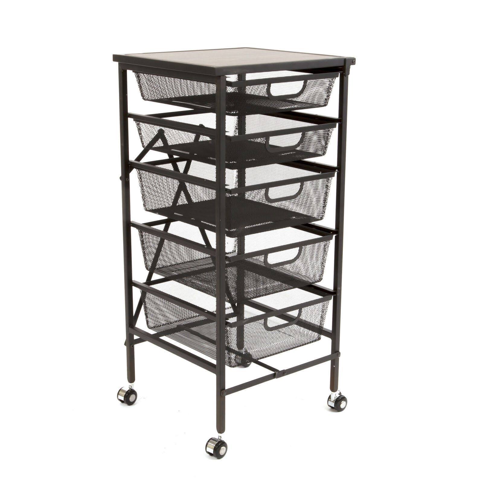 Origami Wheeled Folding Steel 5 Drawer Mesh Storage Kitchen Cart Wood Top Black - Megean