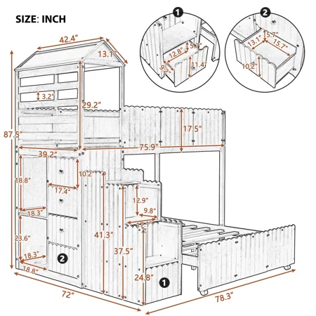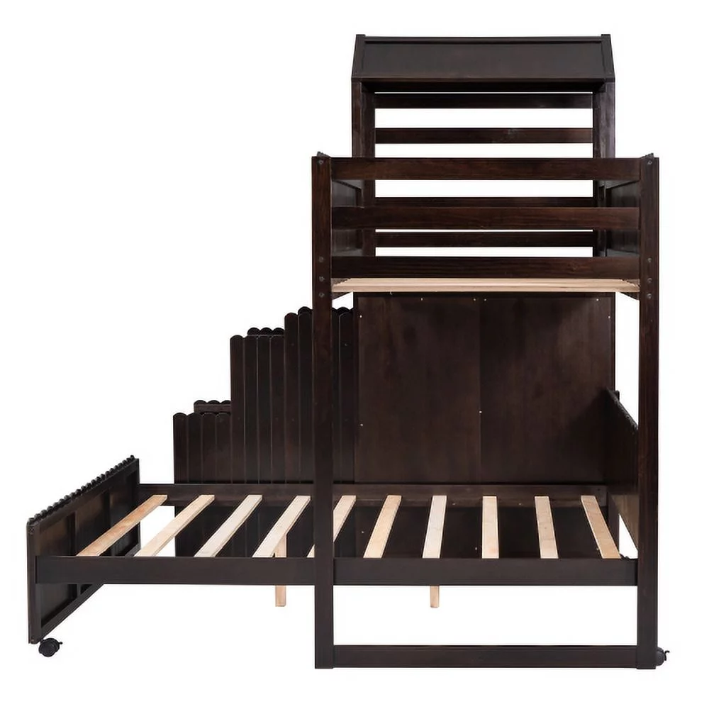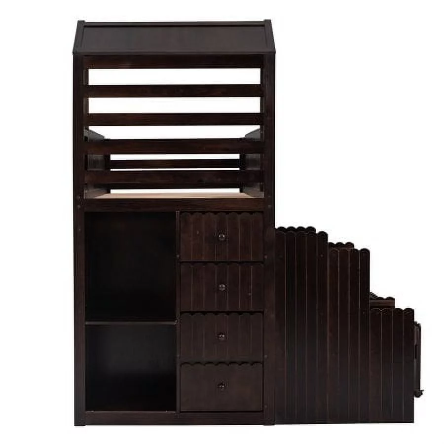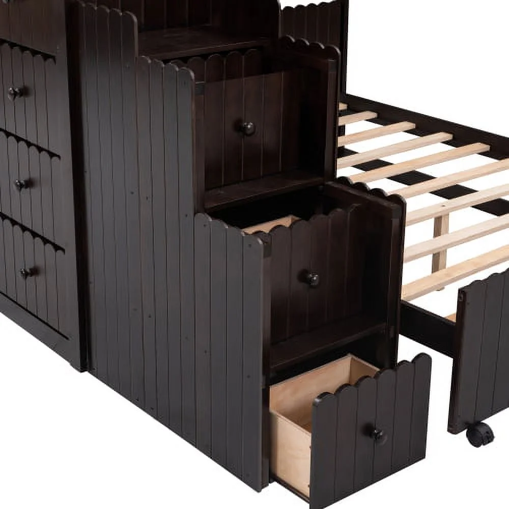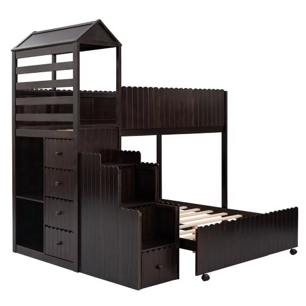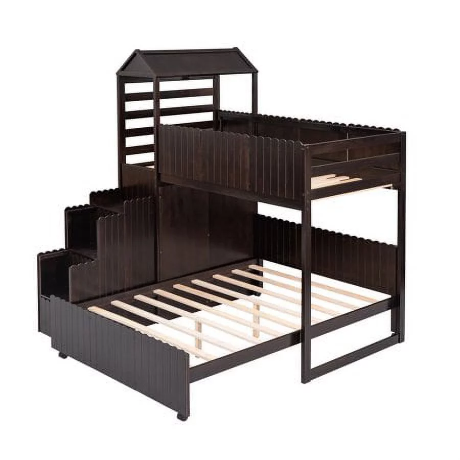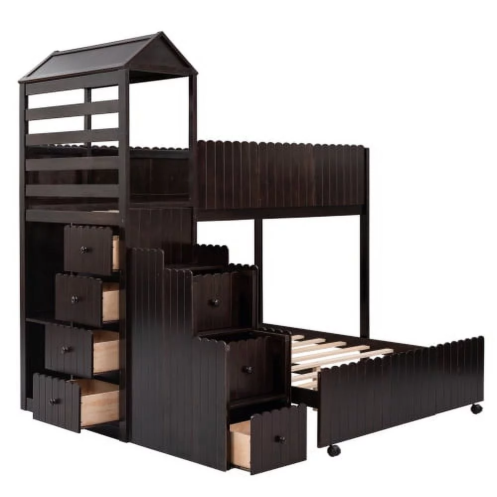 CHURANTY Wood Twin Over Full Loft Bed Stairway House Bed with Stairs and Drawers,Full-Length Guardrail Fence and Roof for Boys Girls No Box Spring Needed, Espresso - Curated Treasures Market