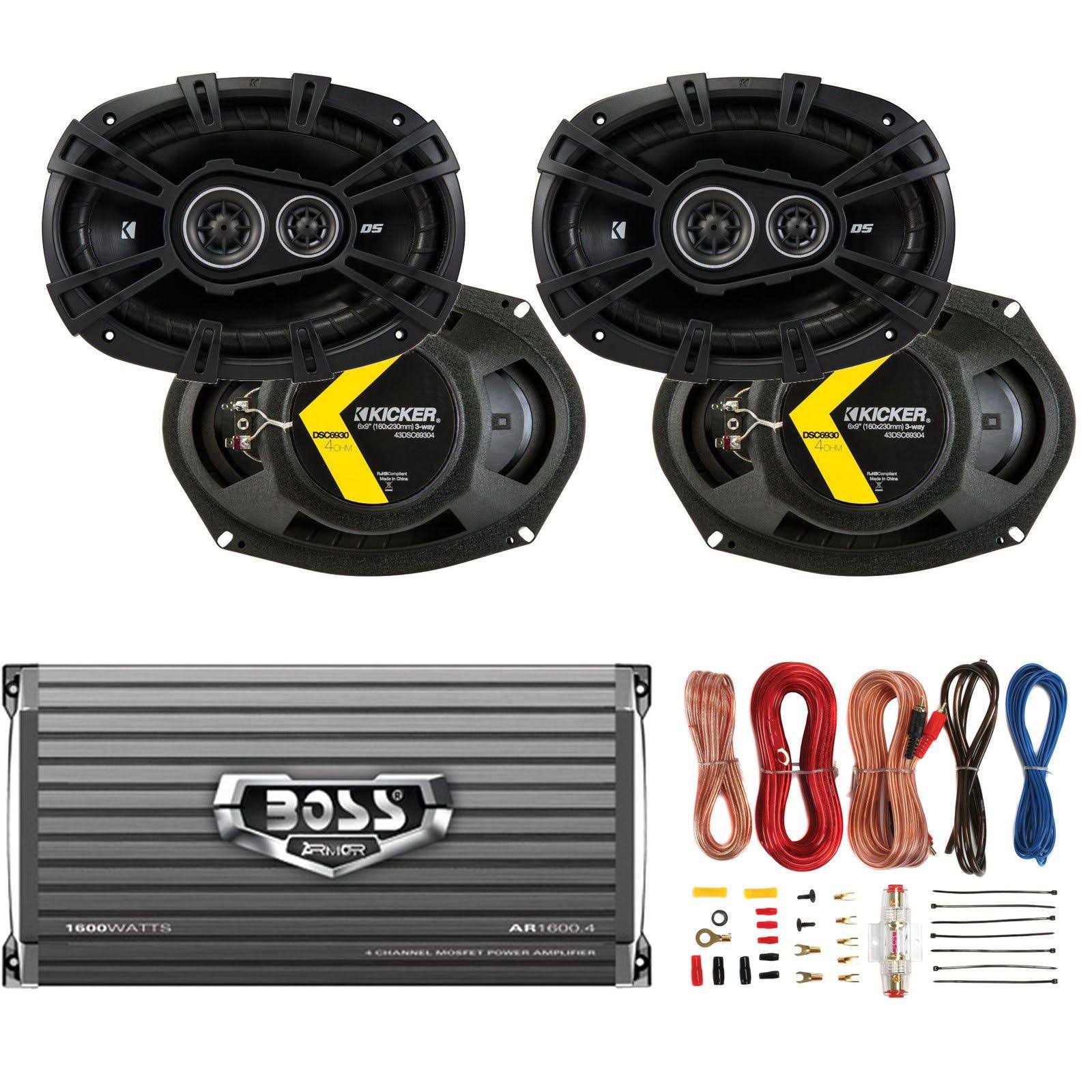 Kicker 6x9" 360W Car Speakers 4 Pack + Boss 1600W Amplifier + 8 Gauge WIRING - Megean
