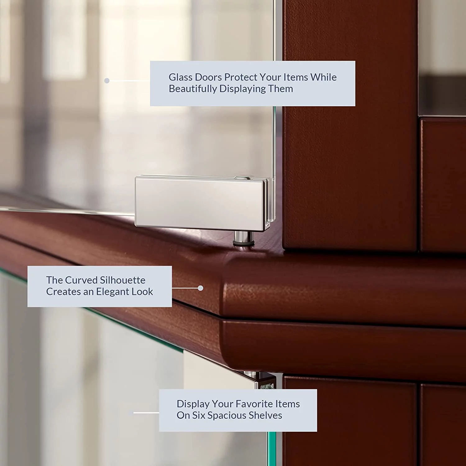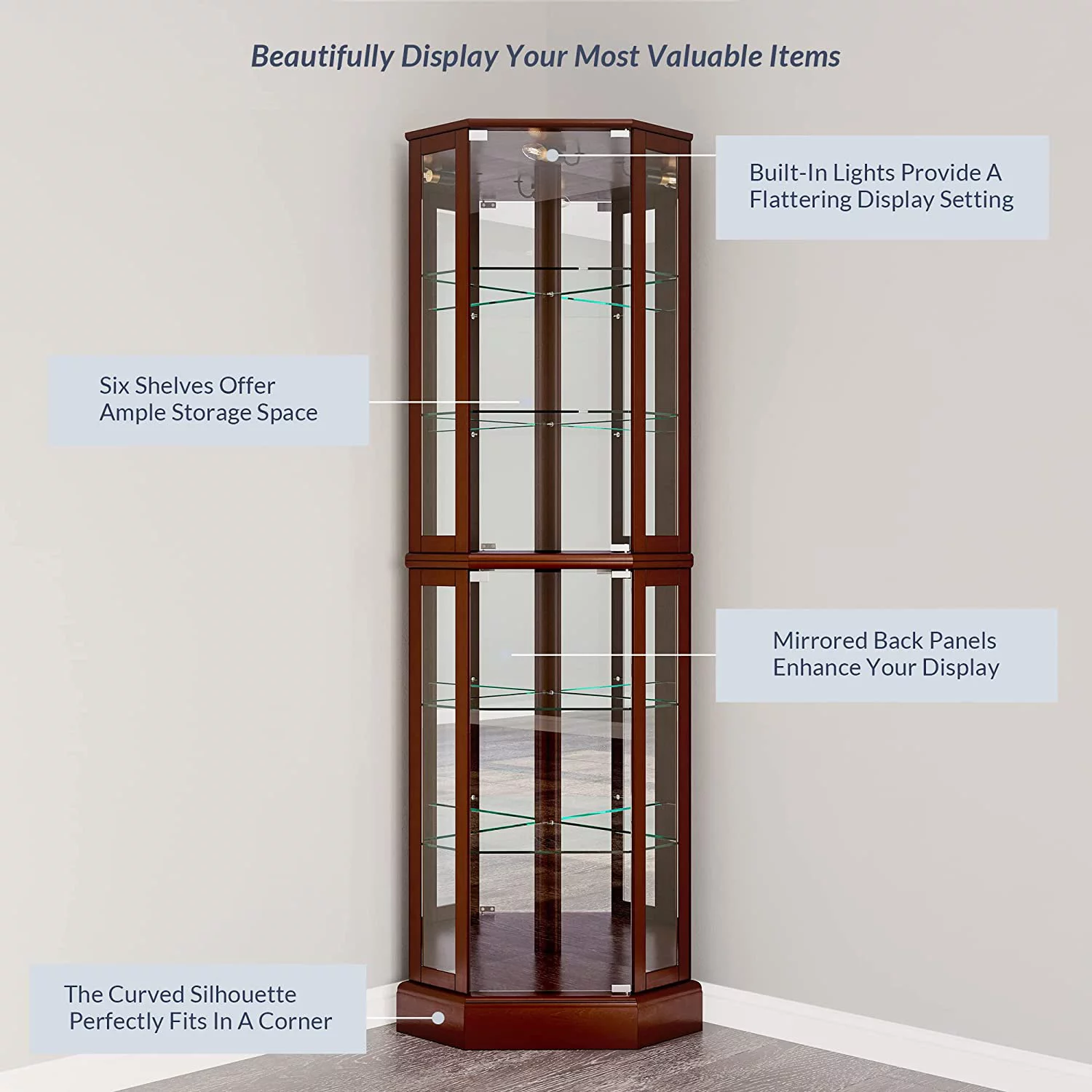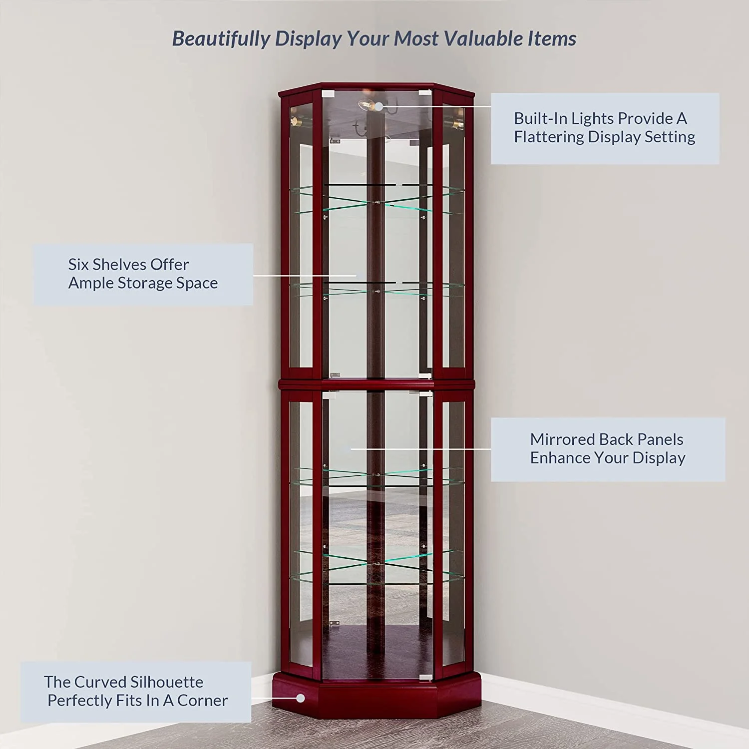 Lighted Corner Display Curio Cabinet Wooden Curved Shelving Unit with Tempered Glass Door, Bar and Liquor Storage Area with 6 Shelves - Ashfield (Cherry) - Curated Treasures Market