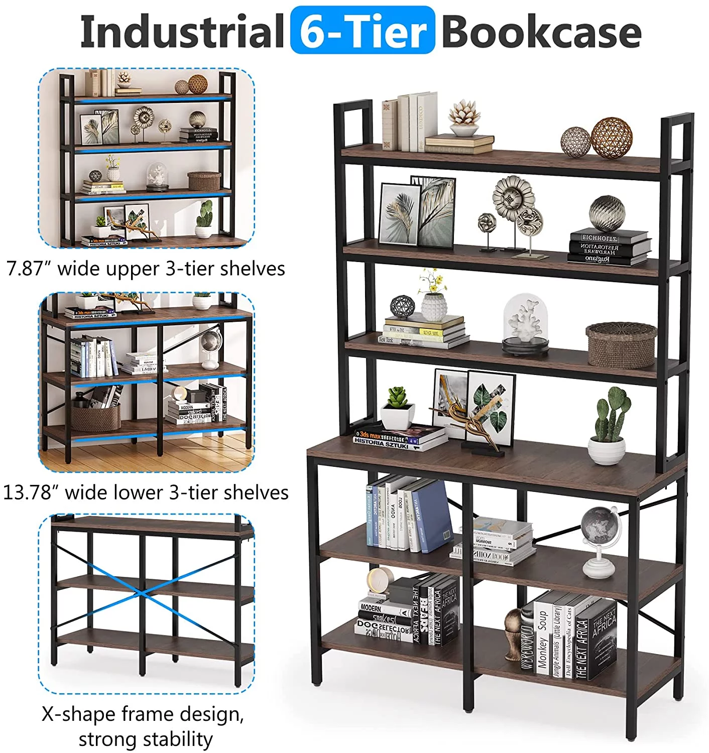 Tribesigns 6-Tier Bookshelf,Industrial Bookcase with Open Shelf,6 Shelf Storage Rack with X-Shaped Frame - Curated Treasures Market