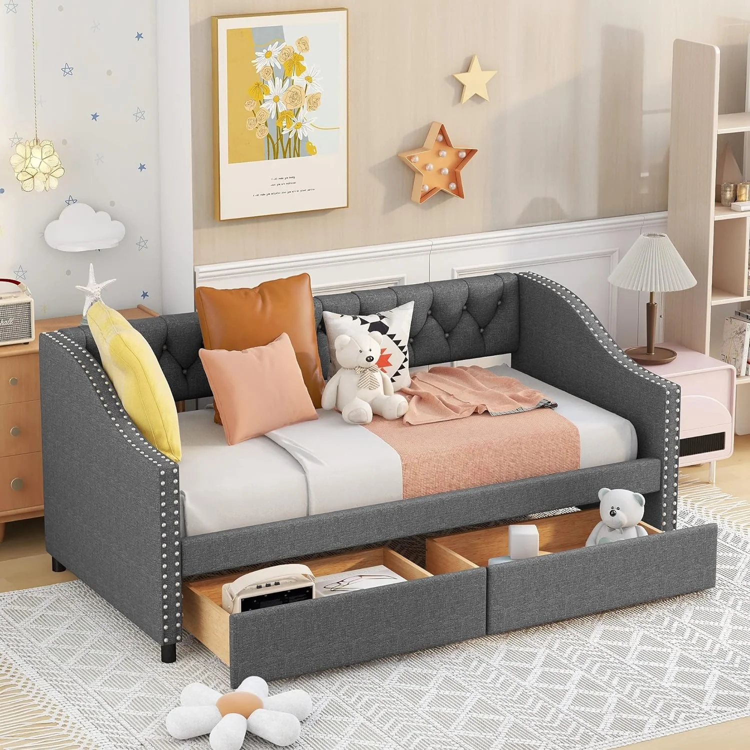 Upholstered Daybed With Storage. Wooden Daybed Frame With 2 Drawers Underneath. Tufted Sofa Bed Daybed With Wood Slat Support For Bedroom.Living Room.Grey