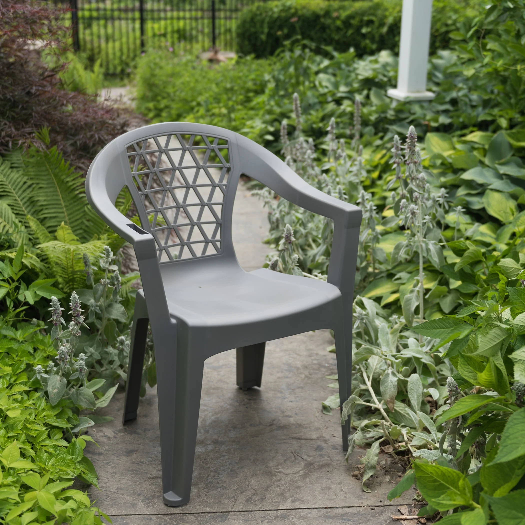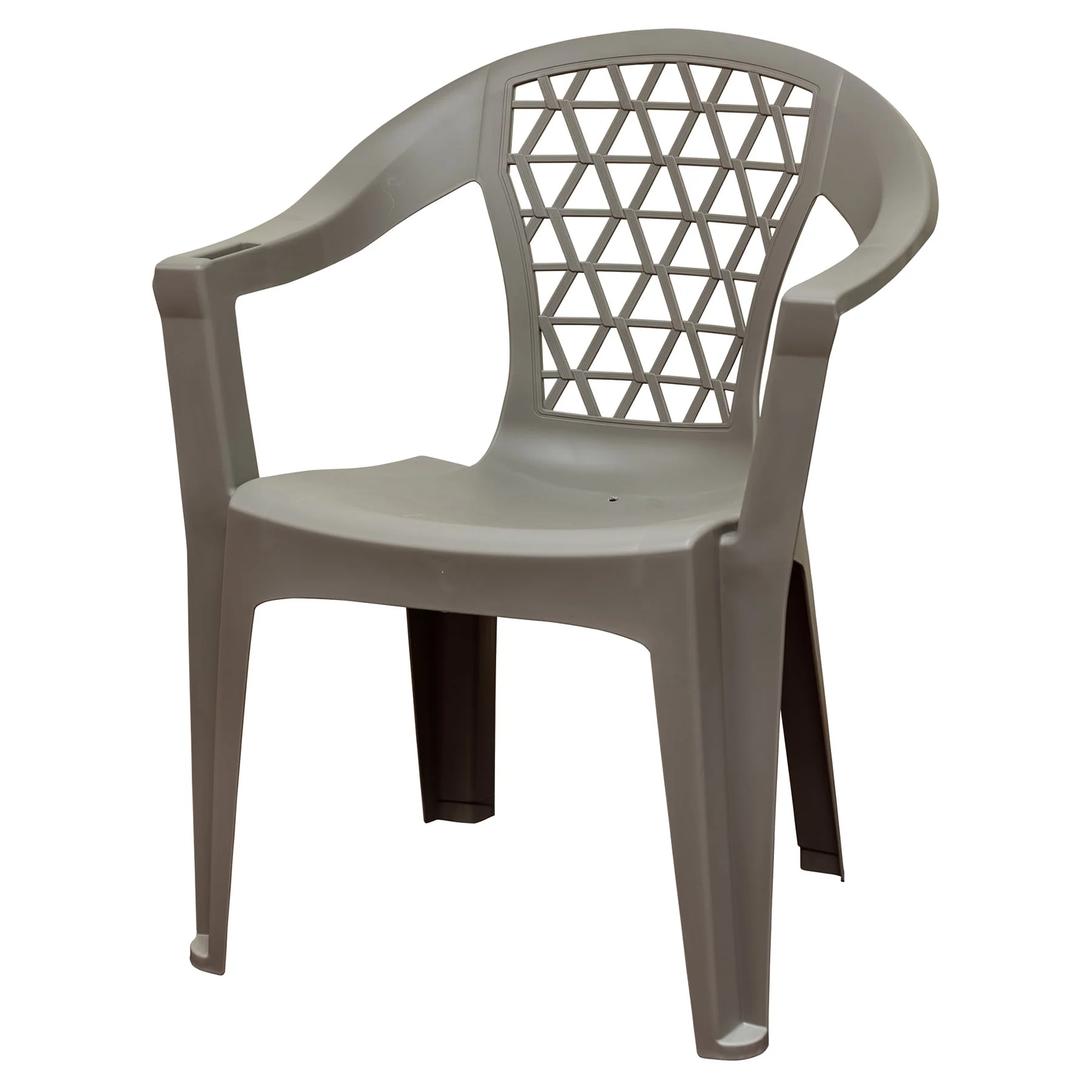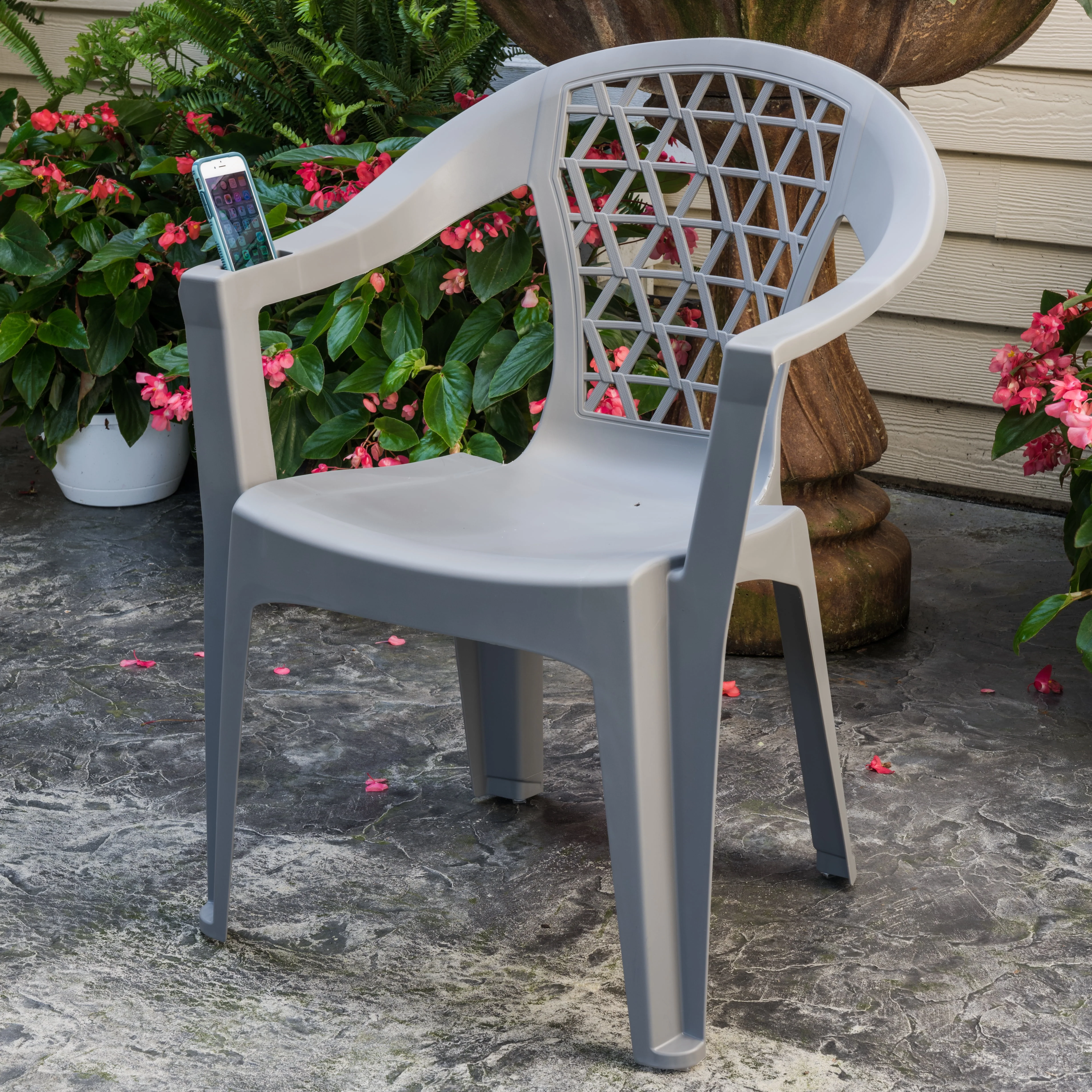 Adams Penza Outdoor Resin Stack Chair with Phone Holder, Plastic Patio Furniture, Gray