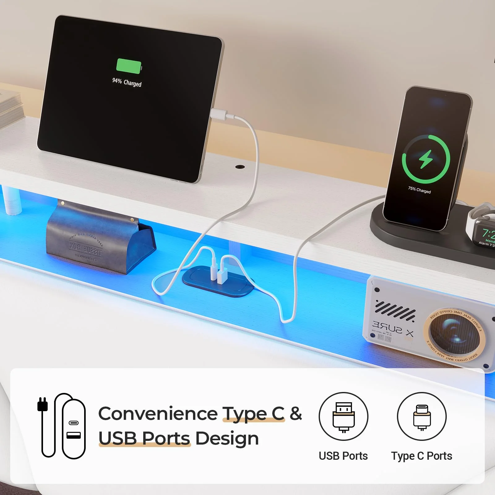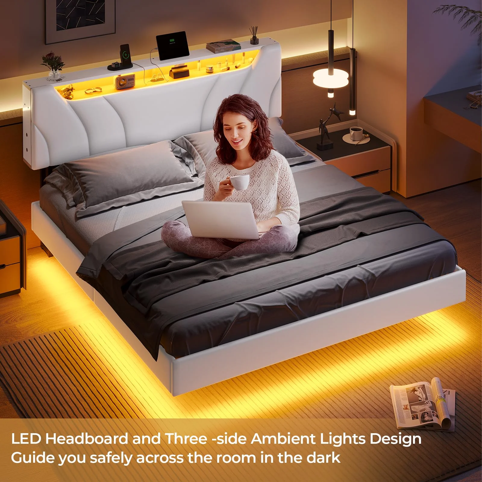 Afuhokles Queen Floating Bed Frame with Storage Headboard and LED Lights, Type-C and USB Port Upholstered Platform Bed, Black