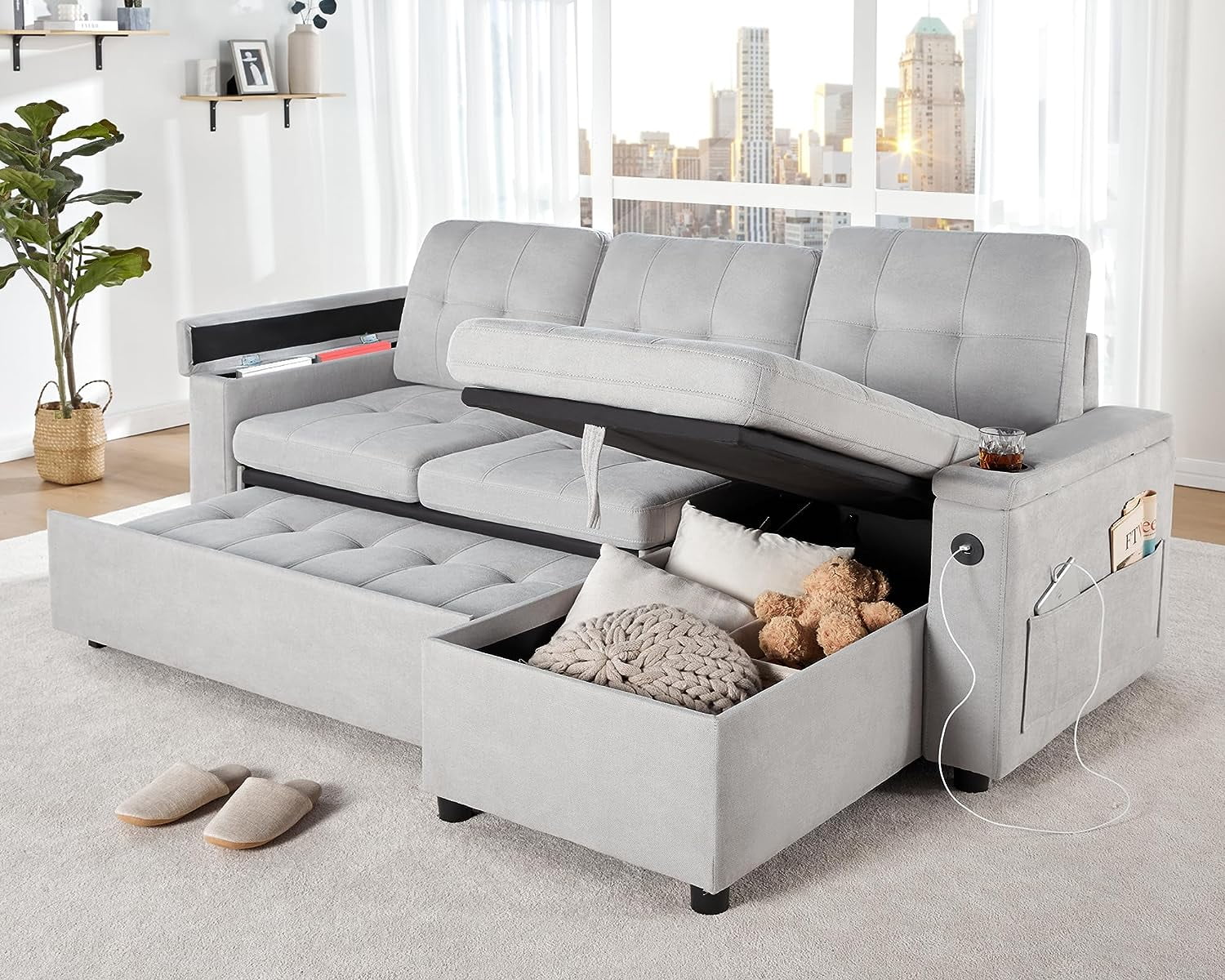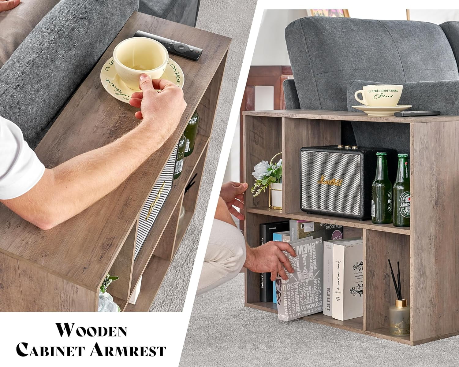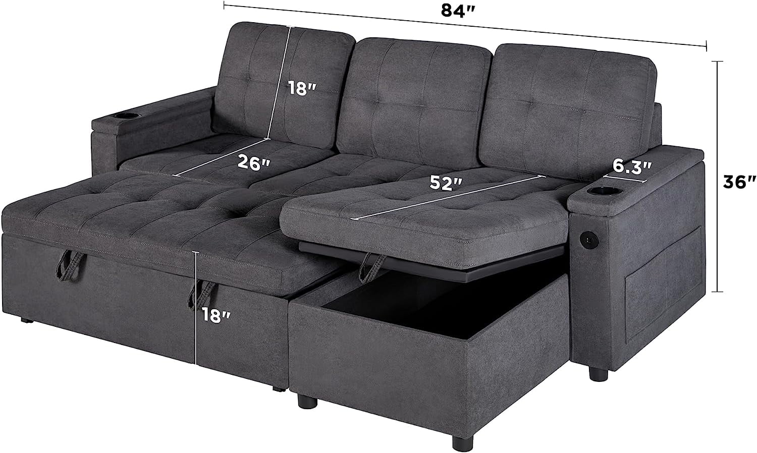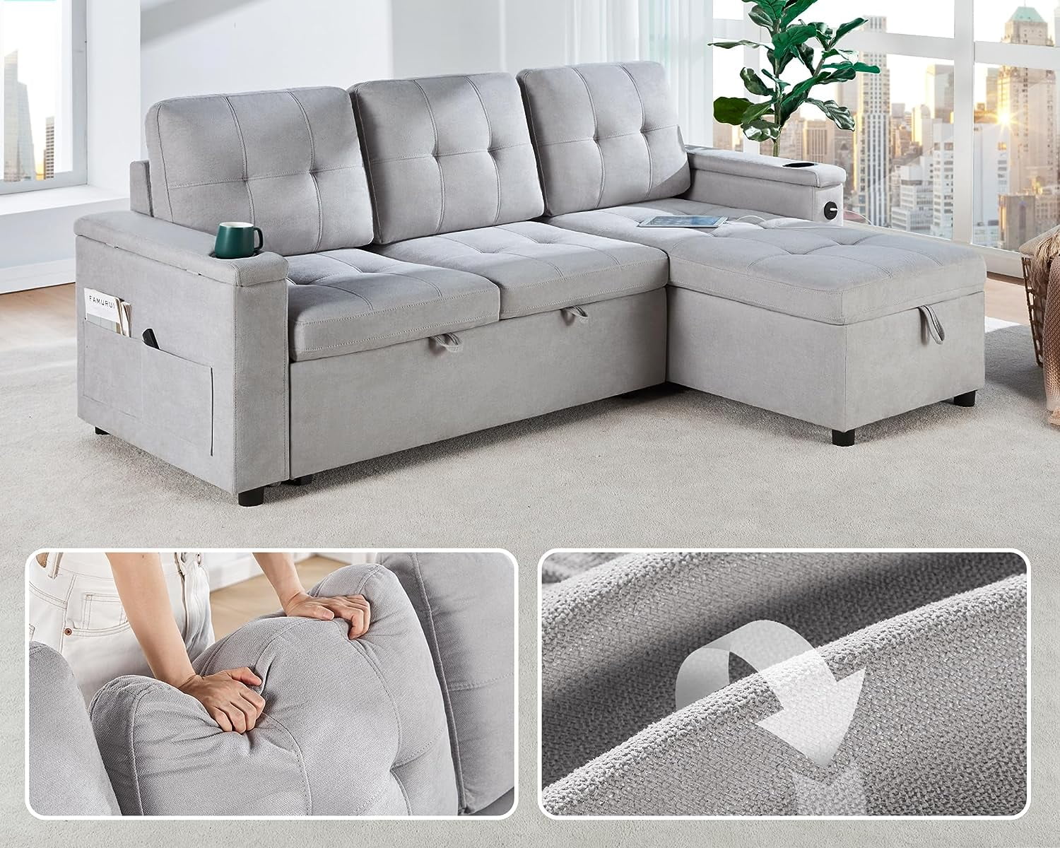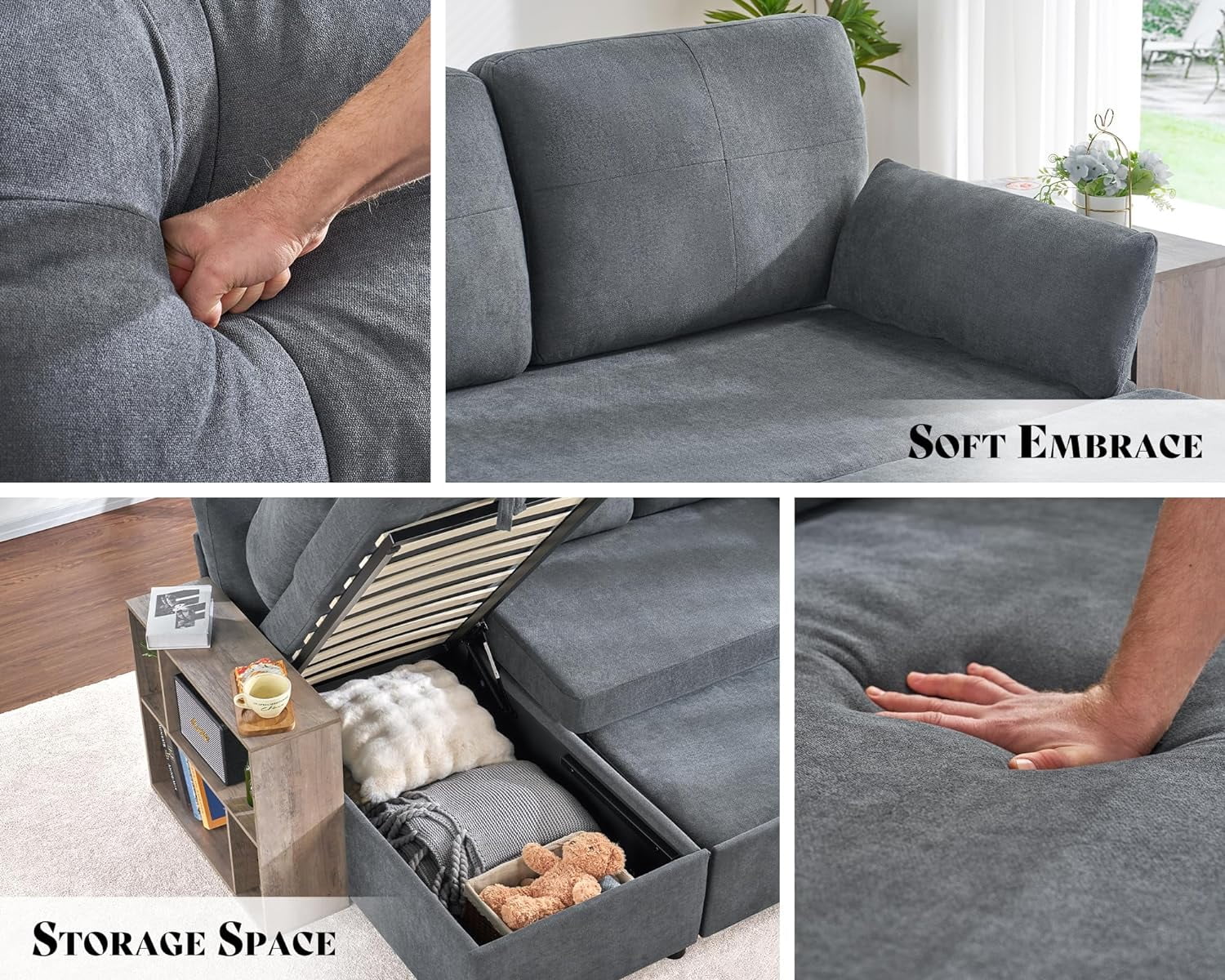 PaPaJet Sleeper Sofa with 2 Cabinet Armrest, L Shaped Couch with Storage Chaise-Grey Couch