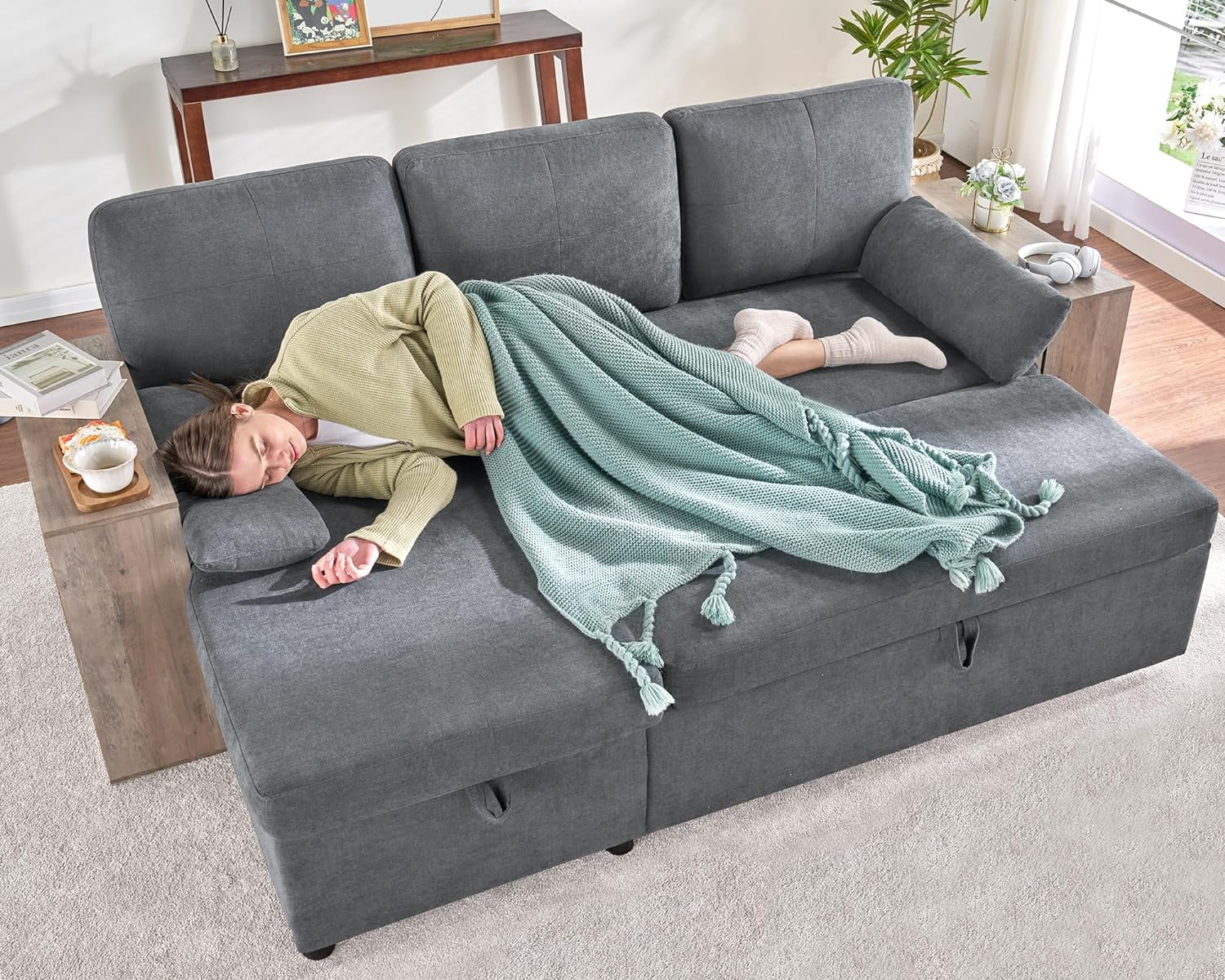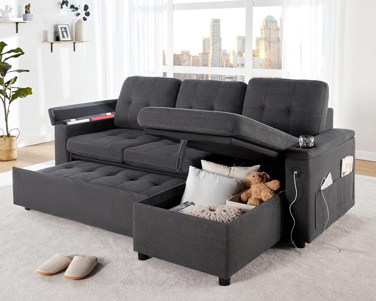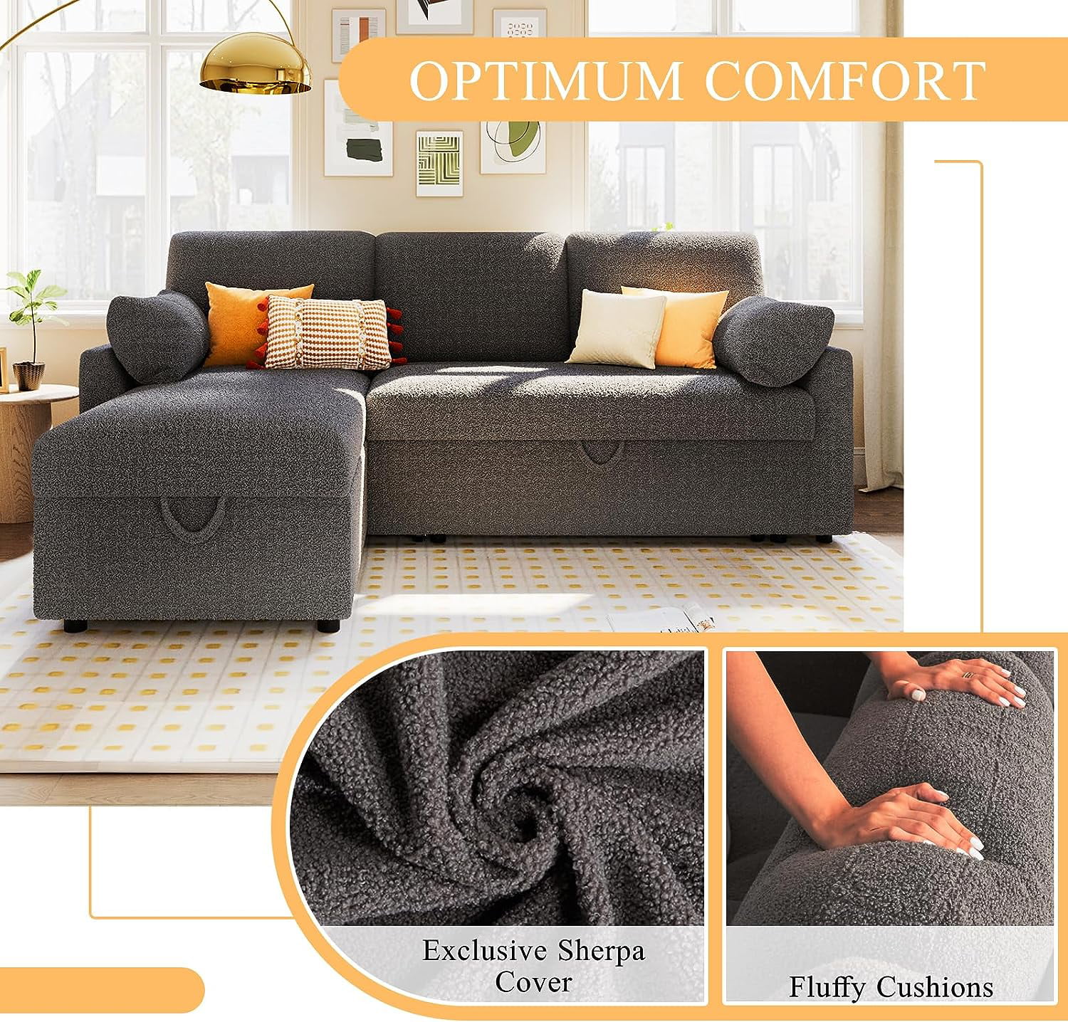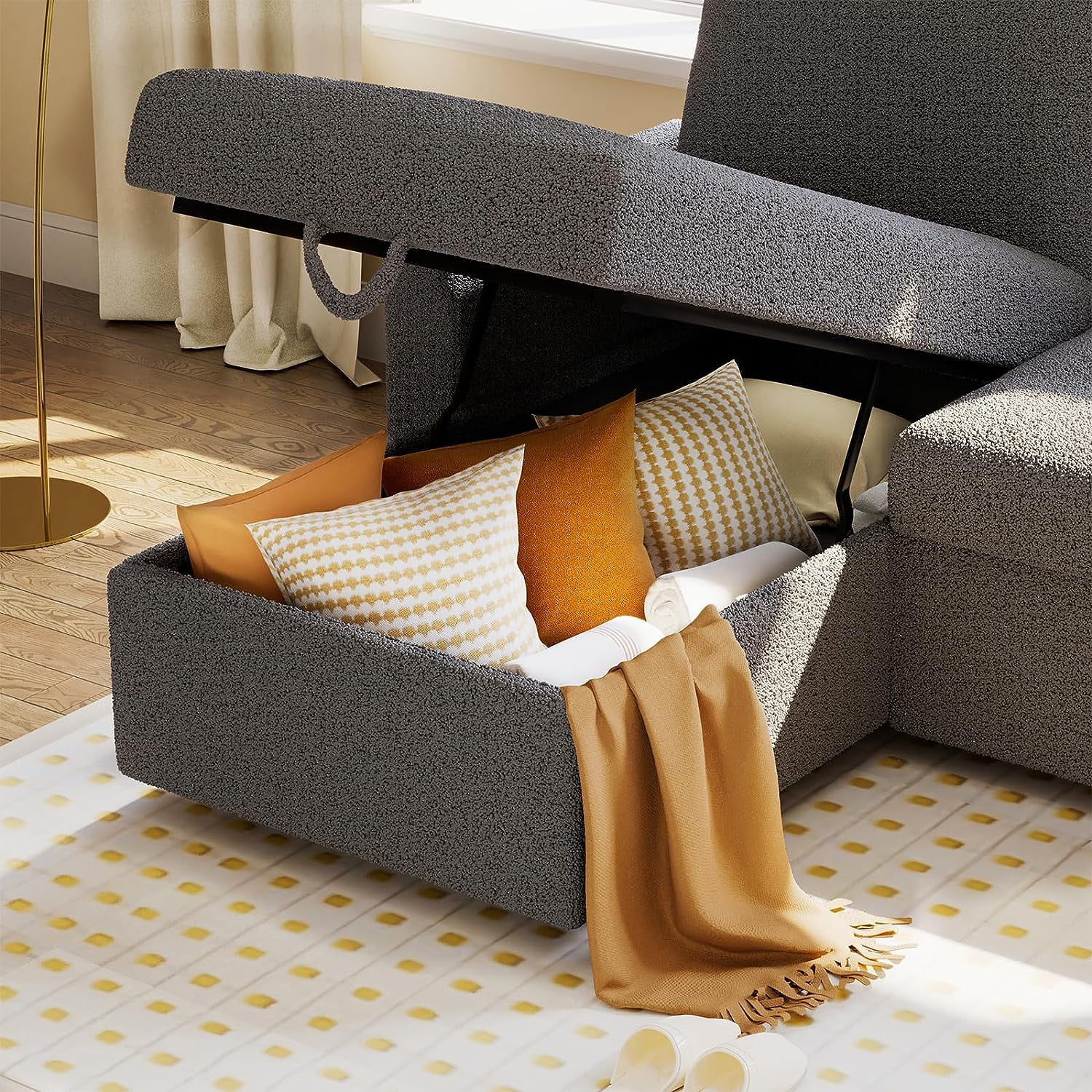 PaPaJet Sleeper Sofa with 2 Cabinet Armrest, L Shaped Couch with Storage Chaise-Grey Couch