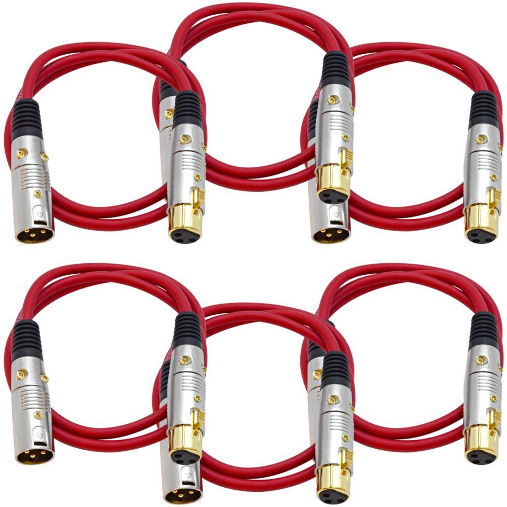 Seismic Audio - SAPGX-3Red-6Pack - 6 Pack of 3 Foot Gold Plated Red XLR Mic Microphone Patch Cable Cord Balanced - Megean